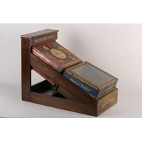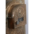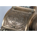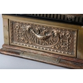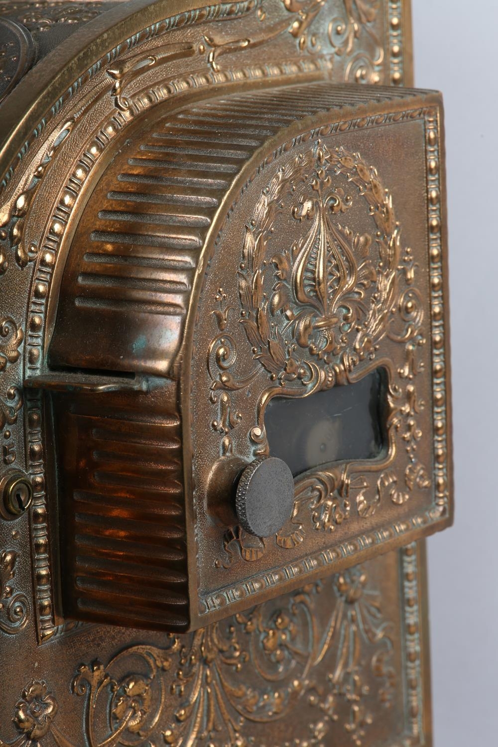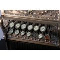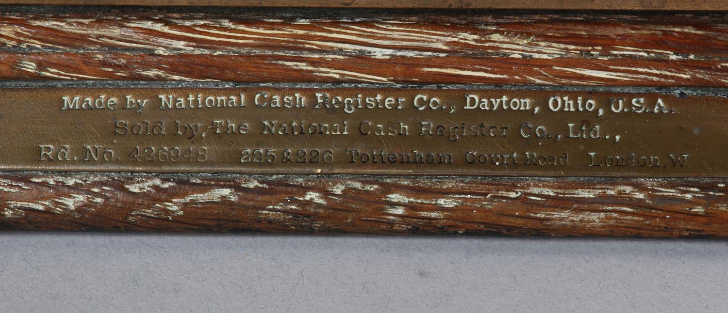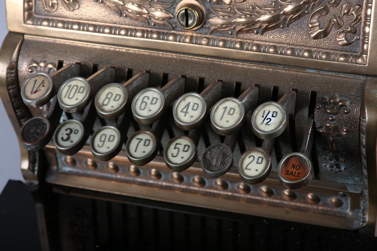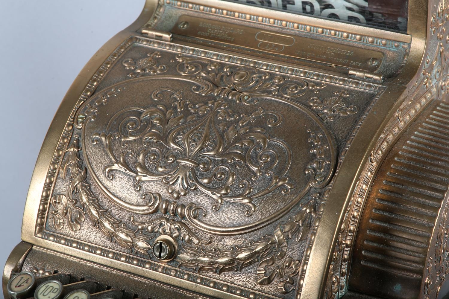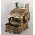 AN UNUSUALLY SMALL NATIONAL CASH REGISTER CO., DAYTON OHIO USA, brass cash register cast with shield shape cartouche, swags, pendants and leaf curls, a glass number viewer above the hinged lid with internal key and number dials, the front with price levers, black surface above a small change drawer, 31cm wide x 41cm deep x 43cm high