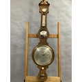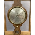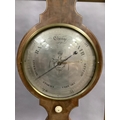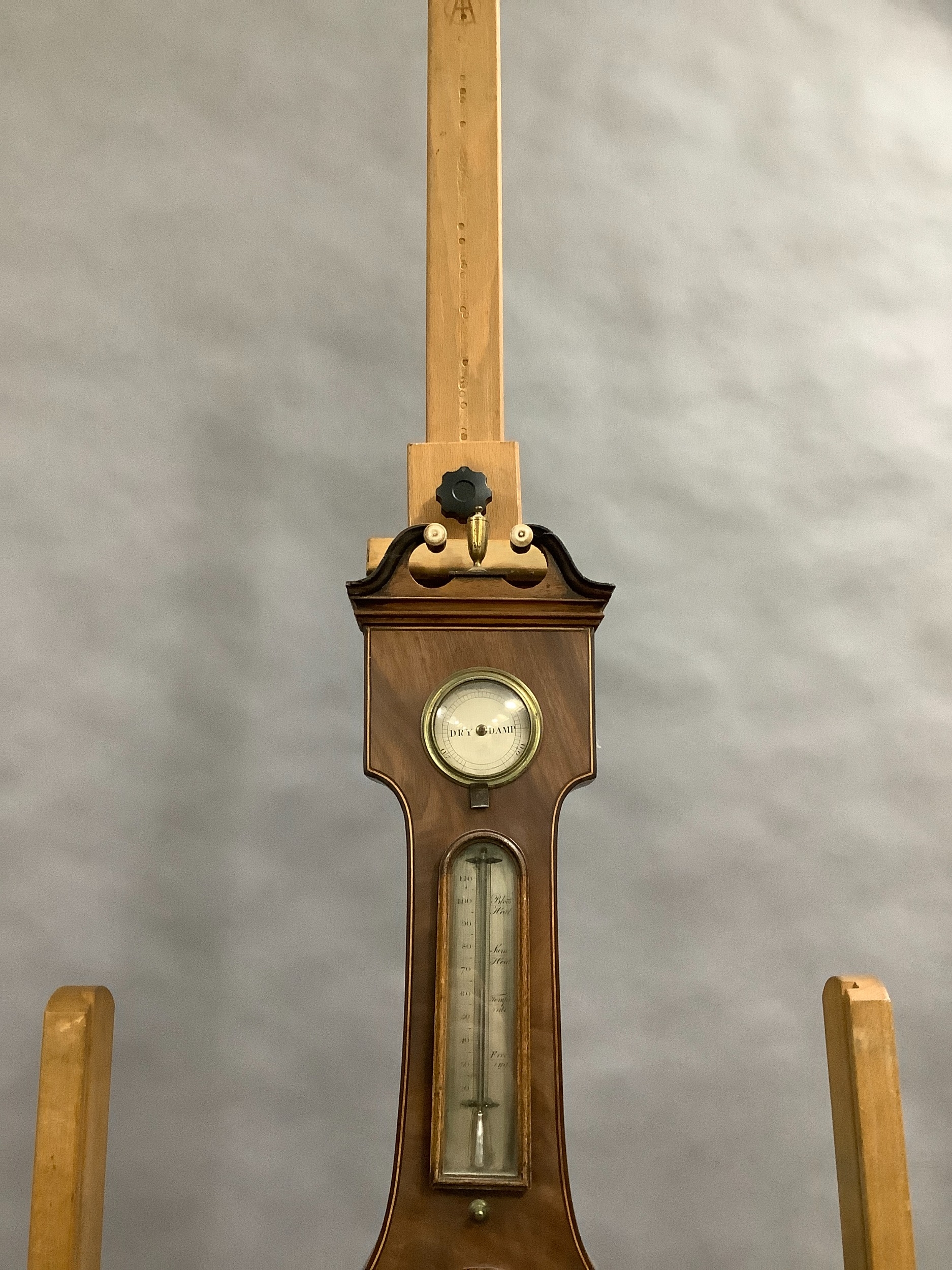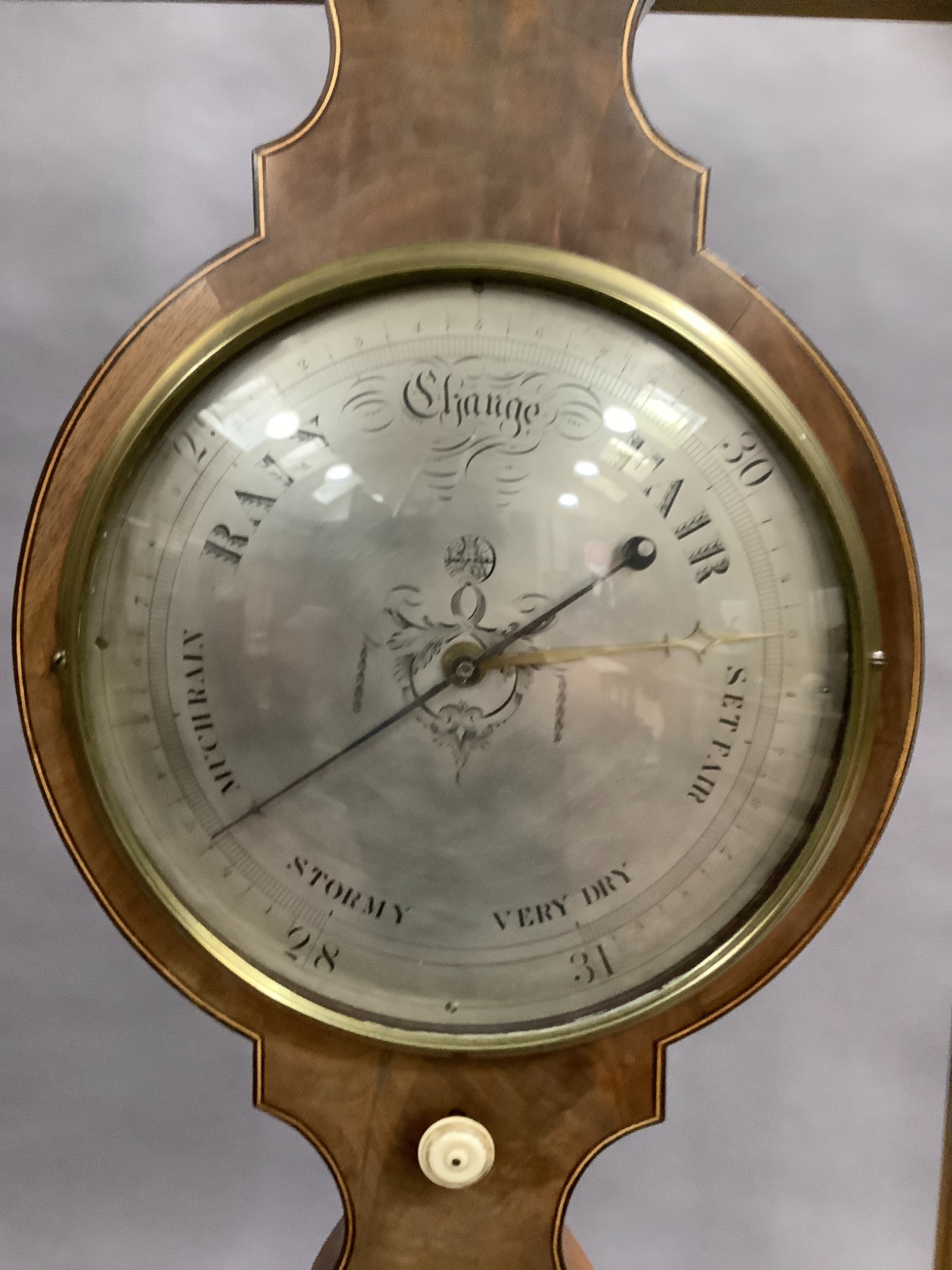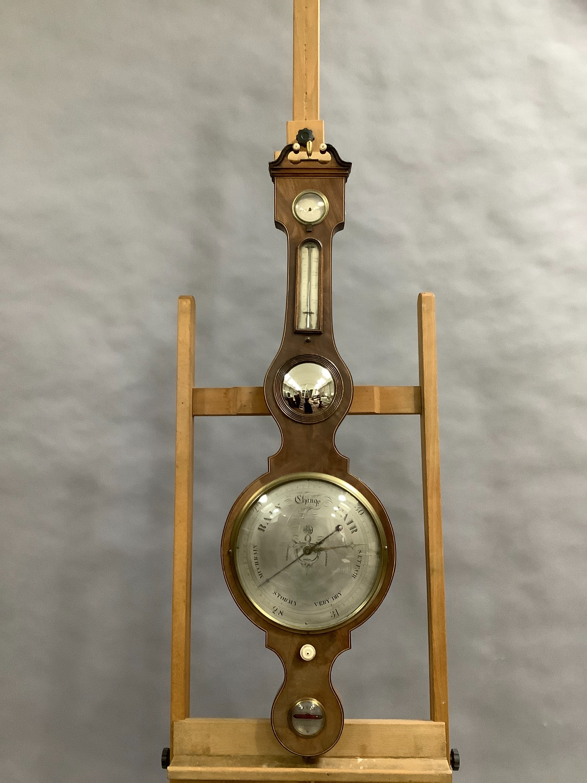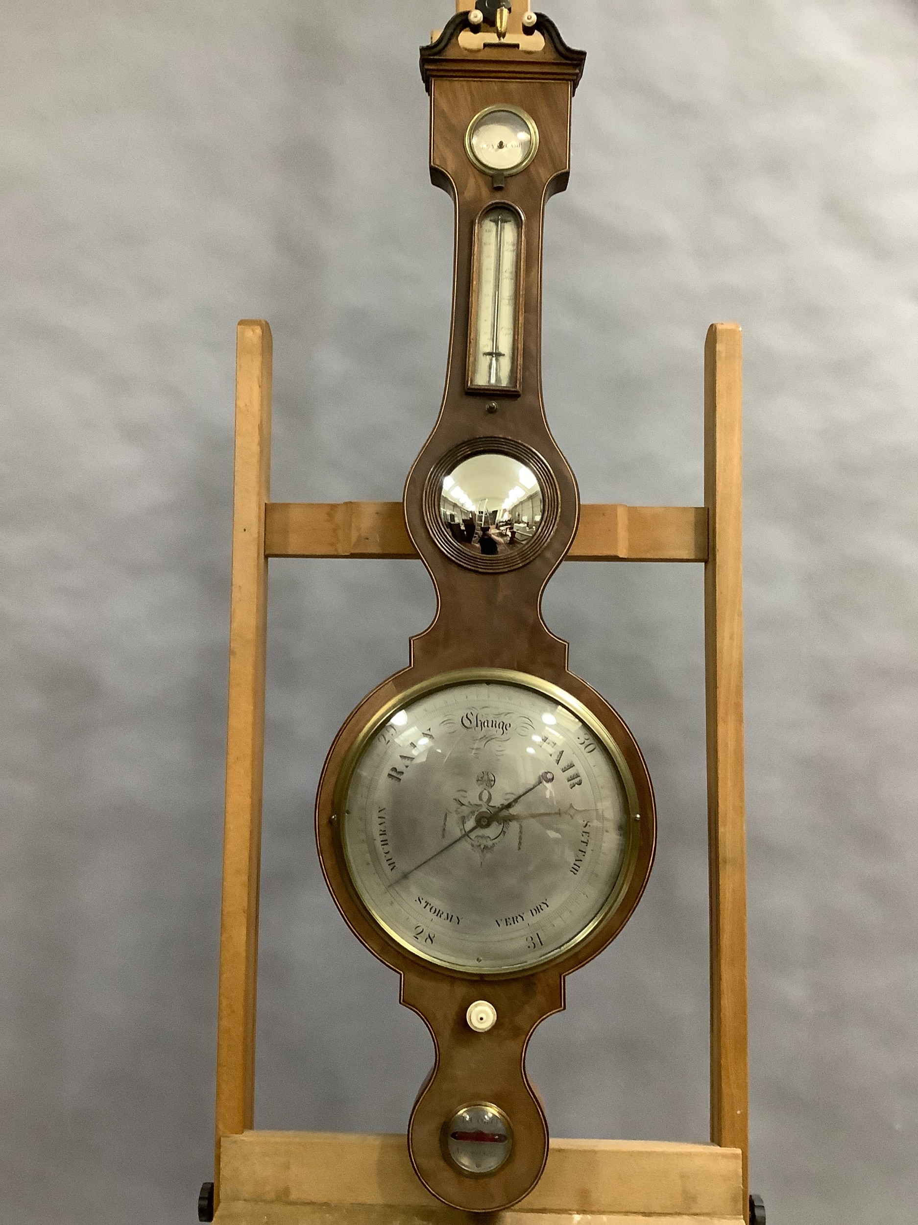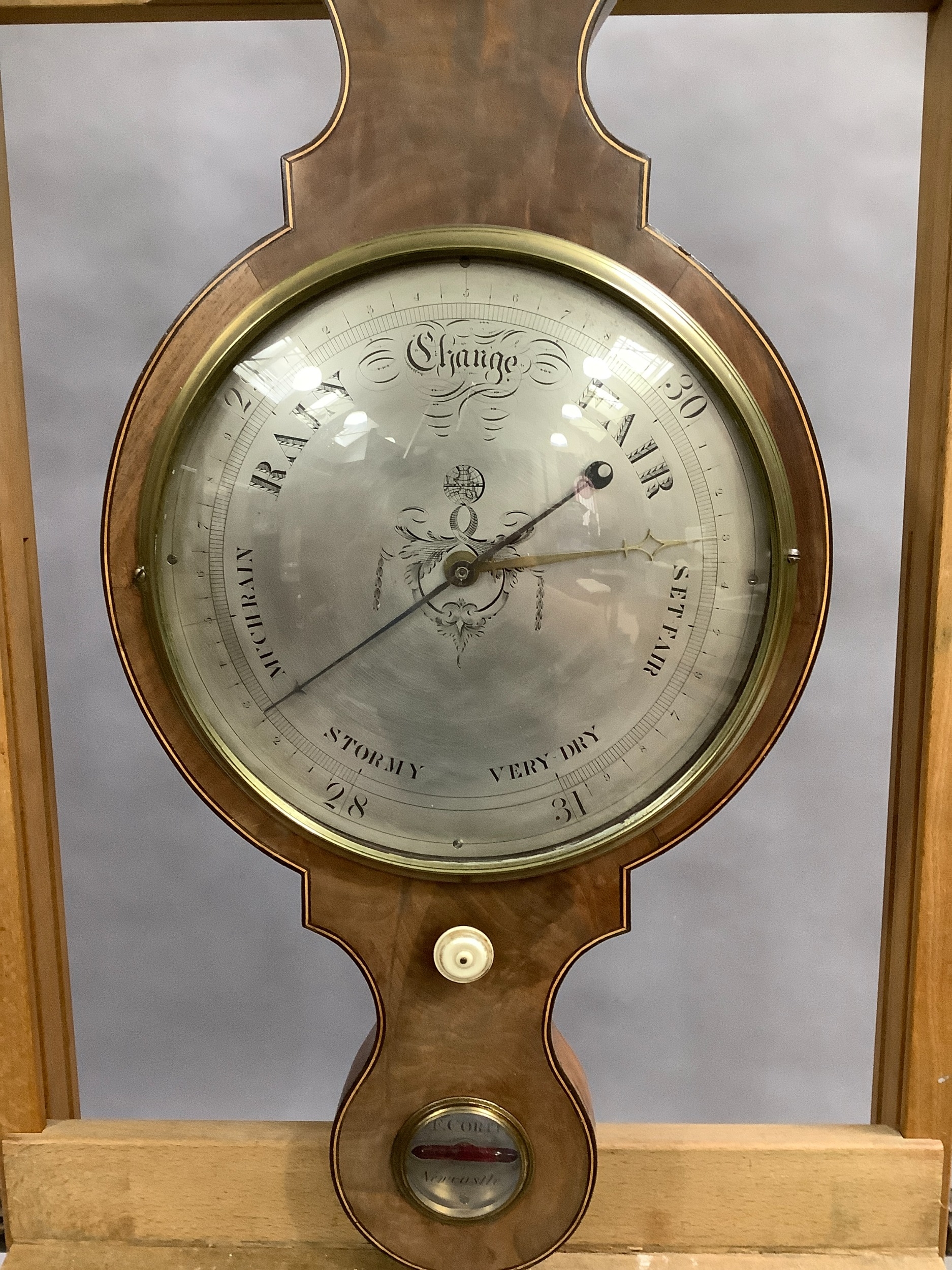 AN EARLY 19TH CENTURY MAHOGANY BANJO BAROMETER-THERMOMETER, having a broken arch pediment with gilt metal urn finial and ivory roundels, above a silvered scale, convex mirror, dial and level signed F Corti Newcastle, boxwood and ebony inlaid stringing, 109cm high, ivory declaration no. YLL1CX1W