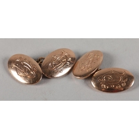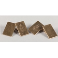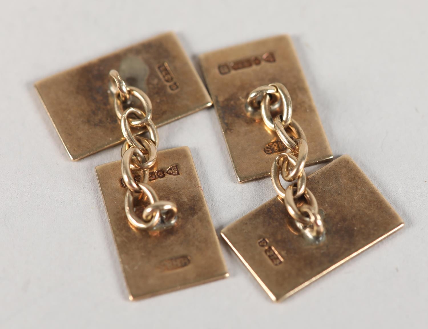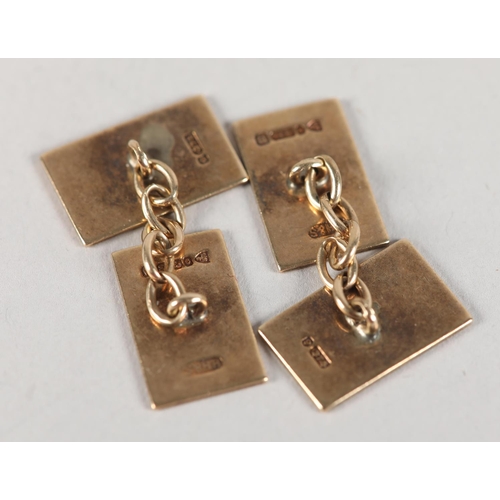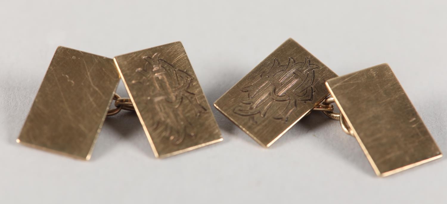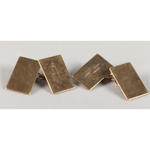A PAIR OF CUFFLINKS in 9ct gold, each monogramed PJR to one rectangular face joined to a plain polished face by trace link, approximate weight 6.5g