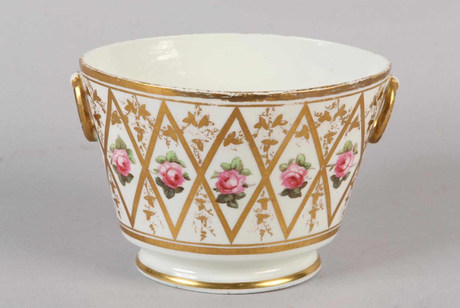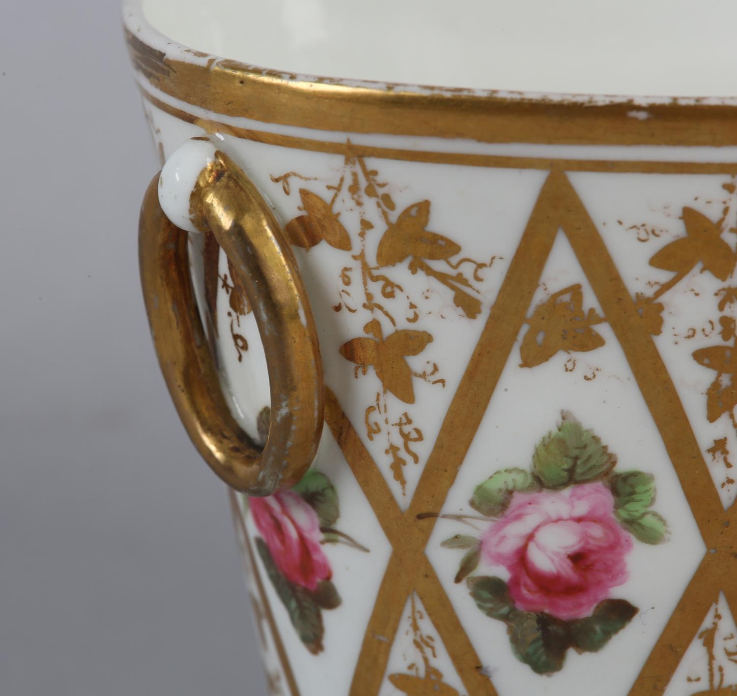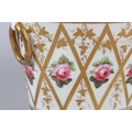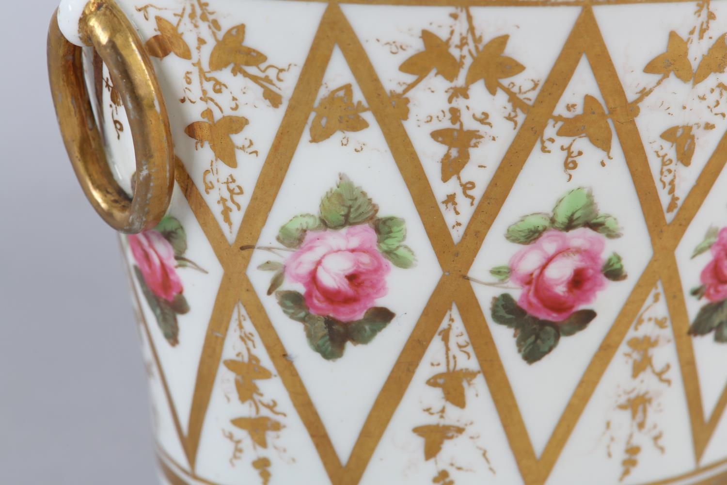 A DERBY PORCELAIN SUCRIER painted by William Billingsley c.1785-1800, with individual roses in a gilt diamond trellis pattern, without cover, puce printed mark, pattern no. 626, 13.5cm x 10cm x 9.5cm high