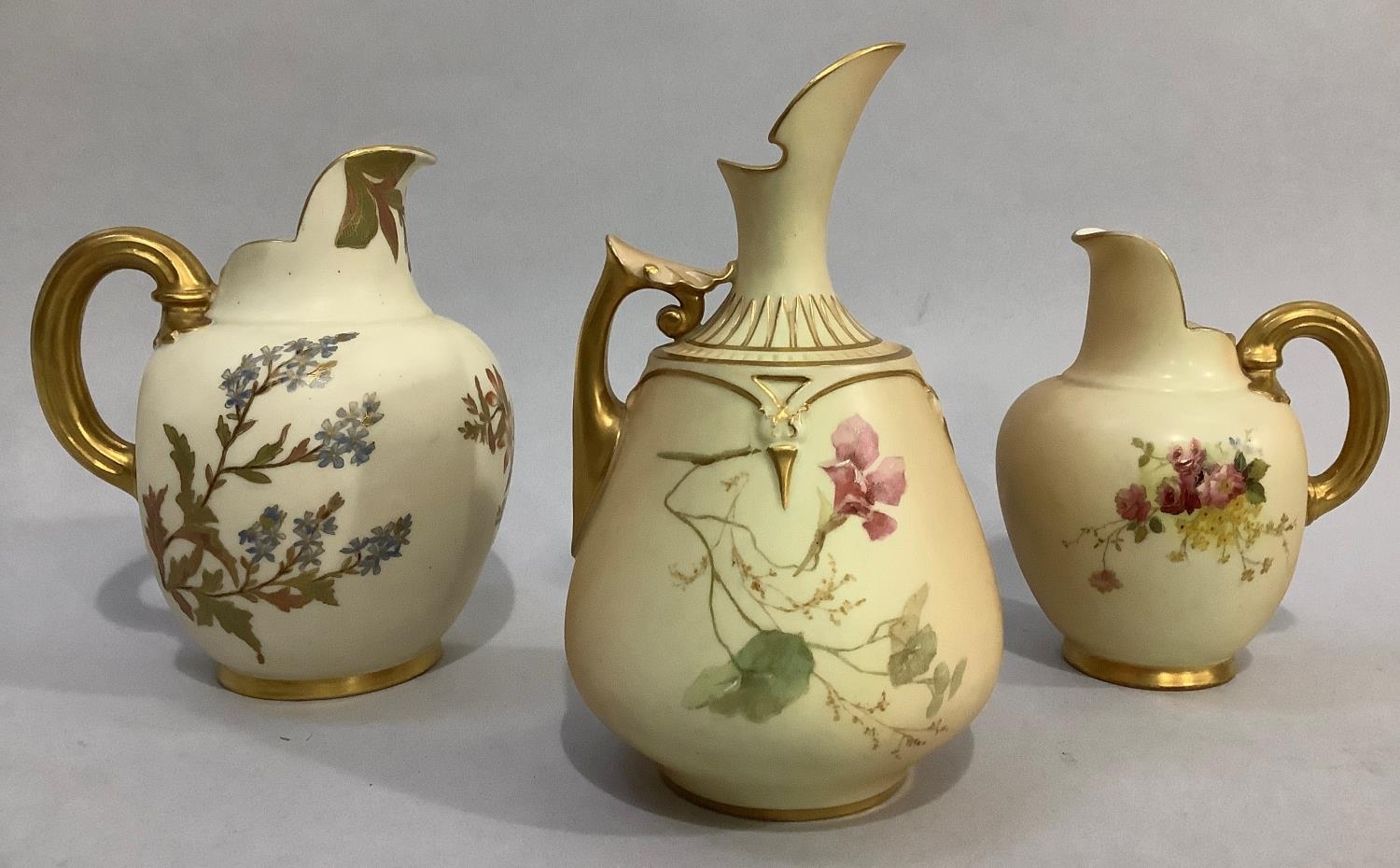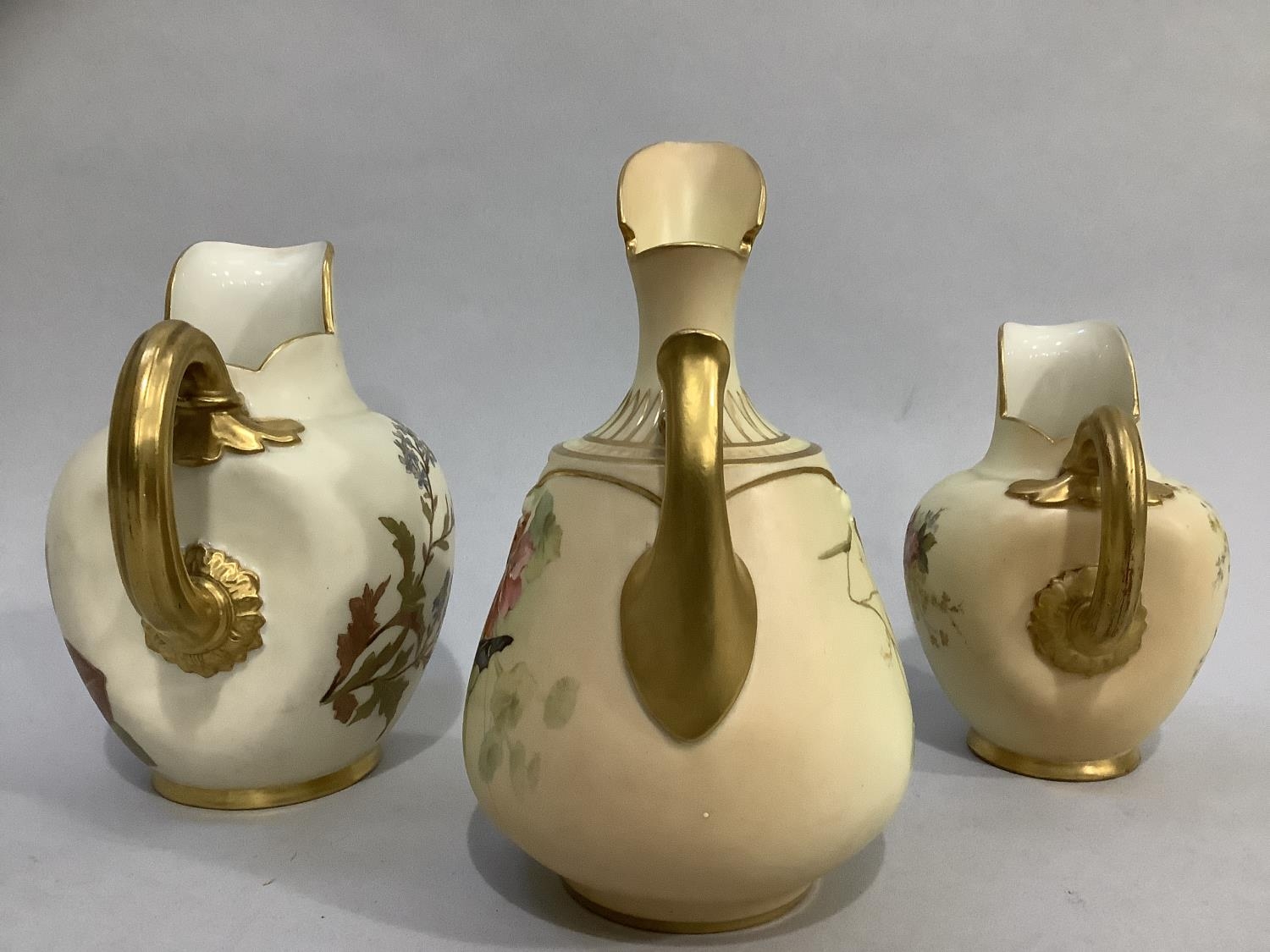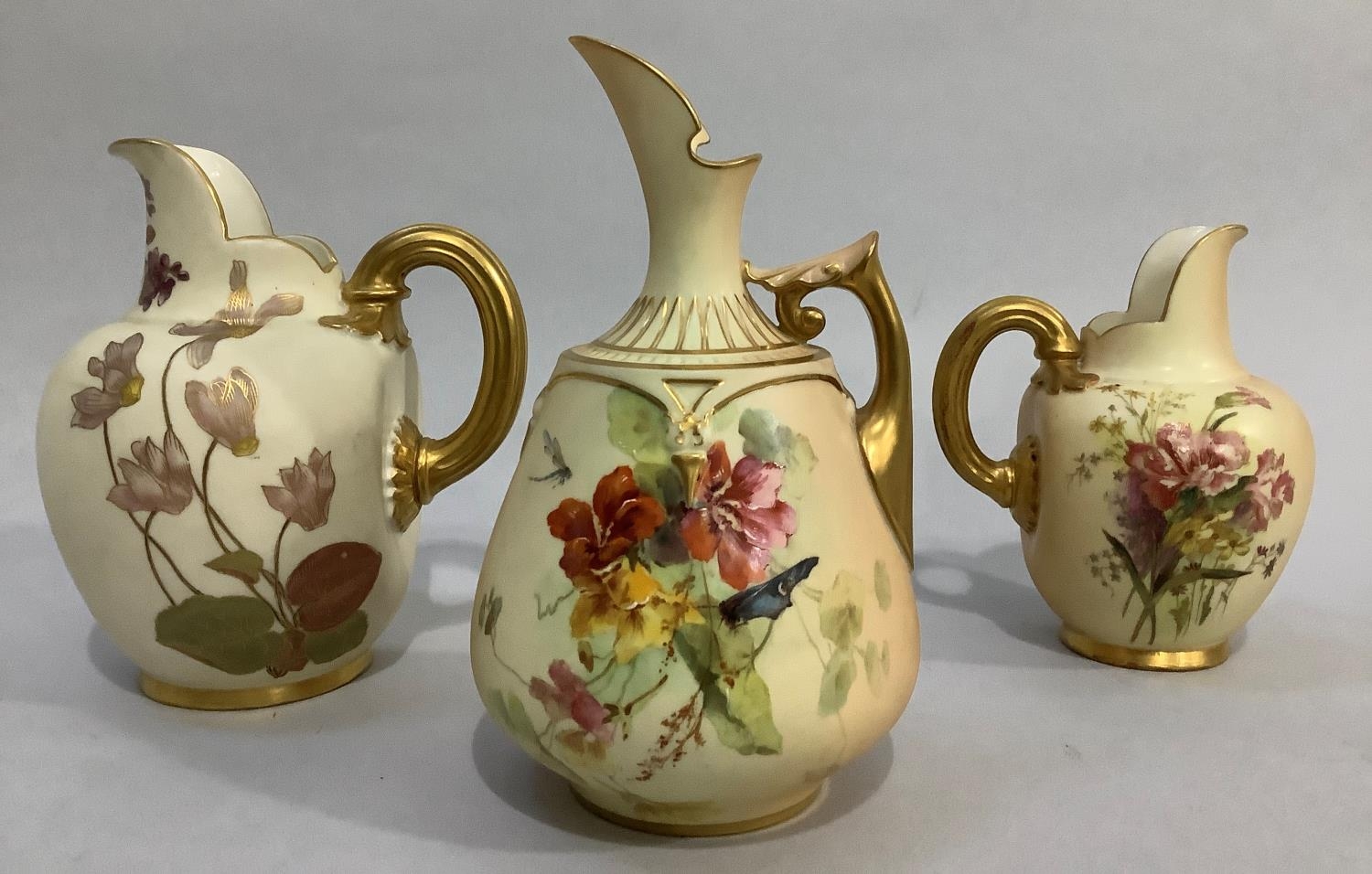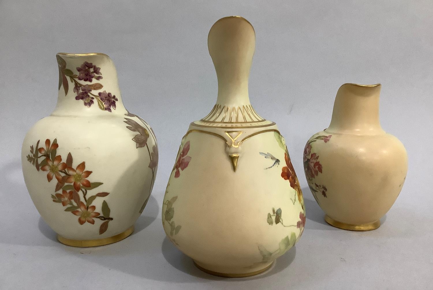 A ROYAL WORCESTER BLUSH IVORY JUG painted with butterfly, dragonfly and flowers, leaf capped handle, shape no. 1668, printed mark for 1895 17.5cm high together with two flat back jugs shape no 1094, 15.5cm and 13cm high printed marks for 1892 and 1906 (3)