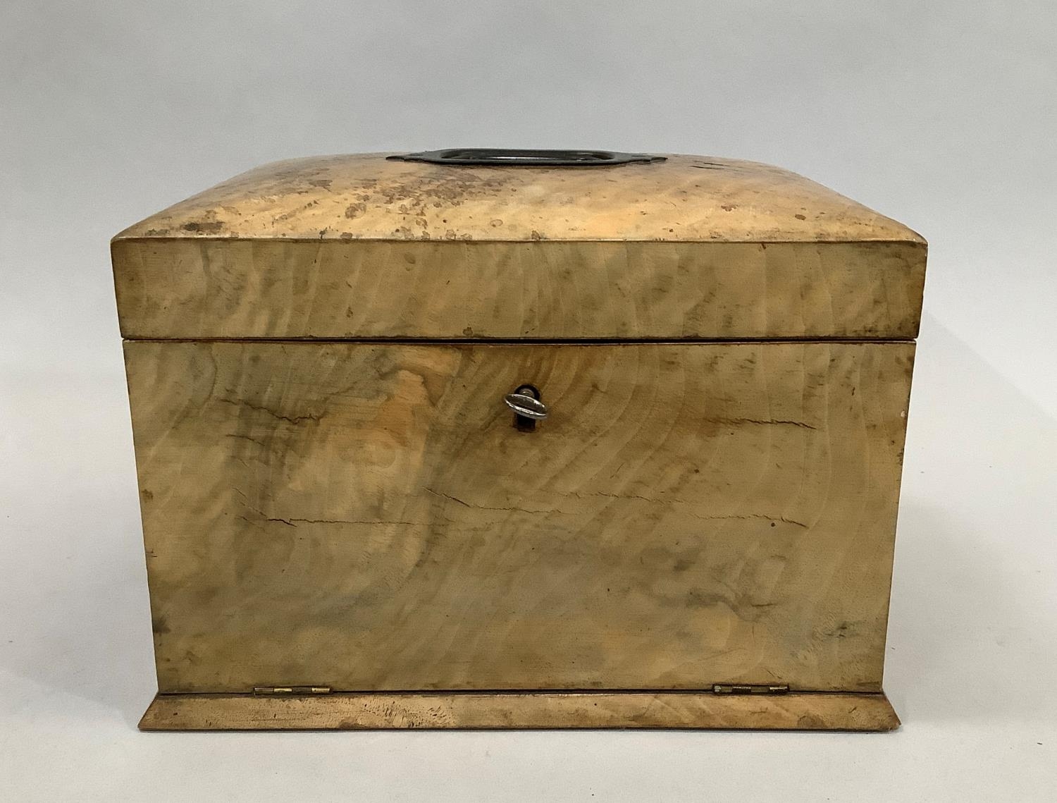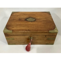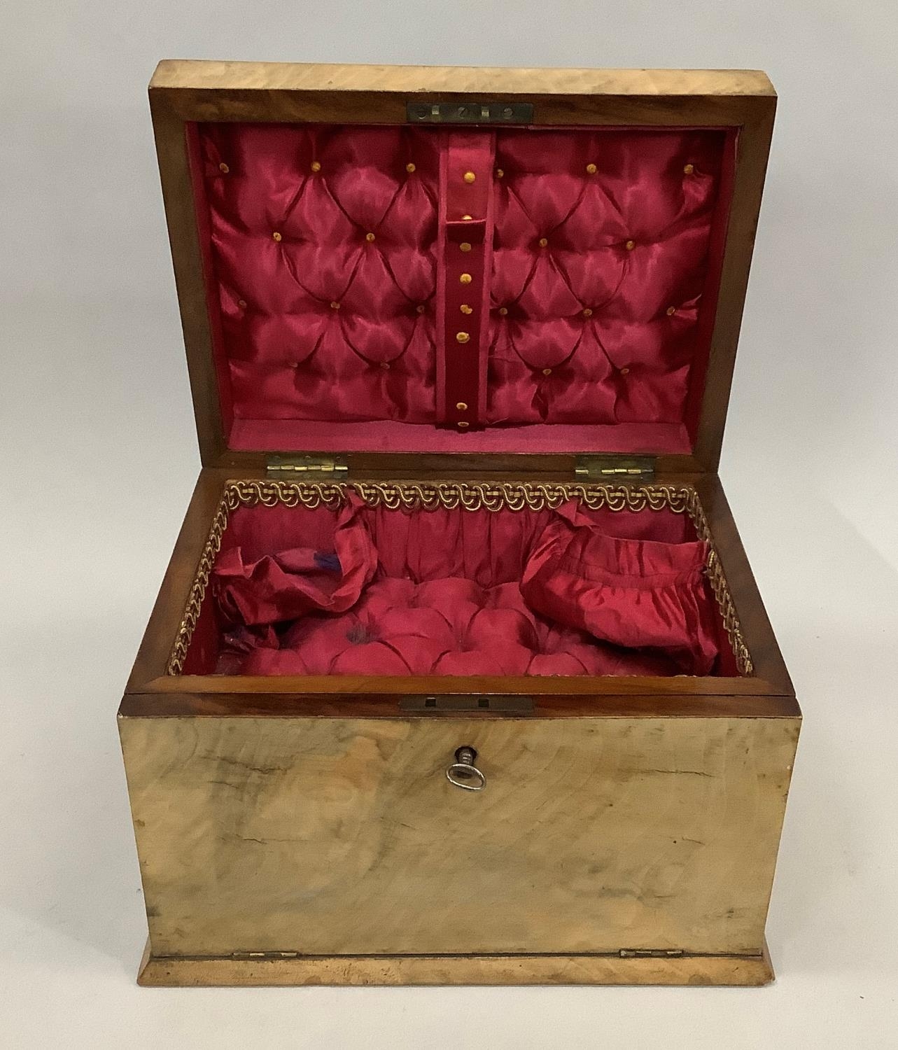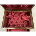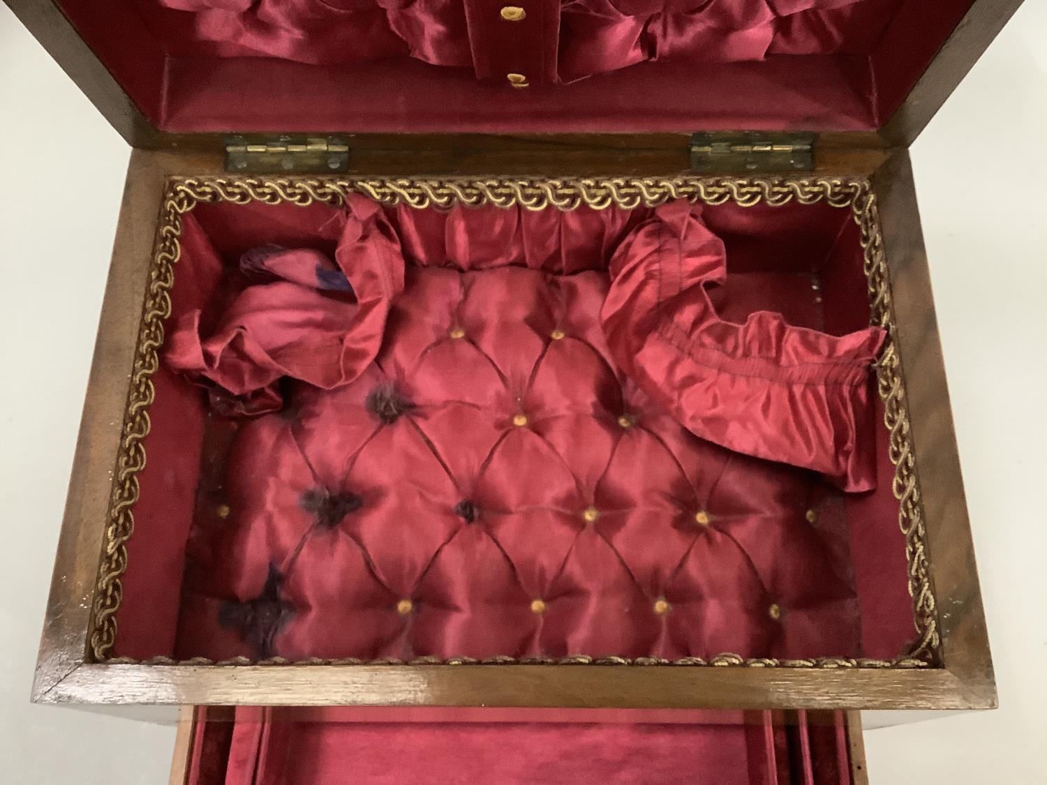 A VICTORIAN MAHOGANY JEWELLERY BOX, having an inset swing handle to the lid, drop down front, the interior lined in deep buttoned crimson silk, with drawer to base, 25cm wide x 19cm deep x 18.5cm high