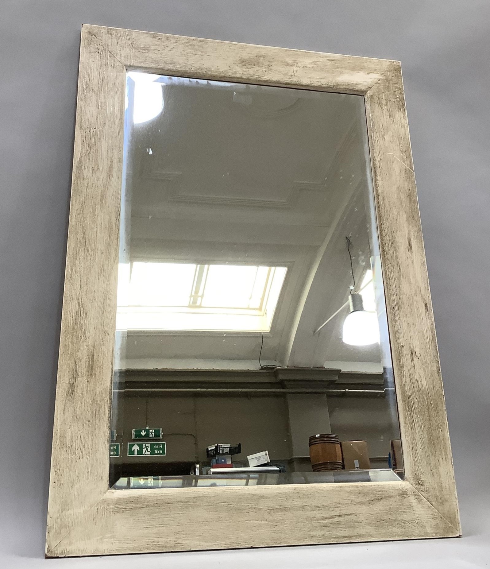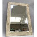 A rectangular wall mirror with cream distressed wooden frame, bevelled glass, 92.5cm x 67cm