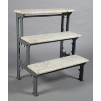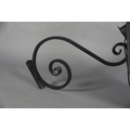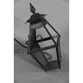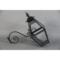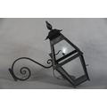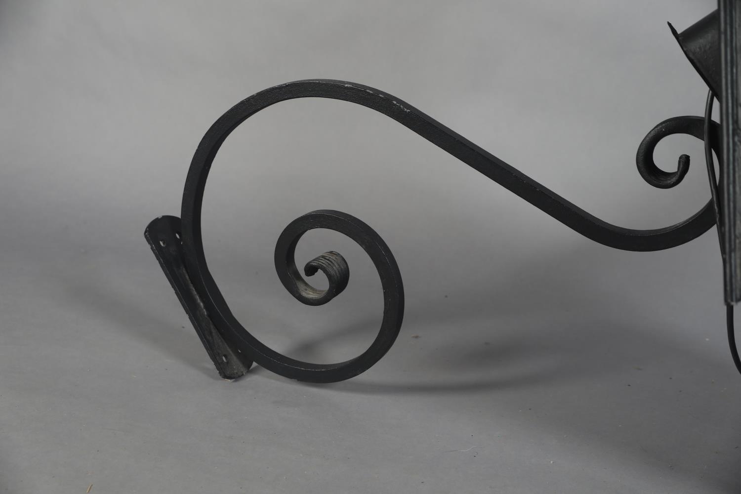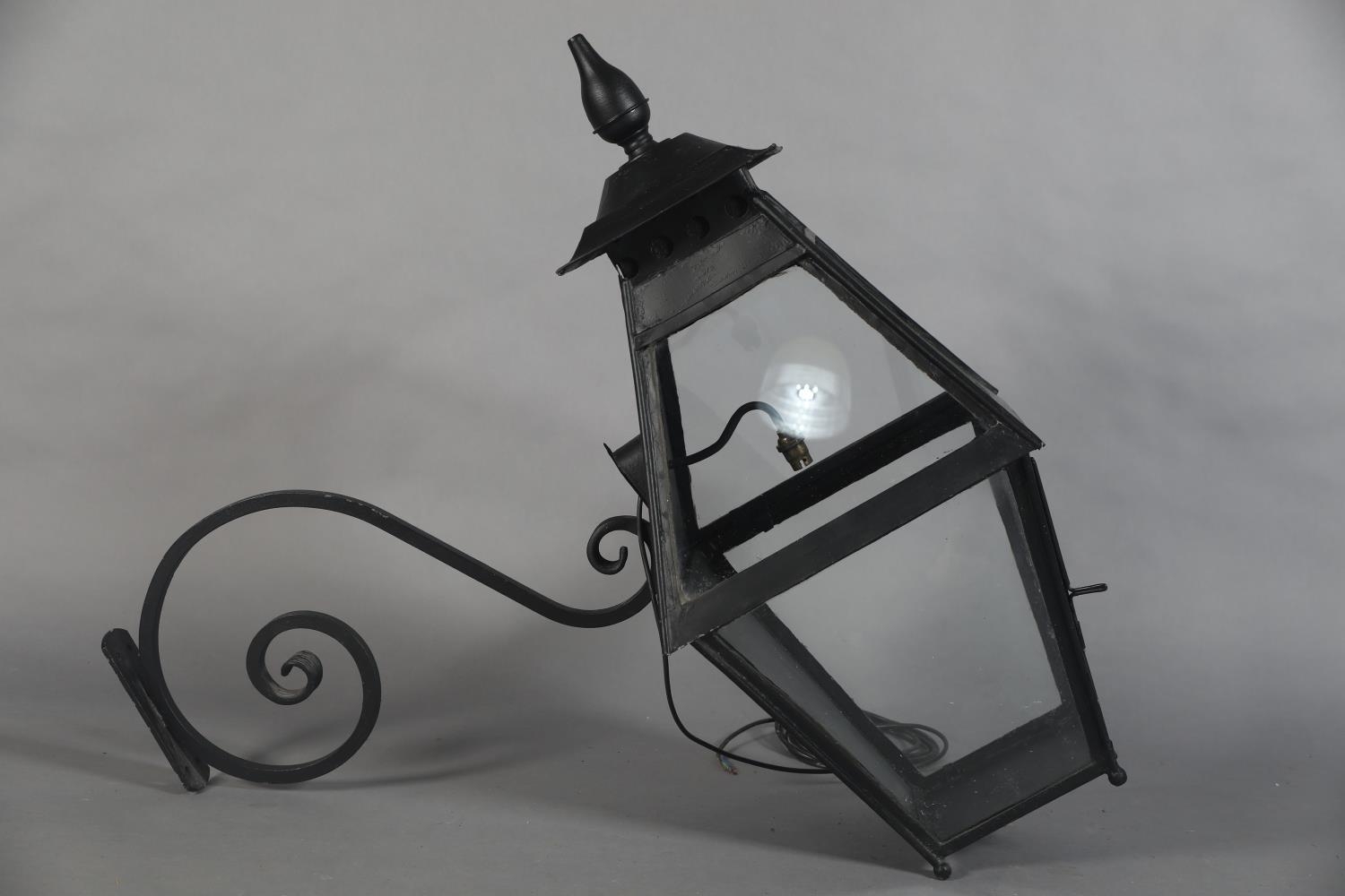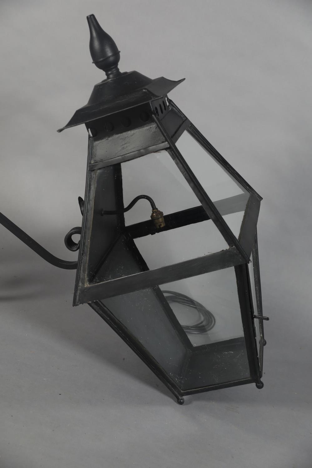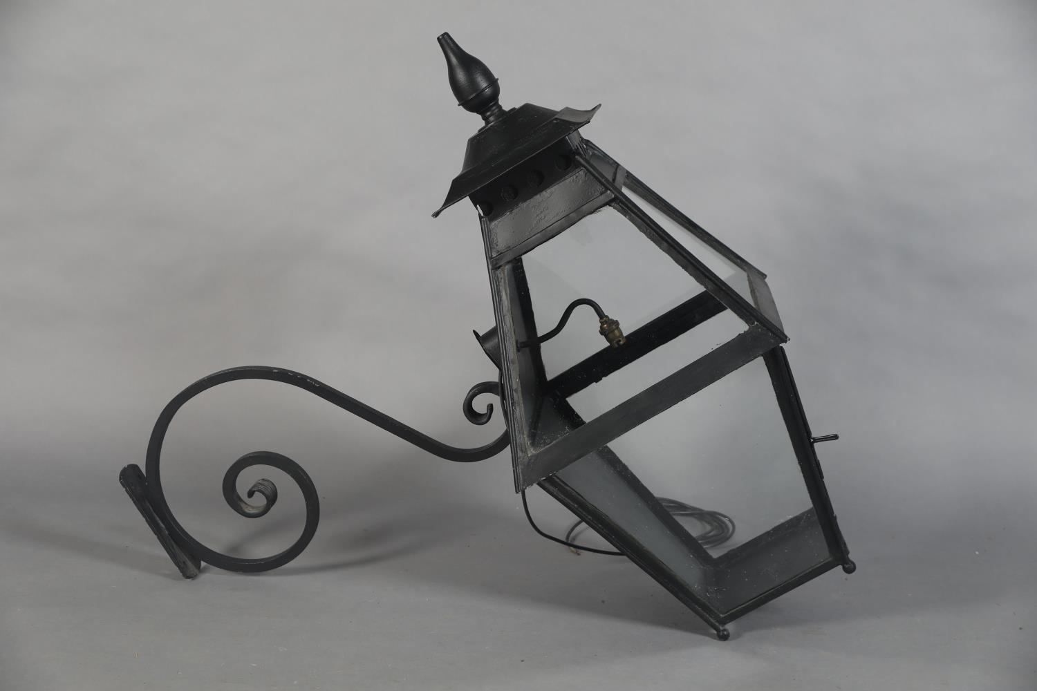 AN EXTERNAL SIX PANEL METAL AND GLAZED LANTERN with spire finial, converted to electricity and with later wrought iron scrolled bracket, approximate 42cm wide x 42cm deep x 95cm high