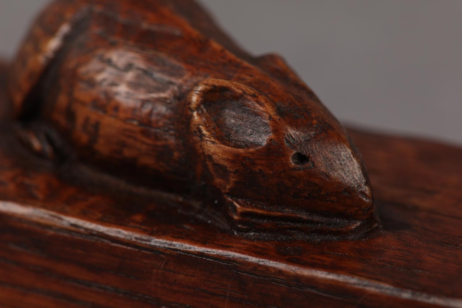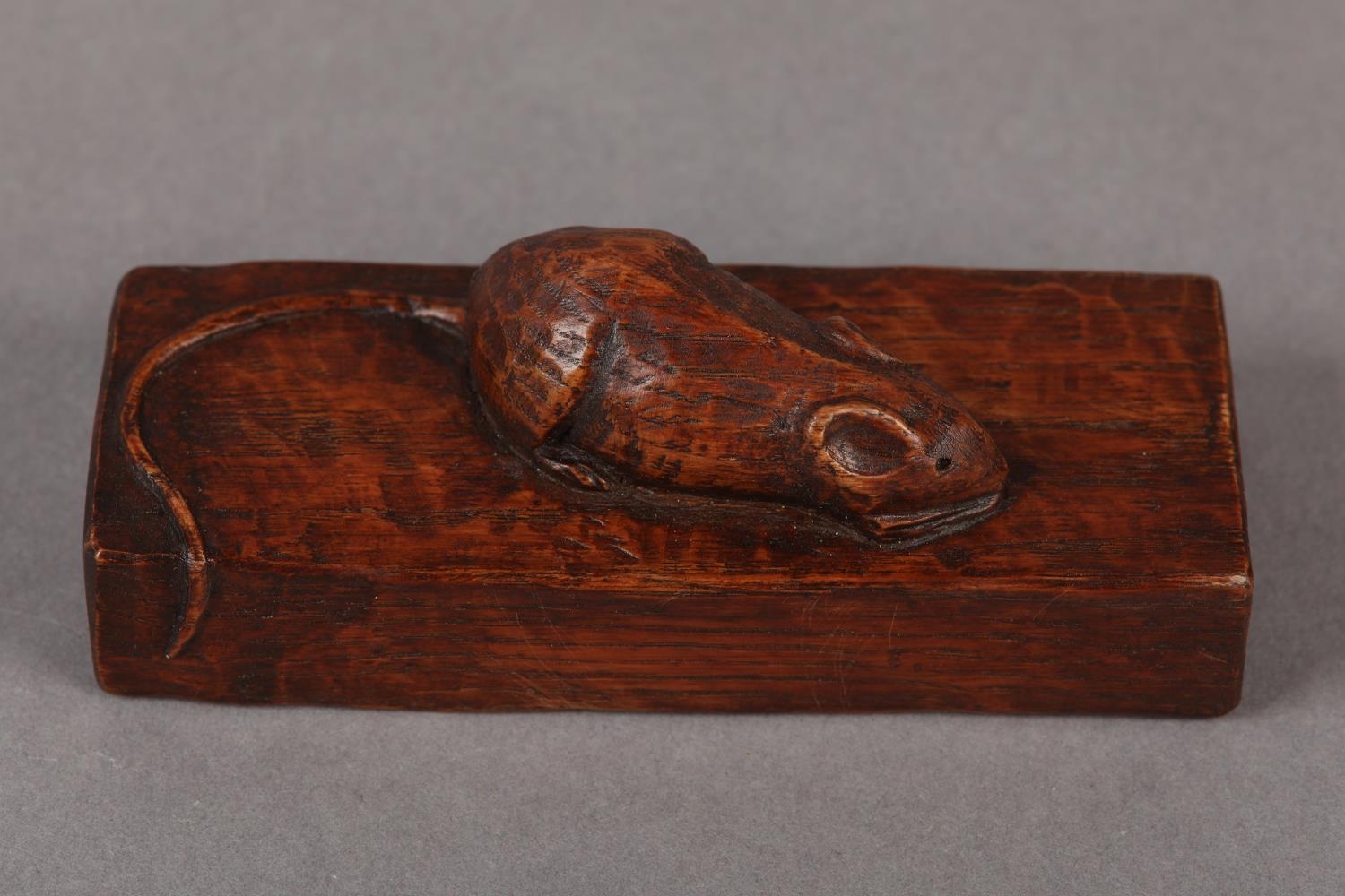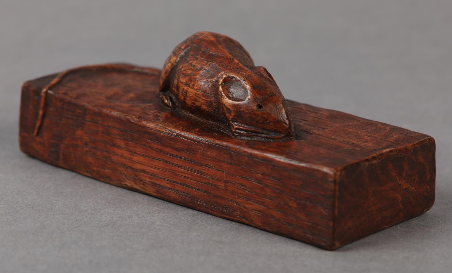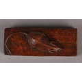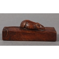 THOMPSON OF KILBURN 'MOUSEMAN' English oak apprentice piece carved with a mouse in high relief, on a rectangular plinth, 11cm long x 4cm wide x 4cm high
