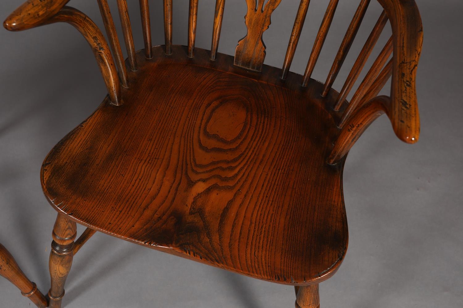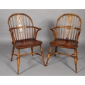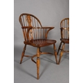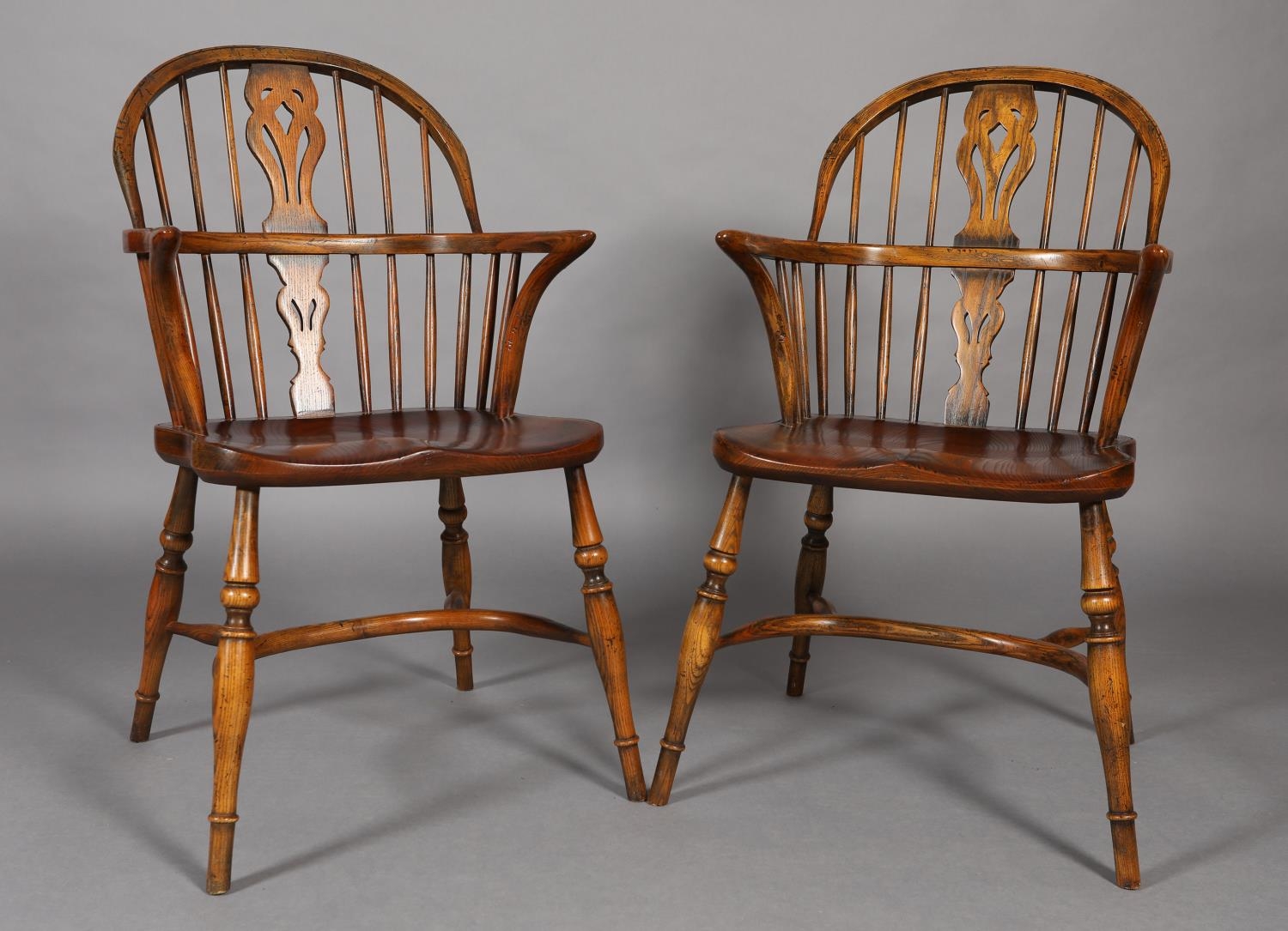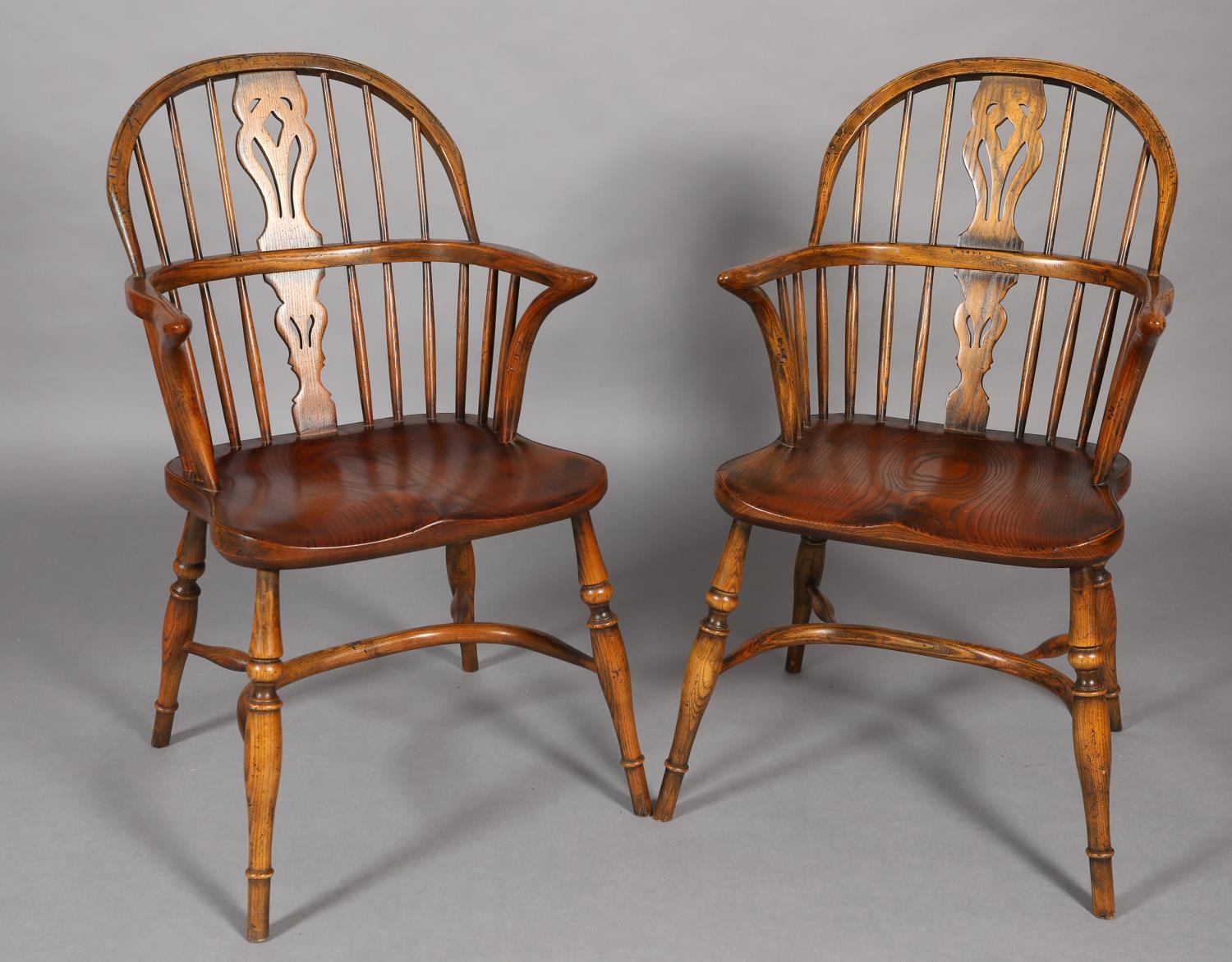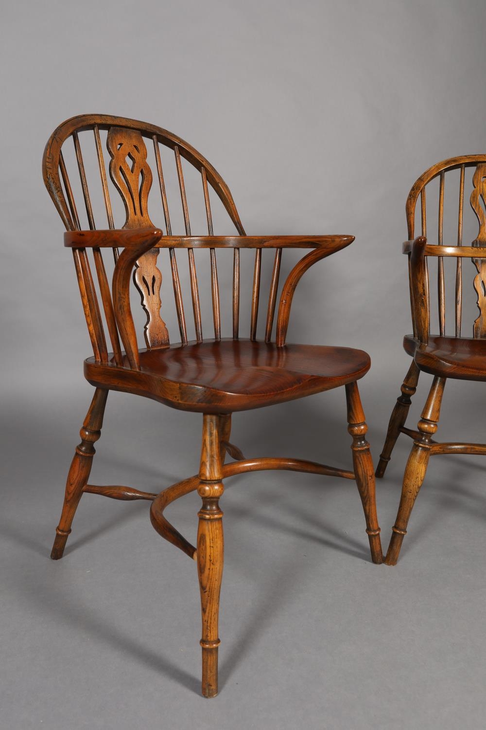 A PAIR OF LOW BACK ELM WINDSOR ARMCHAIRS BY BATHEASTON, railed backs, shepherd's crook arm uprights, on turned legs joined by a crinoline stretcher