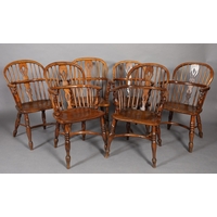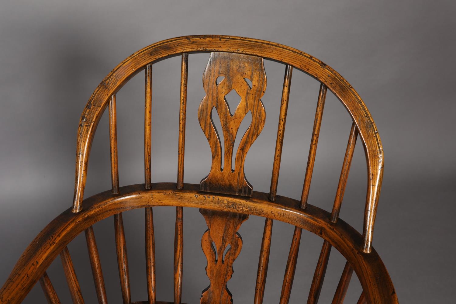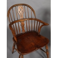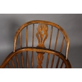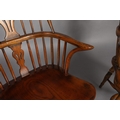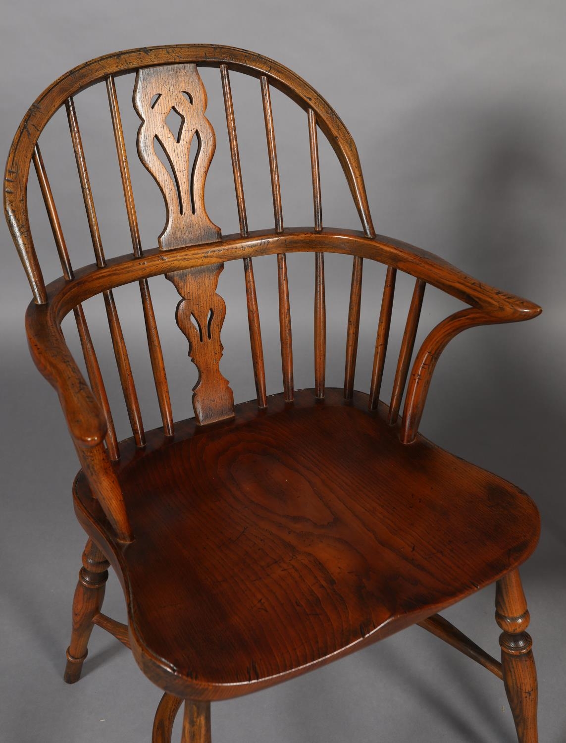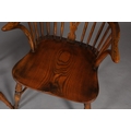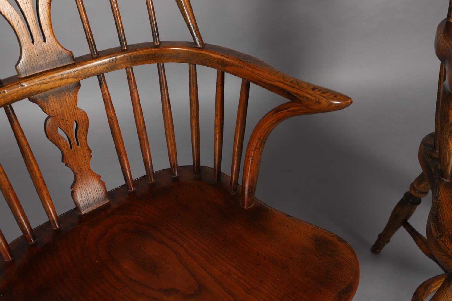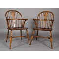 A PAIR OF LOW BACK ELM WINDSOR ARMCHAIRS BY BATHEASTON, railed backs, shepherd's crook arm uprights, on turned legs joined by a crinoline stretcher
