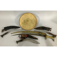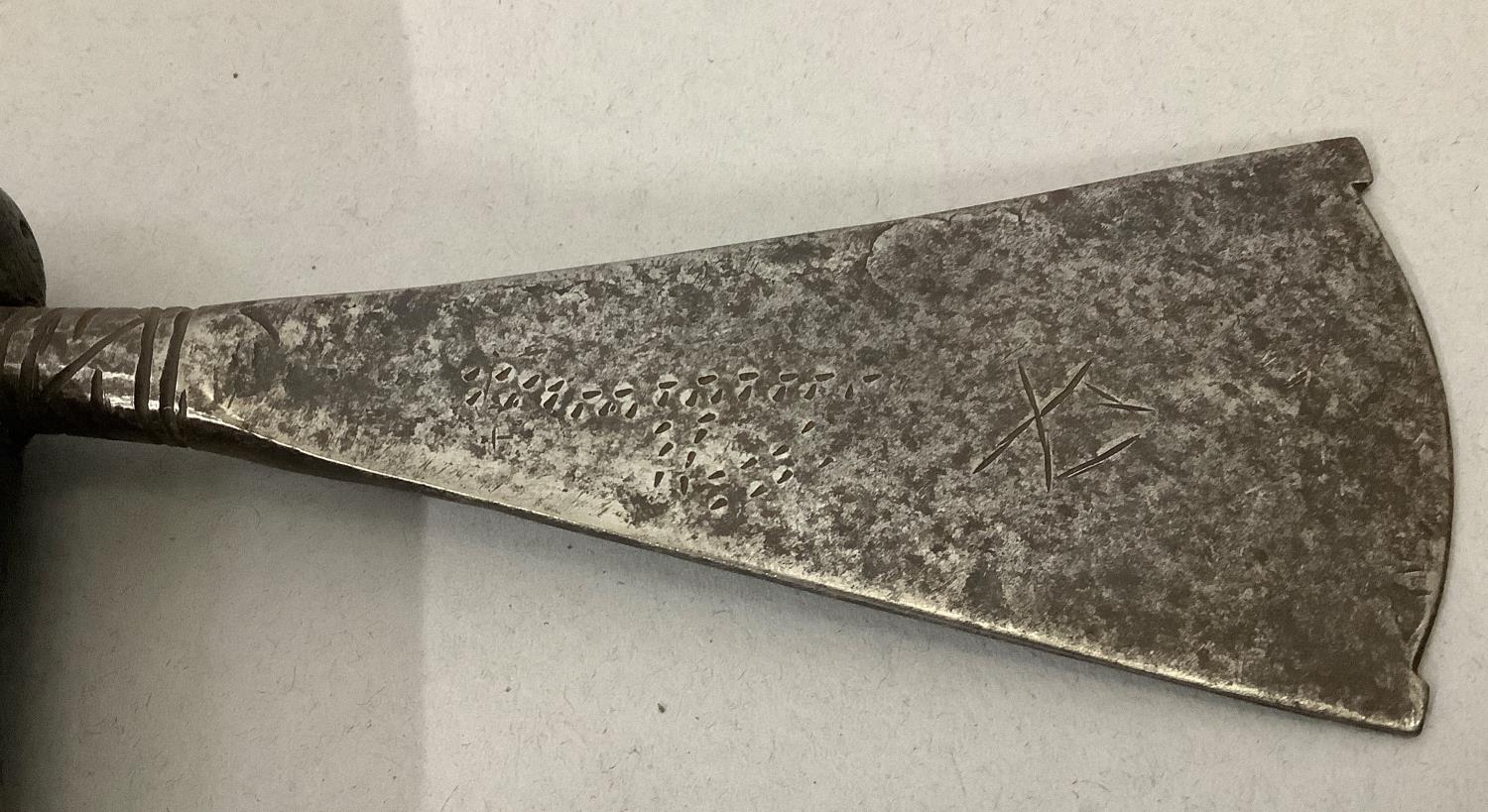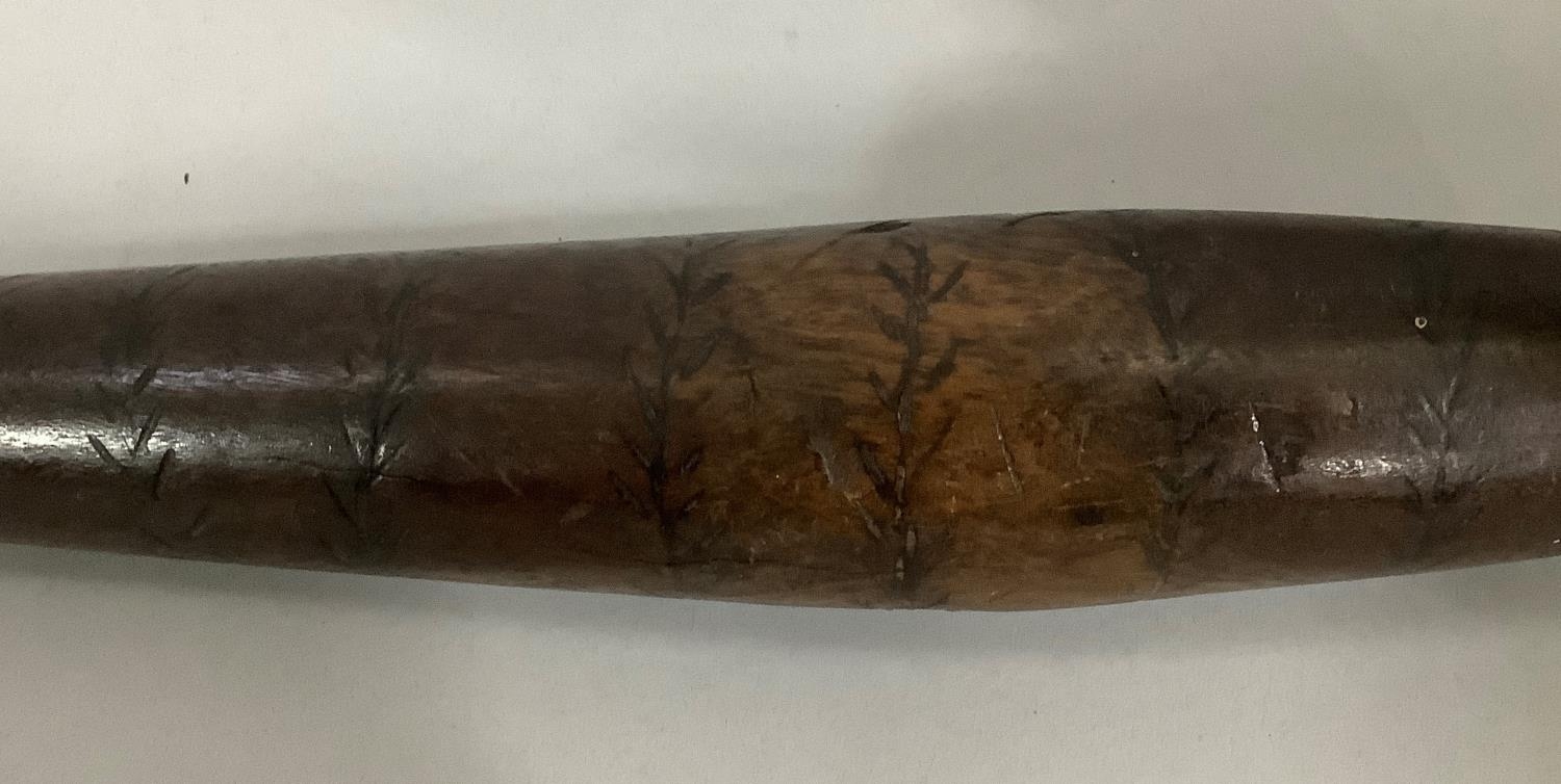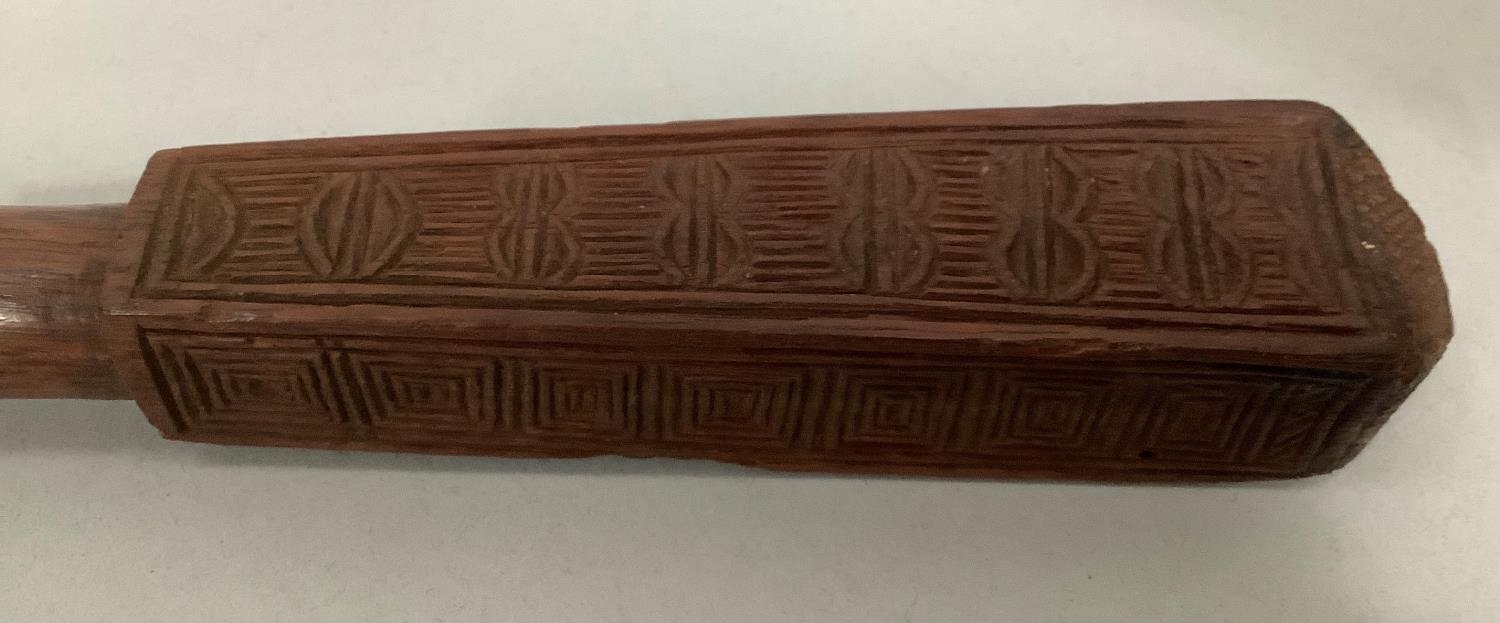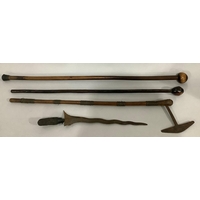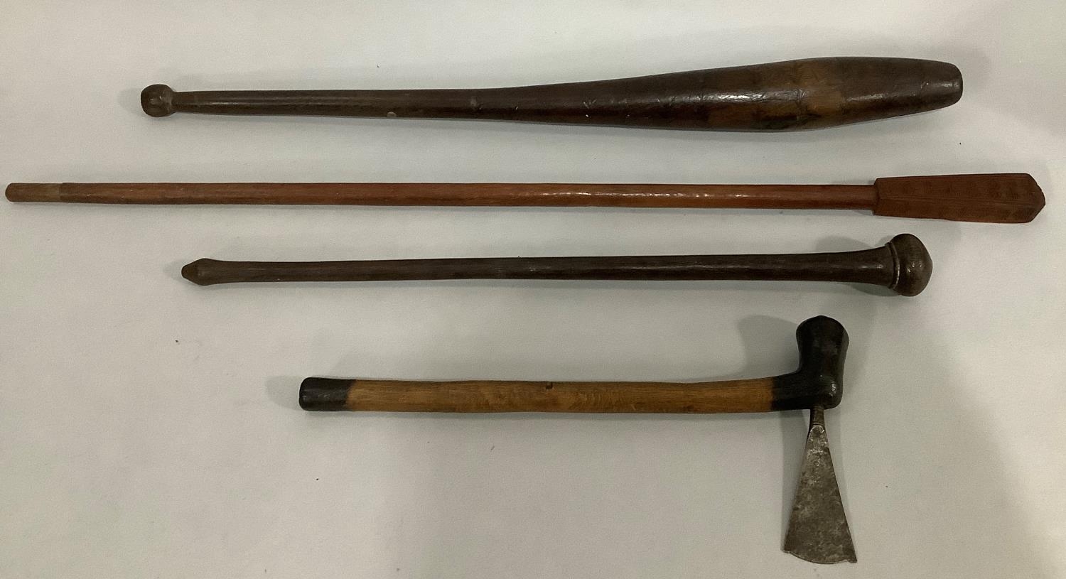 AN ABORIGINAL WOODEN CLUB, two African clubs and an African axe with engraved steel blade
