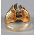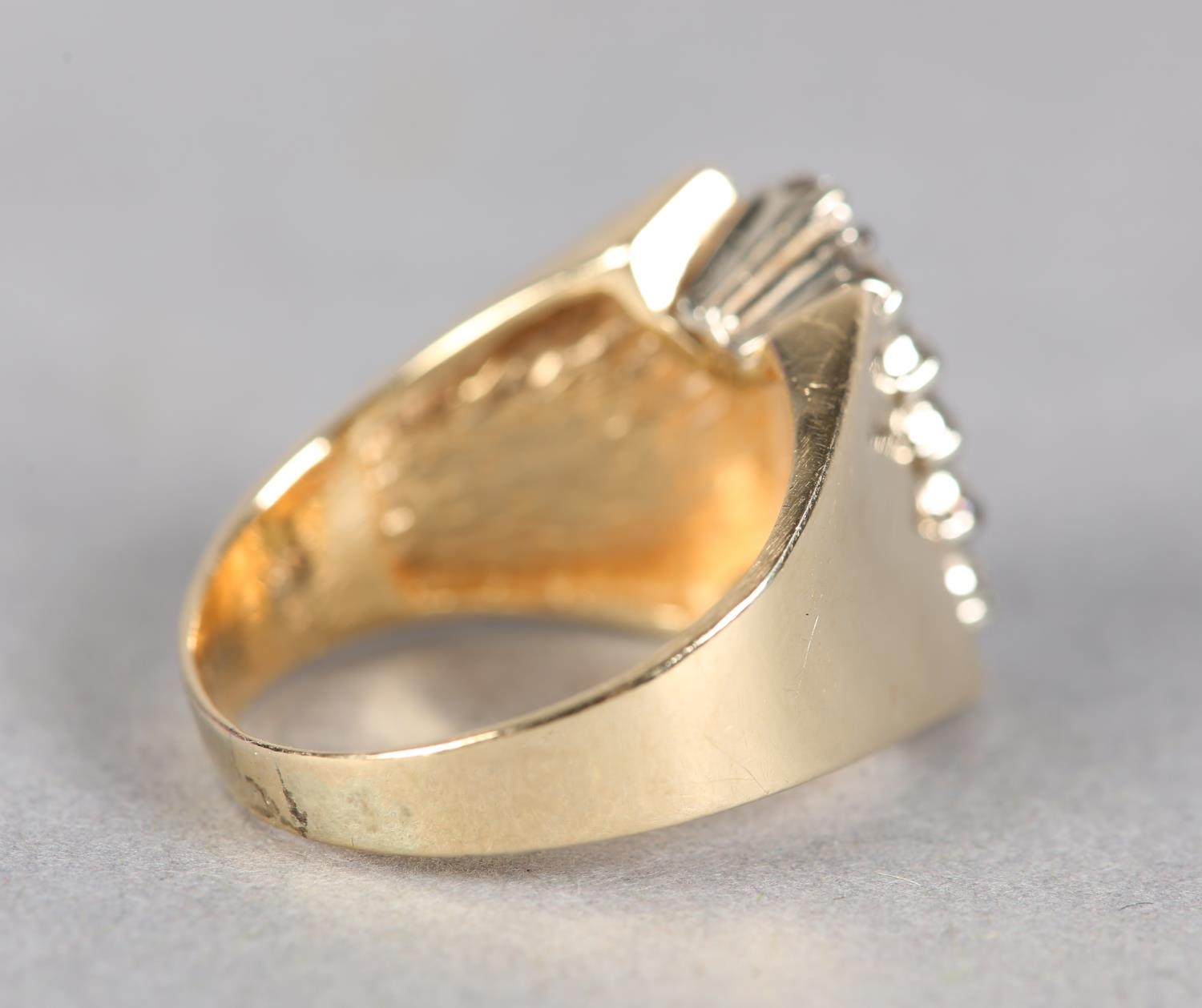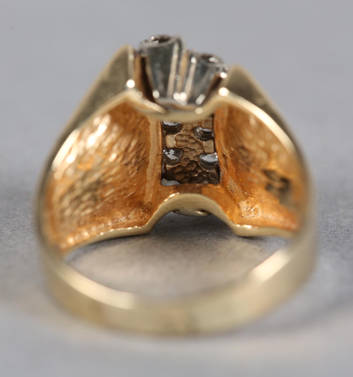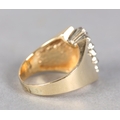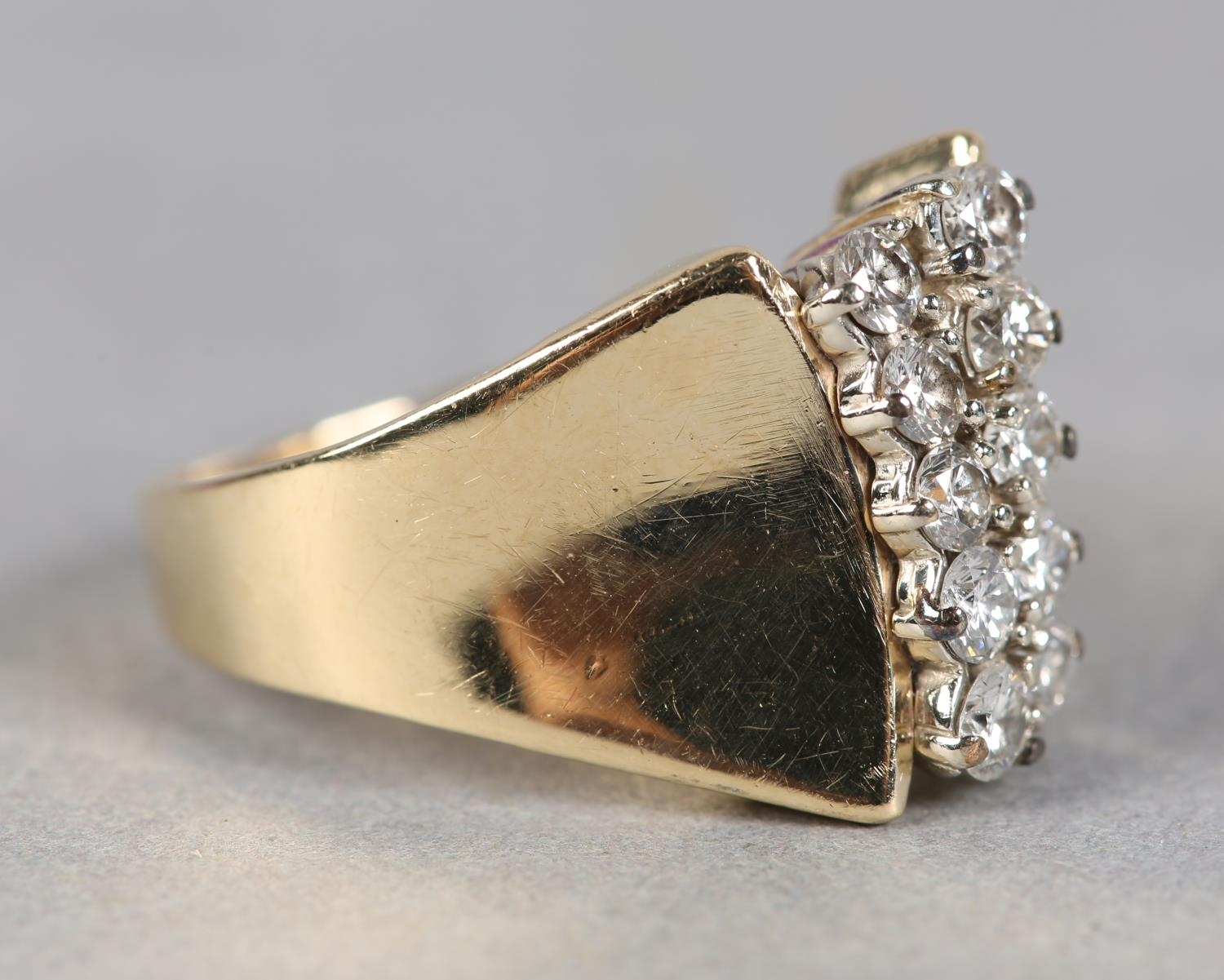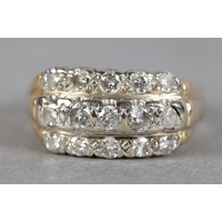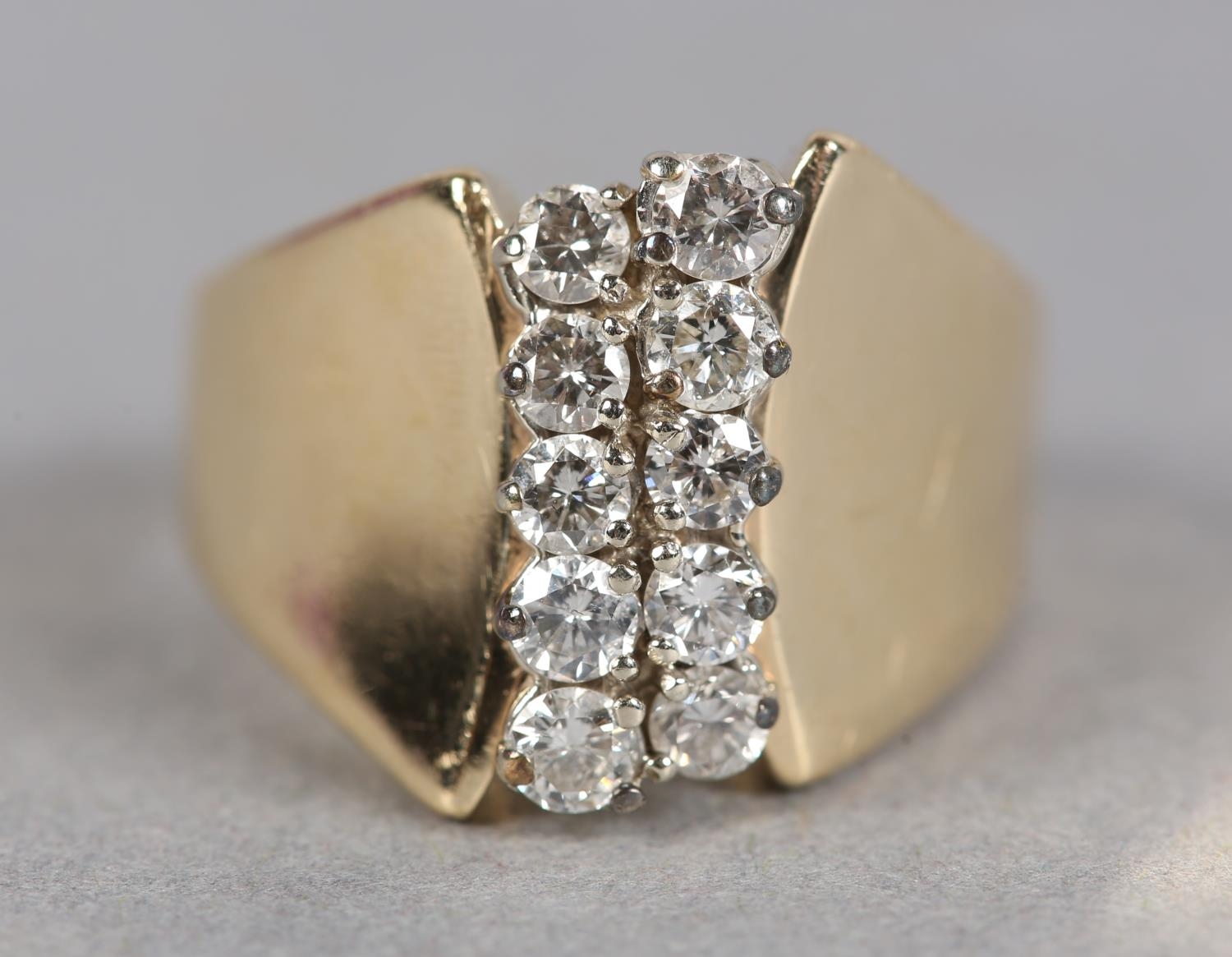 A DIAMOND RING c.1970, the brilliant cut stones claw set in two off set rows flanked by broad convex shoulders in yellow metal (tests as 14ct gold), total approximate weight of diamonds 1.10ct, approximate weight 8g