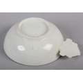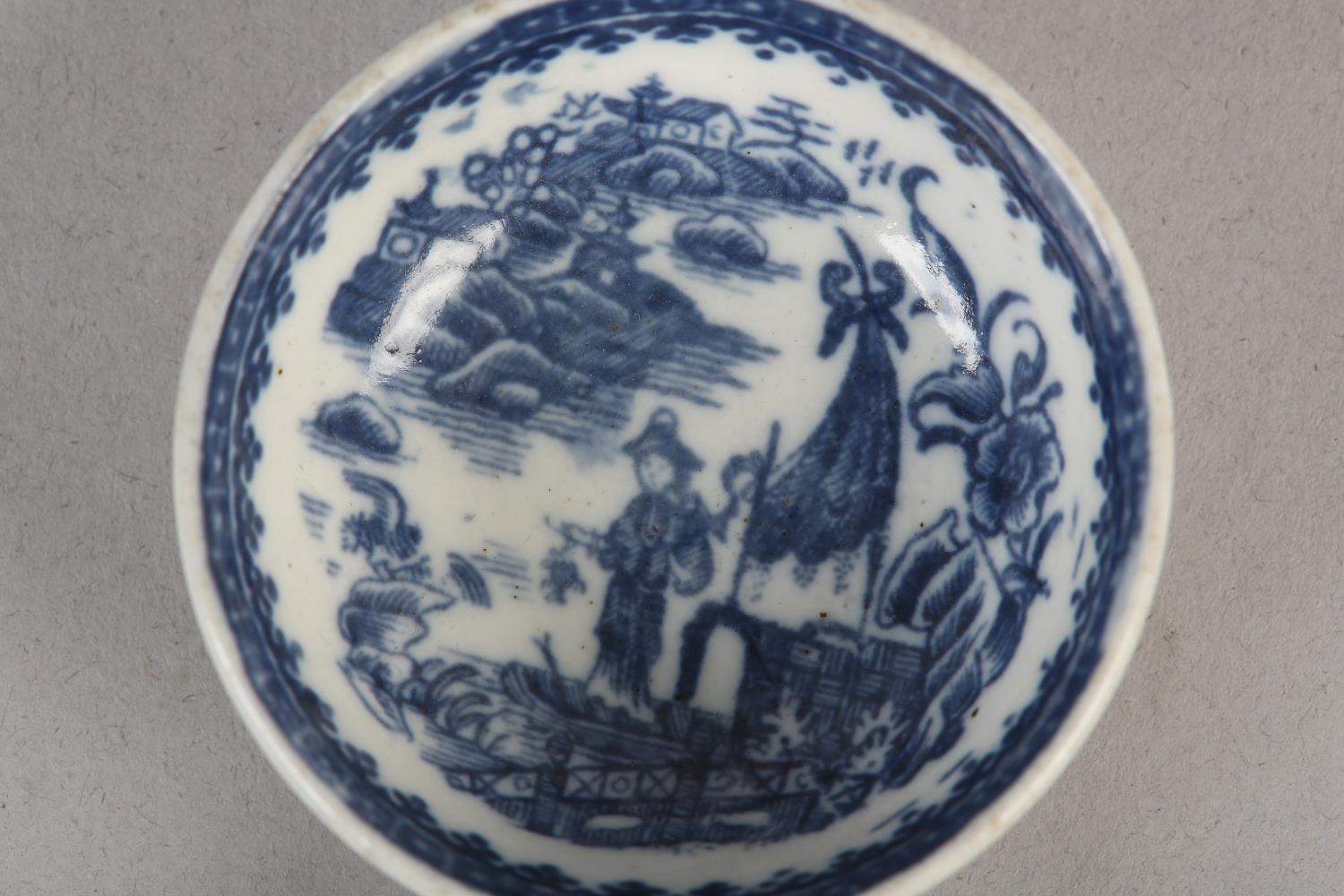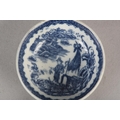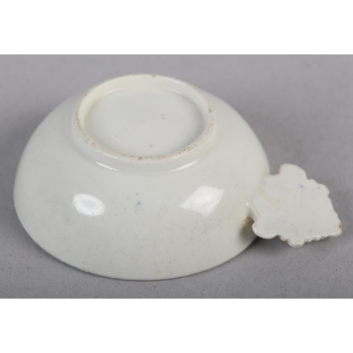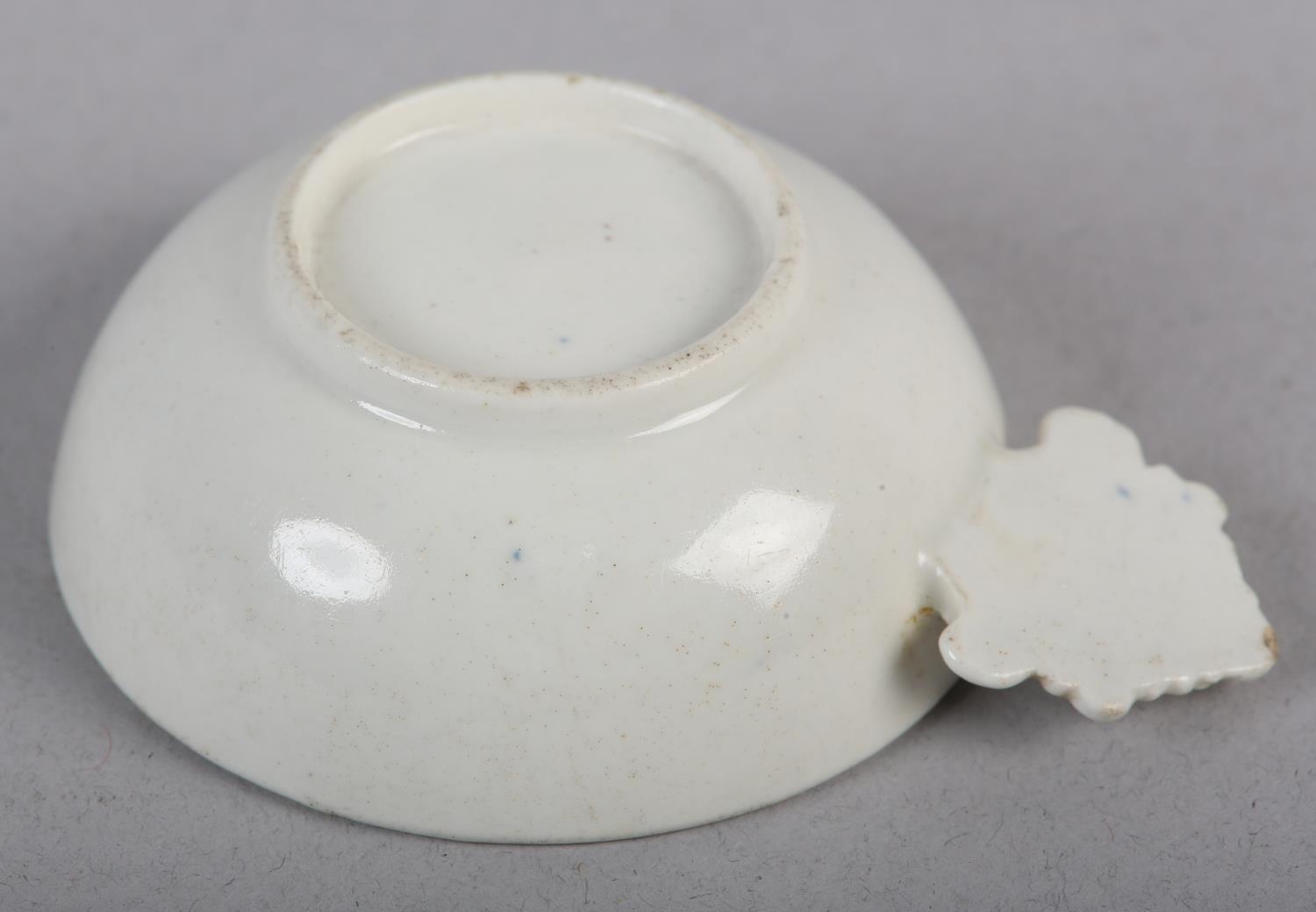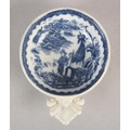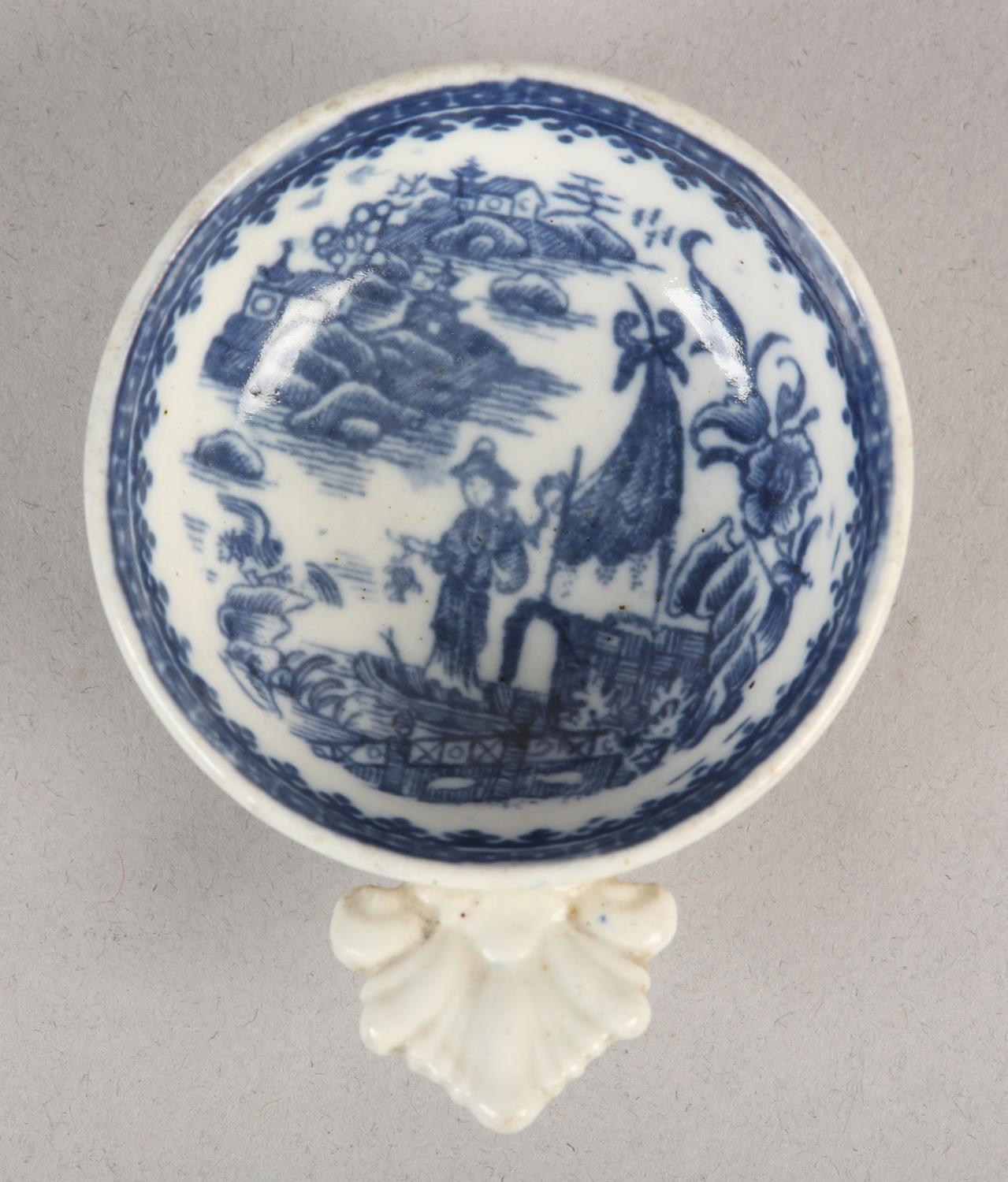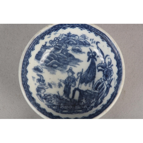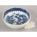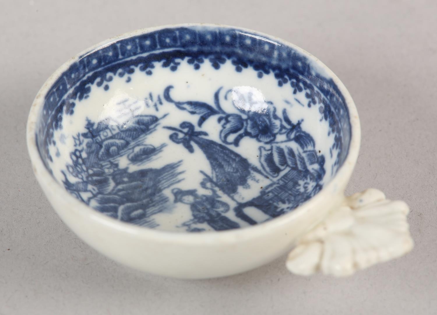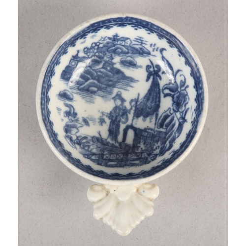 A CAUGHLEY BLUE AND WHITE PORCELAIN WINE TASTER OR CADDY SPOON, c.1785, of circular form with leaf shaped handle, transfer printed in blue with the Fisherman pattern, unmarked, 7.25cm over handle