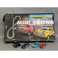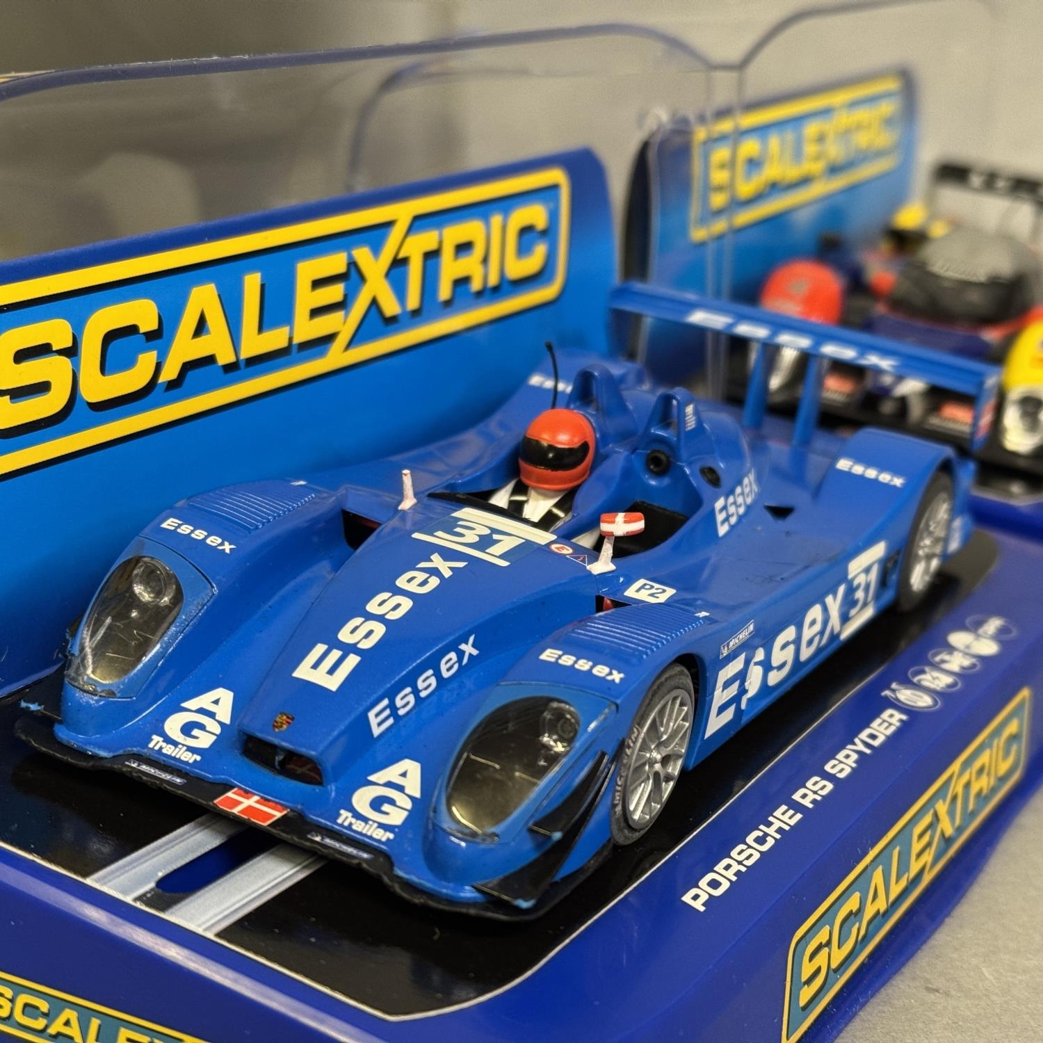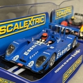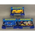 Three Scalextric Le Mans model cars, including a Peugeot 908 HDi Oreca, a Porsche RS Spyder Porsche Engineering and a Porsche RS Spyder Team Essex, all boxed