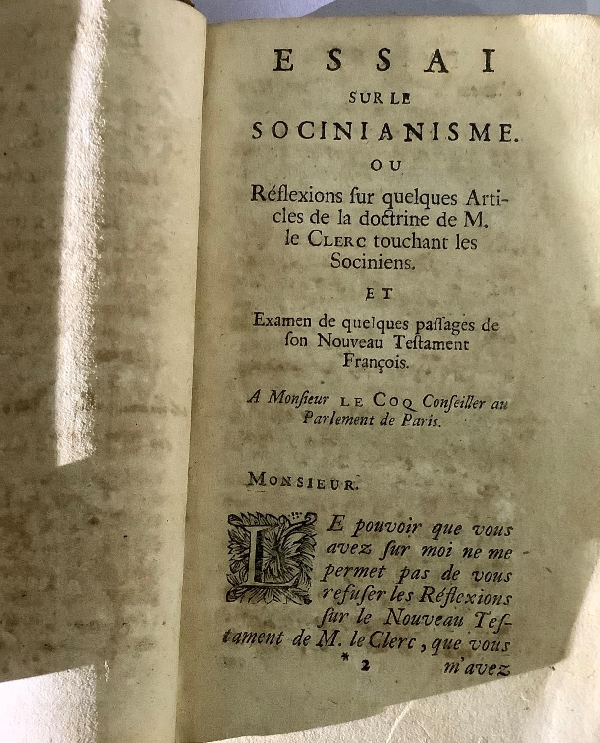 MESNARD, PHILIPPE - Essai sur le Socinianisme, pub. La Veuve d'Abraham Troyel, 1709, engraved to title page, indistinct inscription to title page in ink 'la fayardie?', full calf, red title and gilt tooling to spine