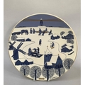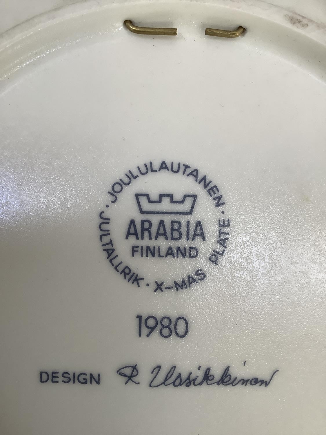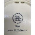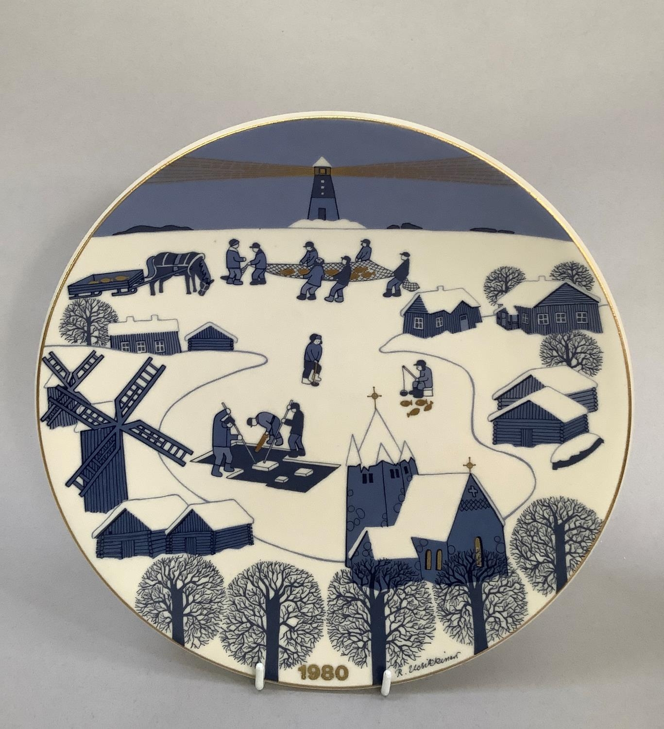 A 1980s Arabia Finland Christmas plate designed by Raija Uosikkinen decorated in blue and gilt on cream with towns, villages and people engaged in winter tasks and hobbies, dated 1980 with signature to the rim and Arabia mark verso, 23cm diameter