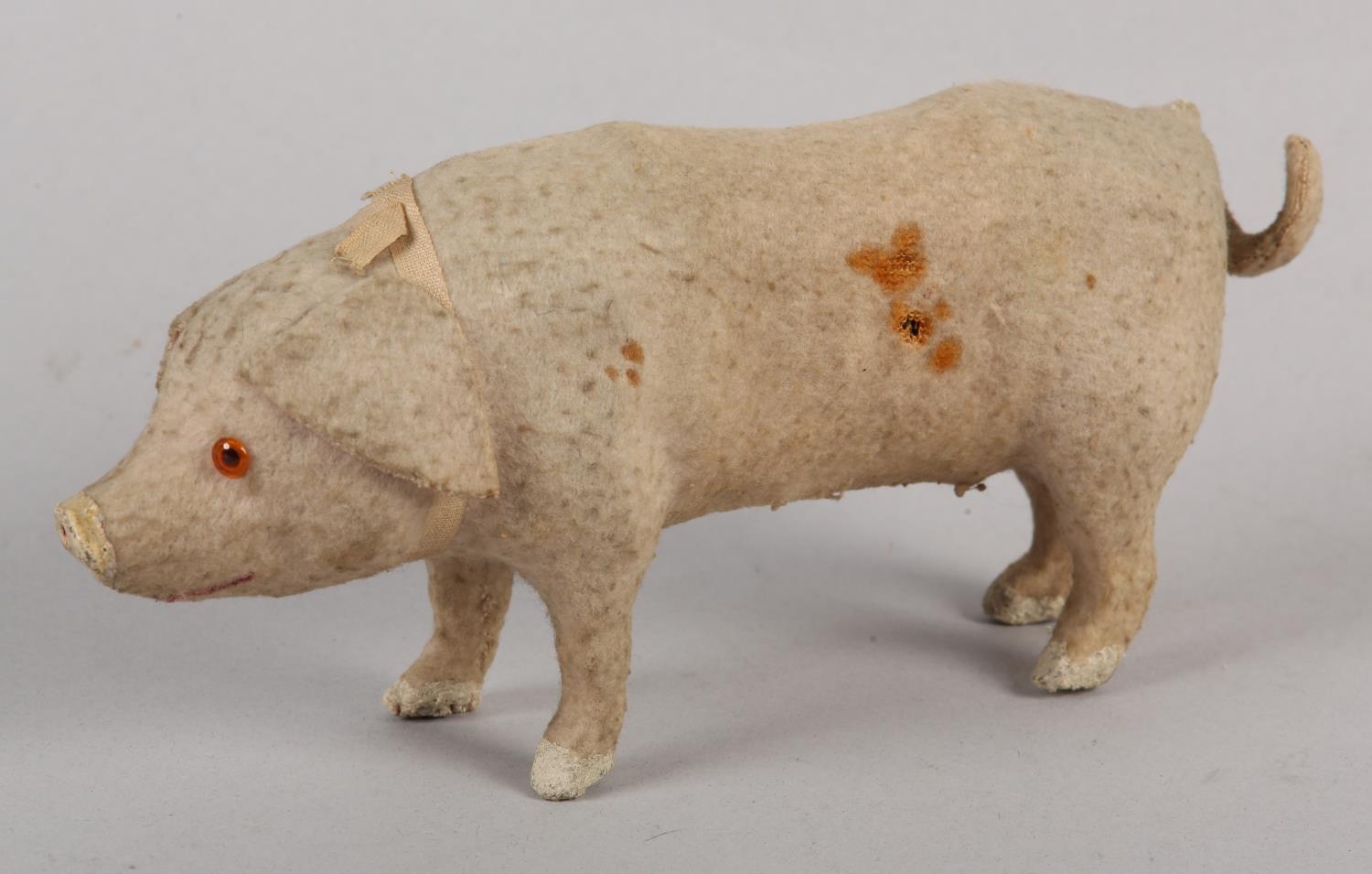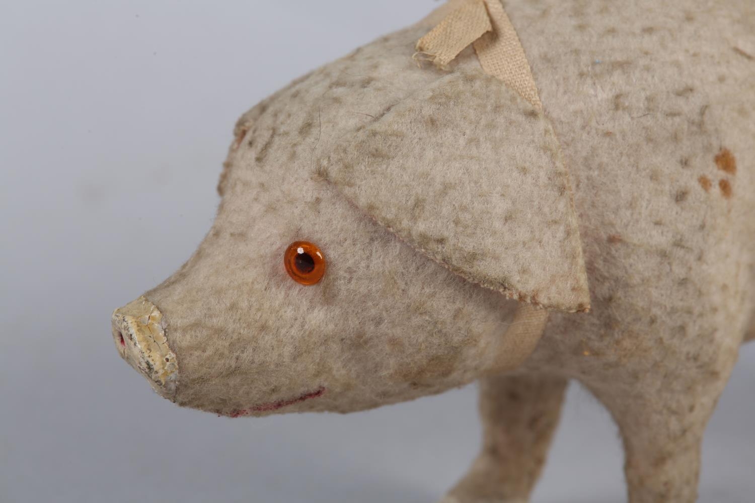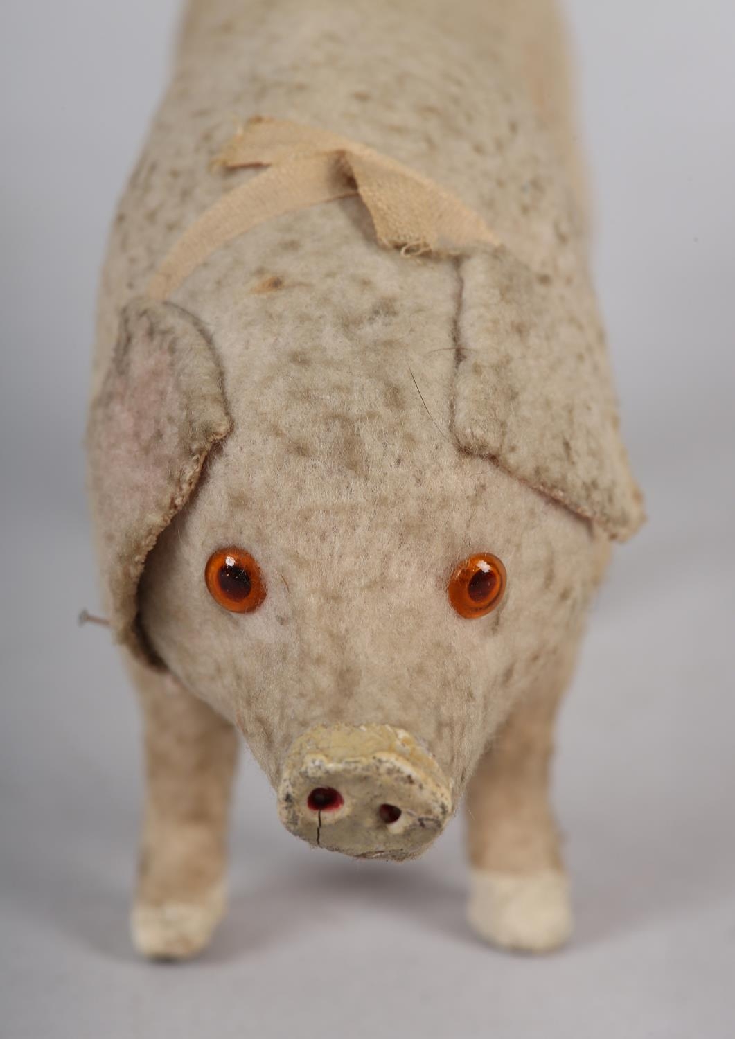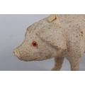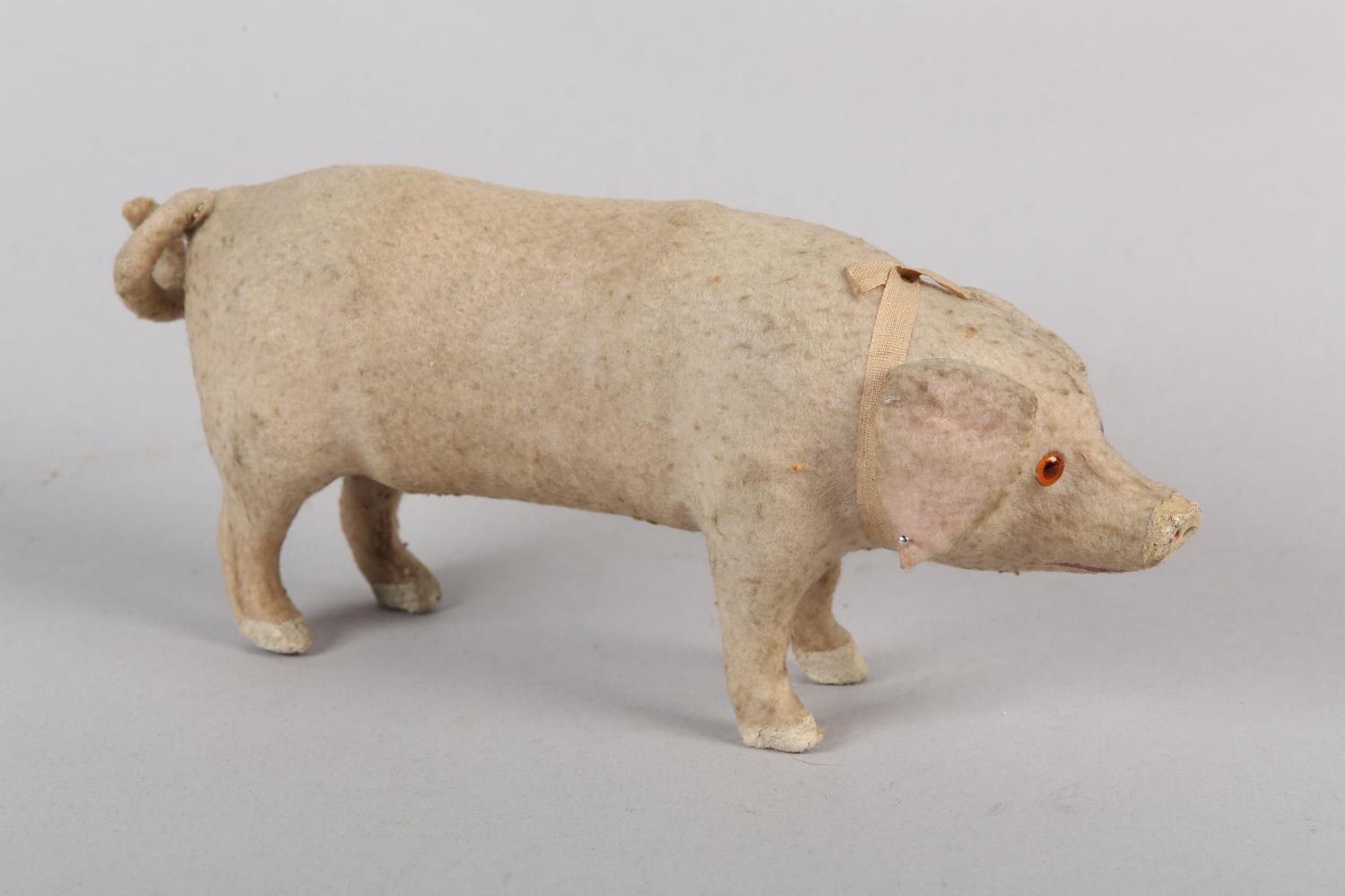 A LATE 19TH/EARLY 20TH CENTURY PINK FELT PIG, probably German, with squeak concertina (at fault), with glass amber eyes, 22cm long x 9.5cm high