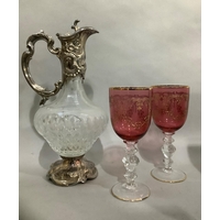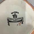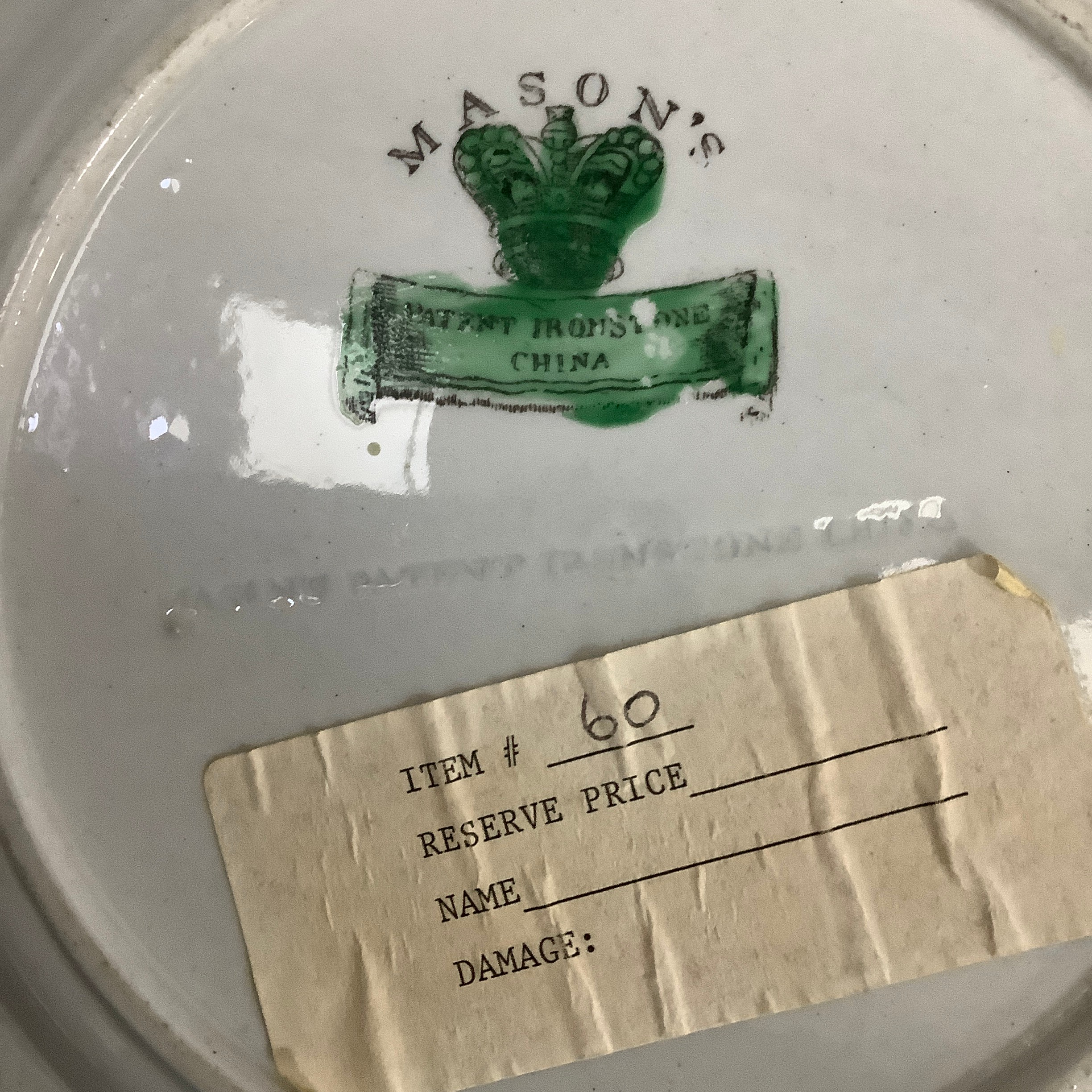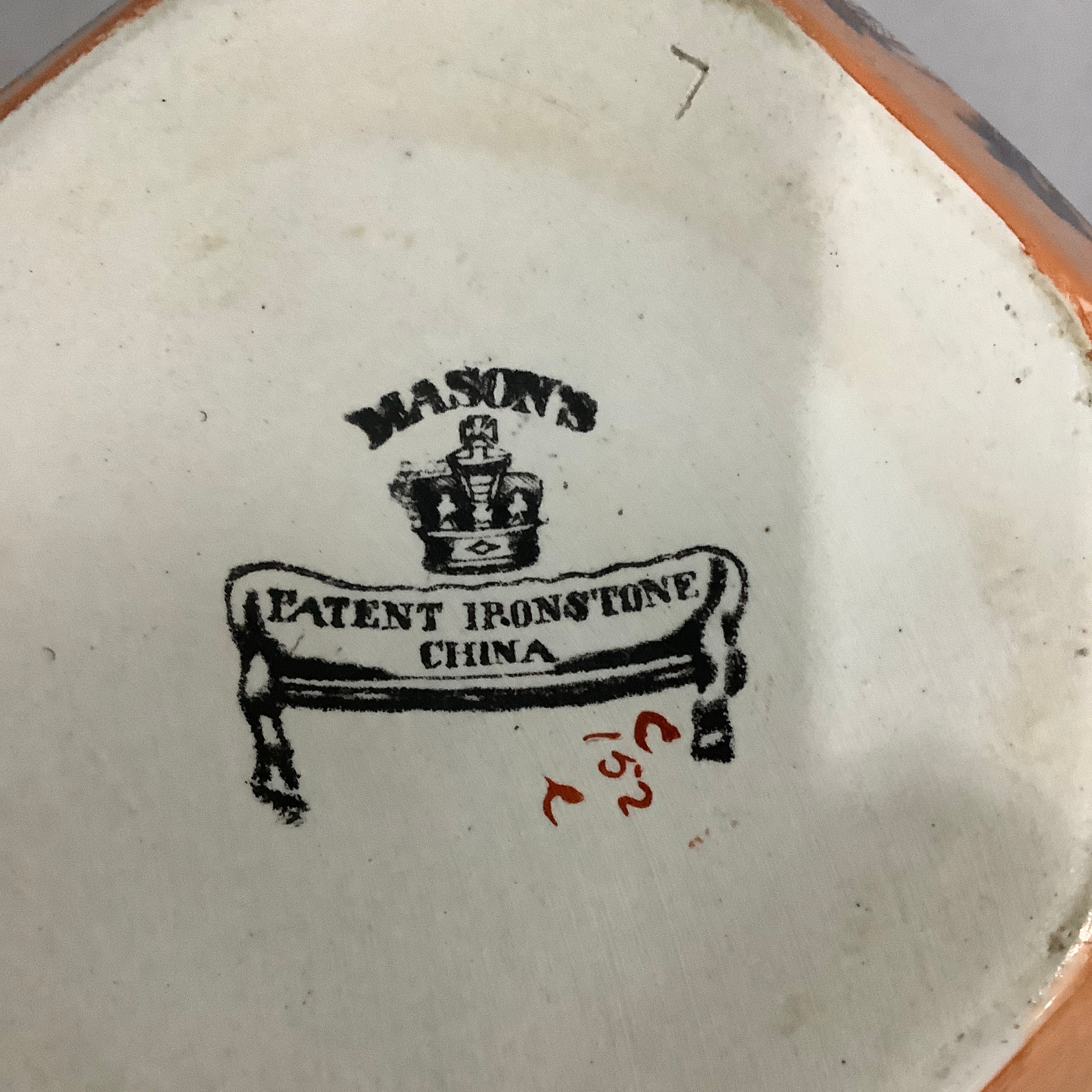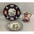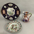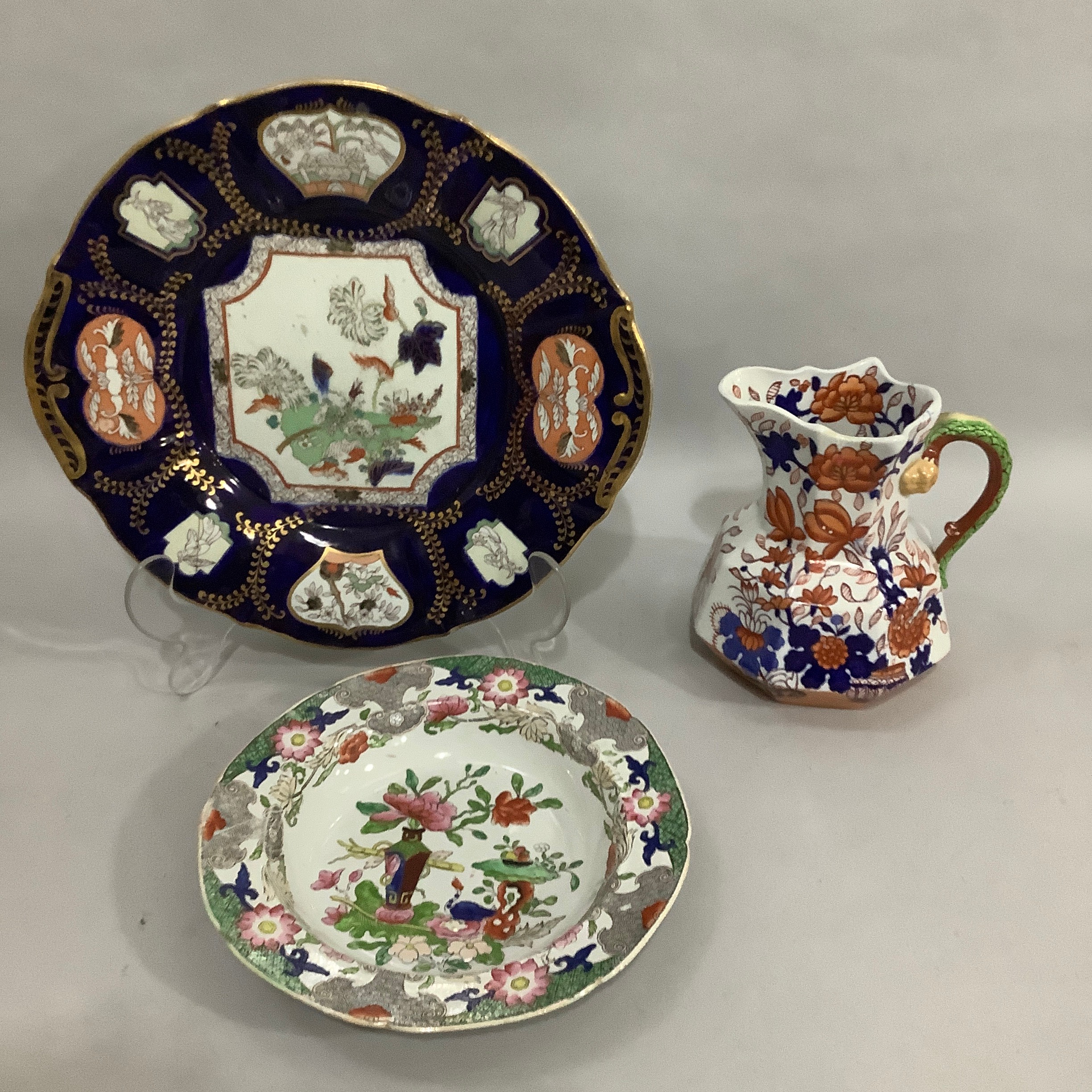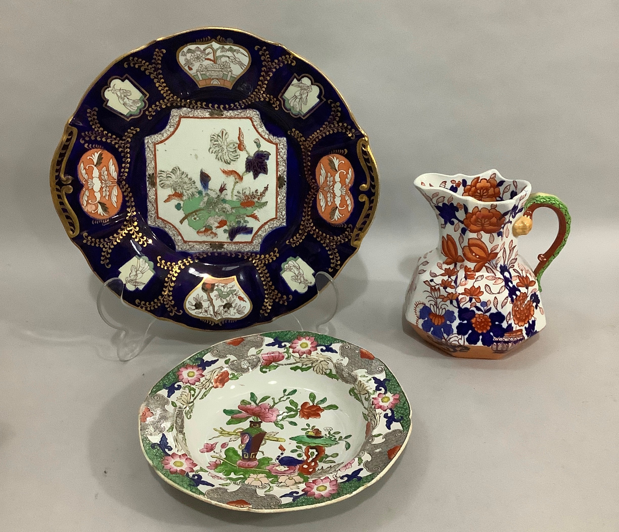A Masons Ironstone stand in underglaze blue with reserves printed in enamel in the chinoiserie manner and with gold leaf curls, c.1845, 33cm diameter, together with a Masons Ironstone soup plate enamelled in rose, terracotta, green and blue and a later Masons jug with serpentine handle