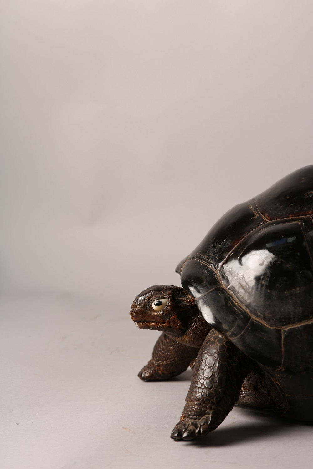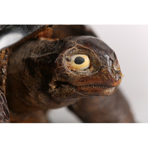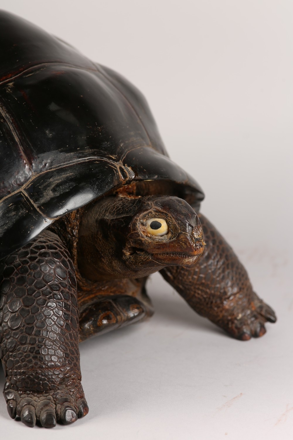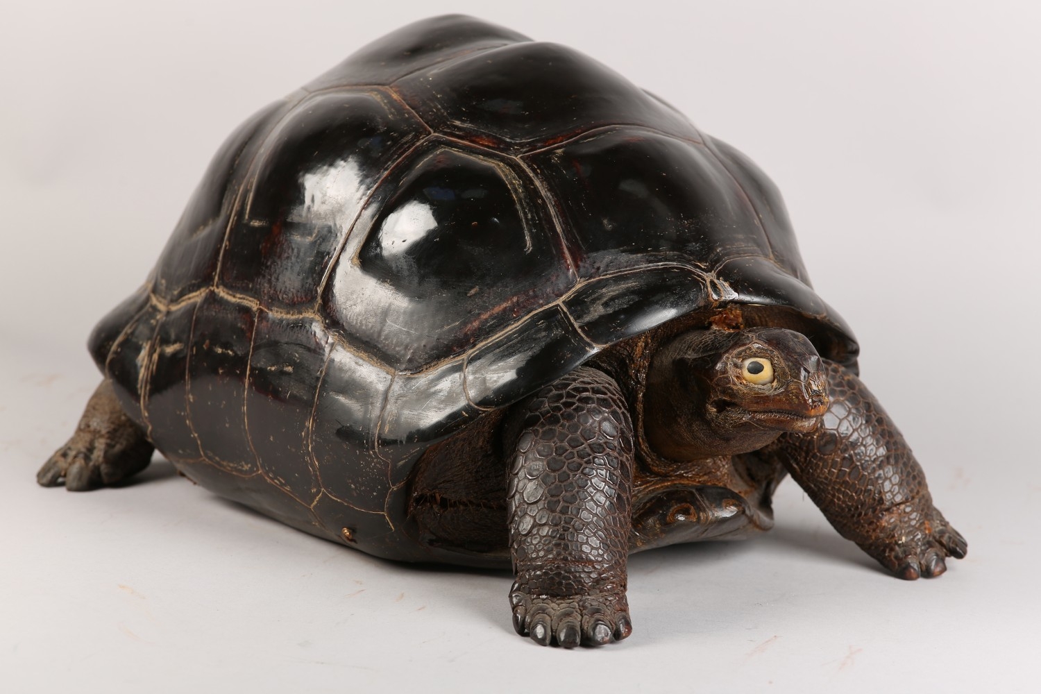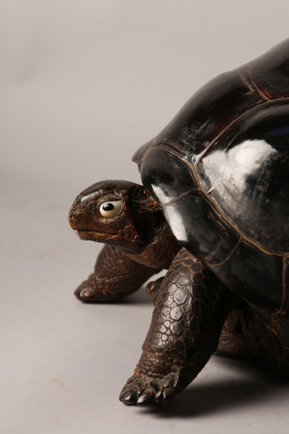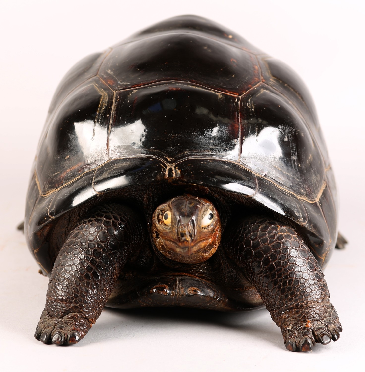 TAXIDERMY: AN ALDABRA GIANT TORTOISE (πππ₯π’π£π³π’π€π©π¦ππΊπ΄ ππͺπ¨π’π―π΅π¦π’) late 19th/early 20th century, well modelled, full body mount with seashell eyes, the body stuffed with wood shavings, 48cm long x 32cm wide x 25.5cm high. Probably a young female, Endemic to the Seychelles, the Aldabra giant tortoise is one of the largest in the world. Historically giant tortoises were found on many of the Western Indian Ocean islands but in the 17th to 19th centuries, they became a food source for sailors who captured and held them on board as a source of fresh meat. Numbers declined and eventually became extinct on many of the islands with the exception of those on the Aldabra atoll.