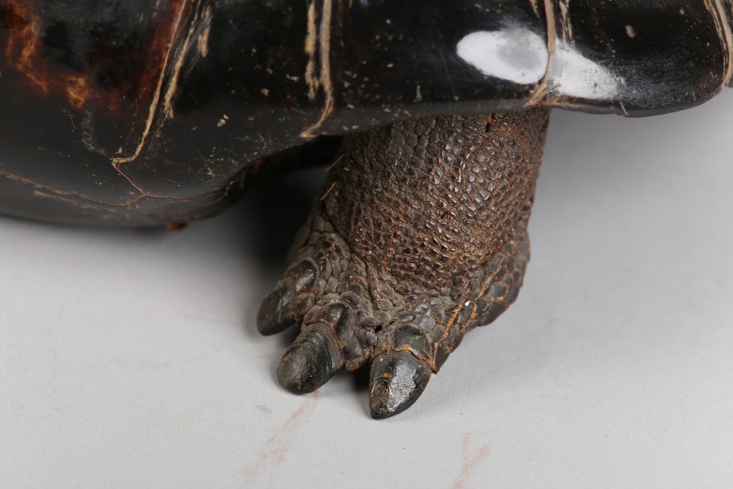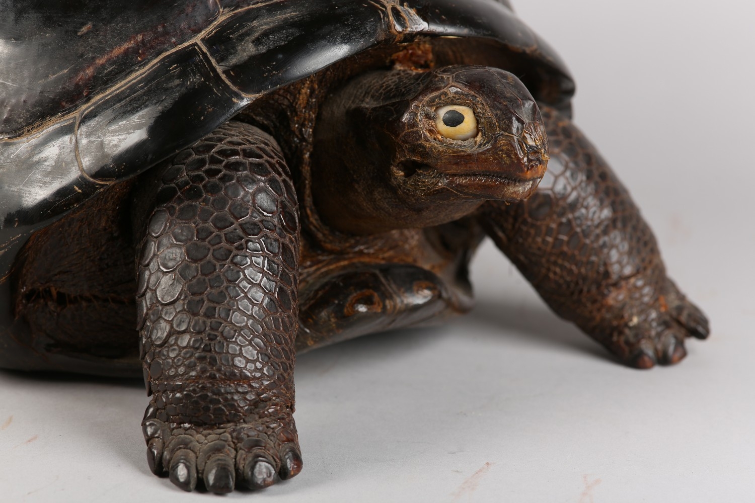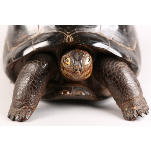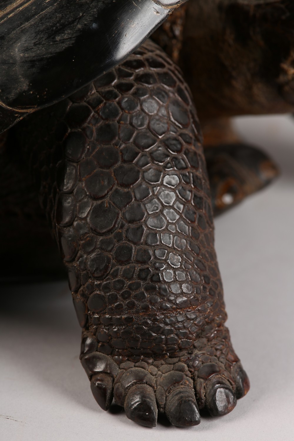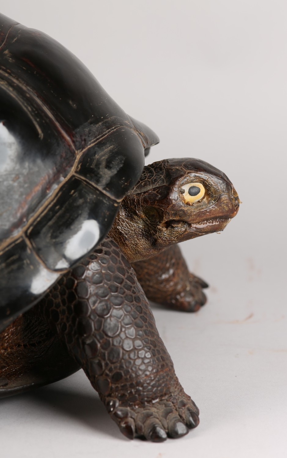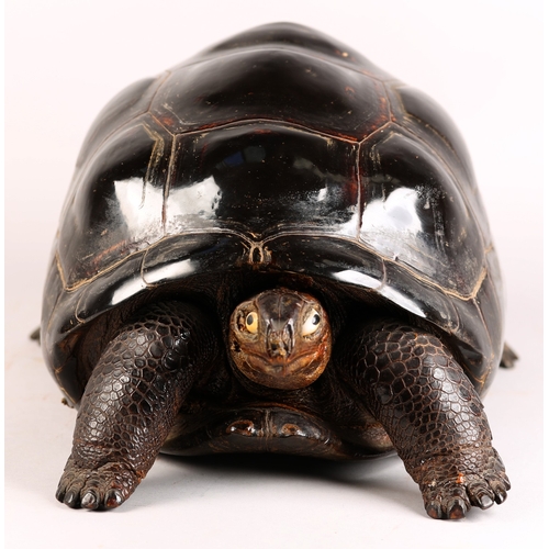 TAXIDERMY: AN ALDABRA GIANT TORTOISE (πππ₯π’π£π³π’π€π©π¦ππΊπ΄ ππͺπ¨π’π―π΅π¦π’) late 19th/early 20th century, well modelled, full body mount with seashell eyes, the body stuffed with wood shavings, 48cm long x 32cm wide x 25.5cm high. Probably a young female, Endemic to the Seychelles, the Aldabra giant tortoise is one of the largest in the world. Historically giant tortoises were found on many of the Western Indian Ocean islands but in the 17th to 19th centuries, they became a food source for sailors who captured and held them on board as a source of fresh meat. Numbers declined and eventually became extinct on many of the islands with the exception of those on the Aldabra atoll.