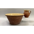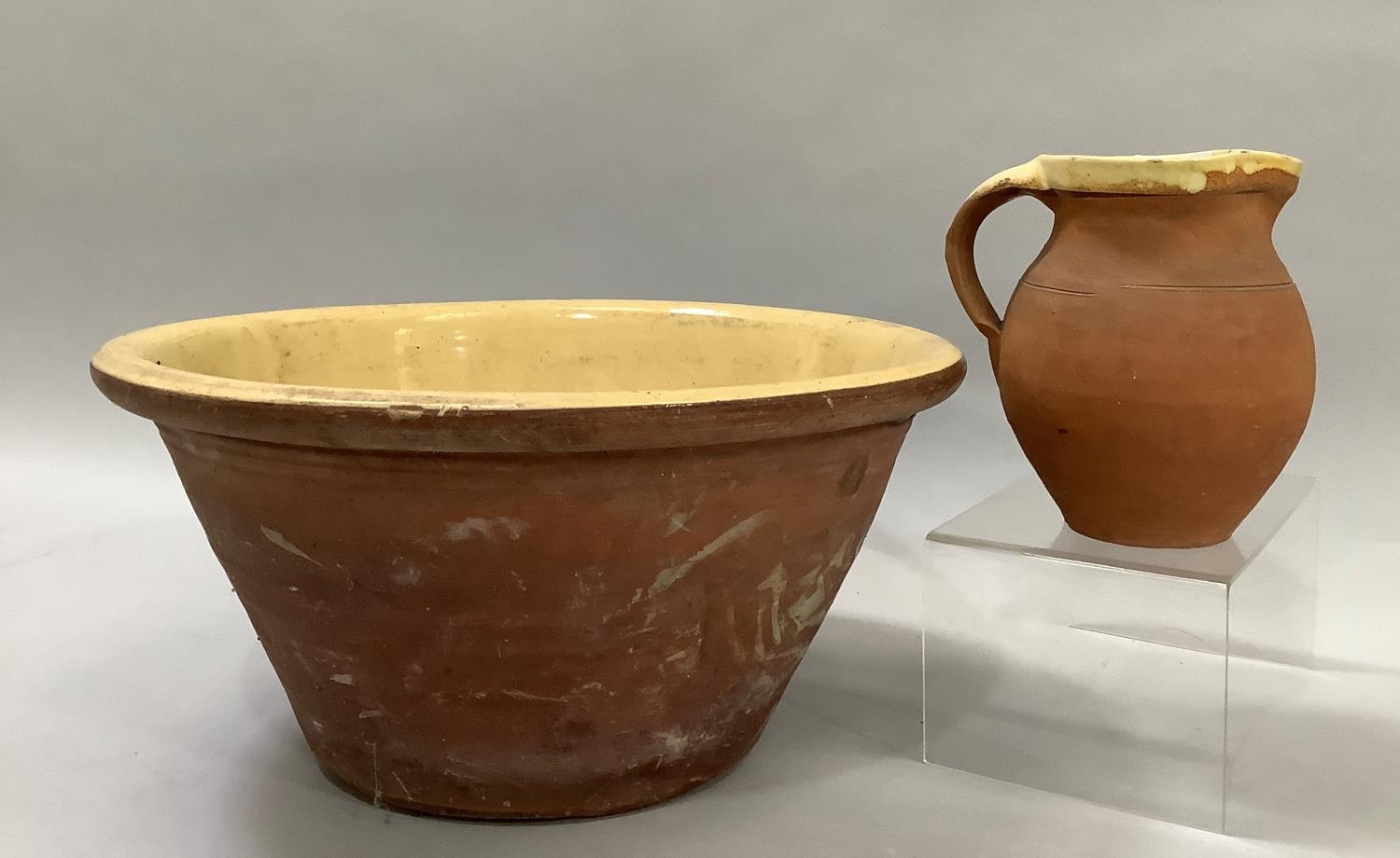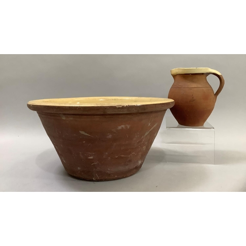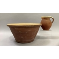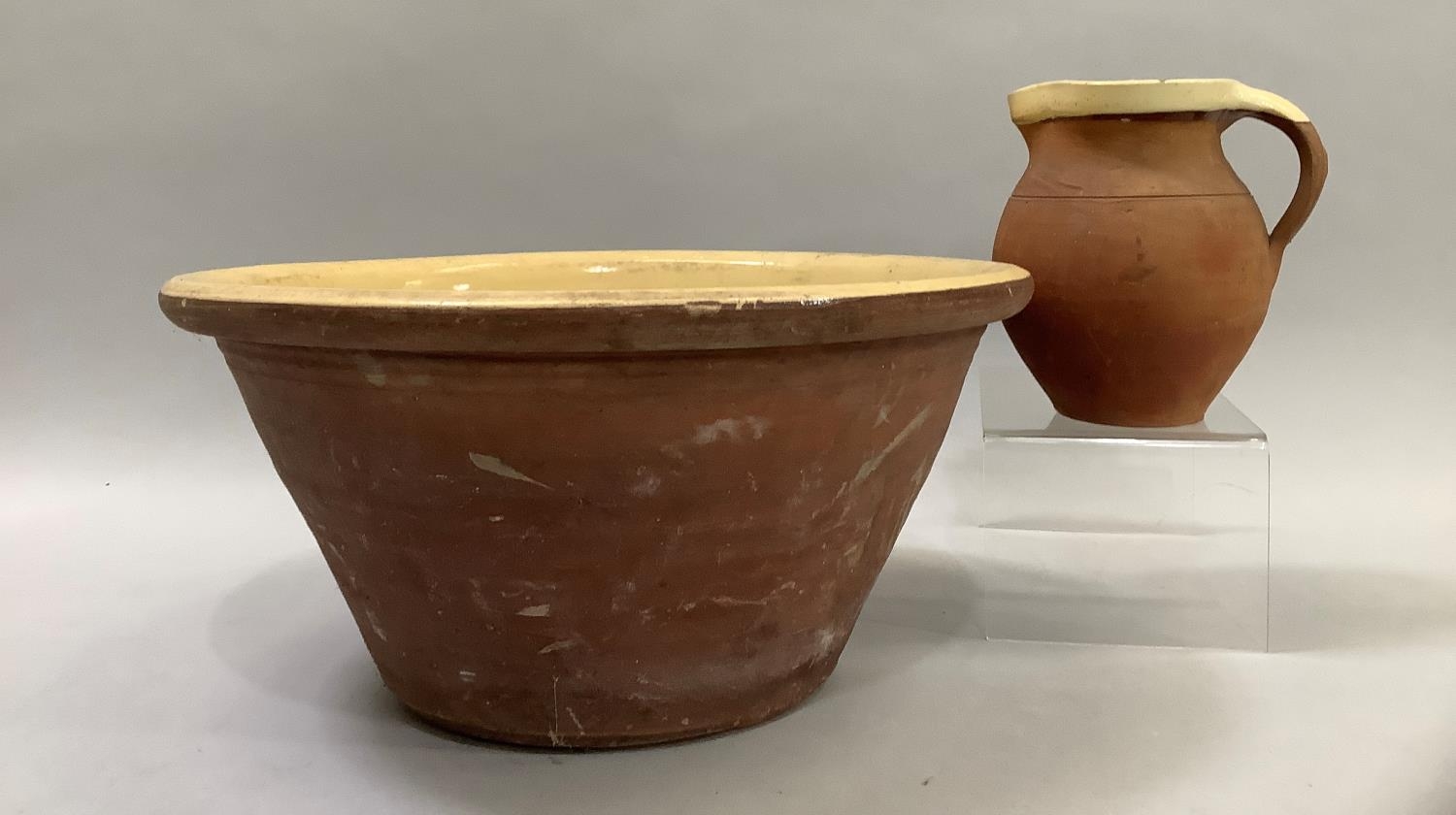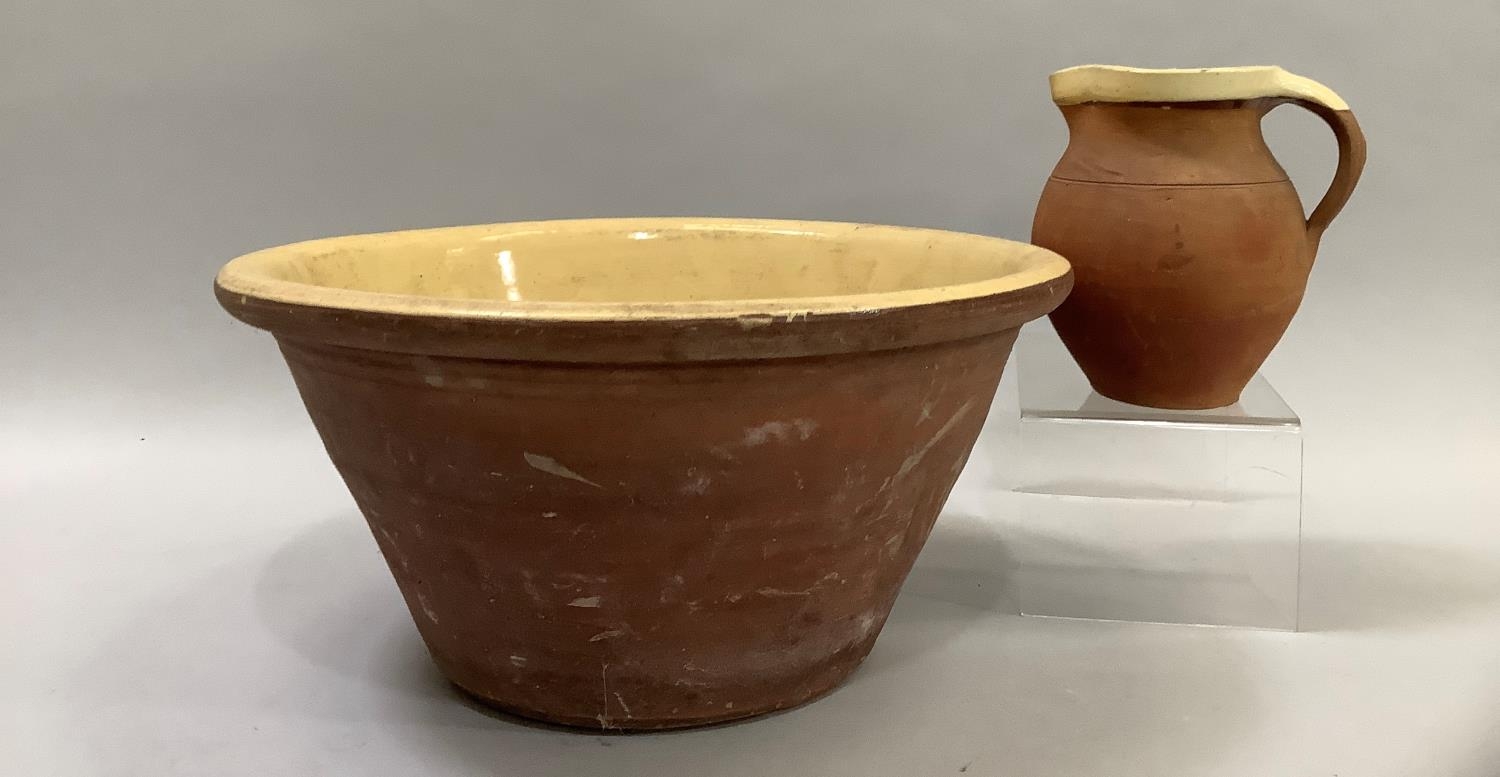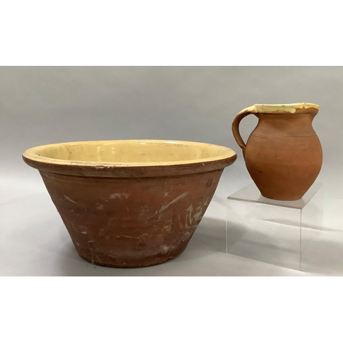 An earthenware pancheon with cream slip to the interior, 38cm diameter x 18cm high, together with a harvest jug of same decoration, 17cm high