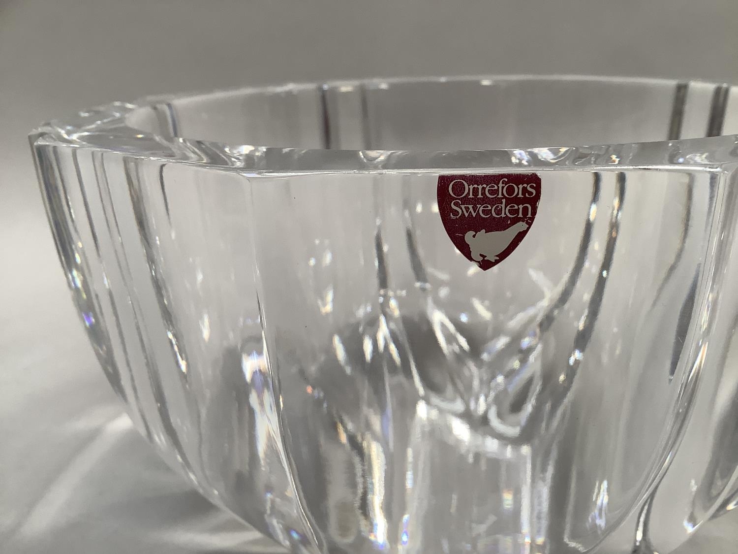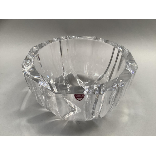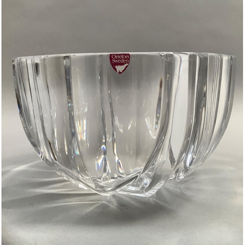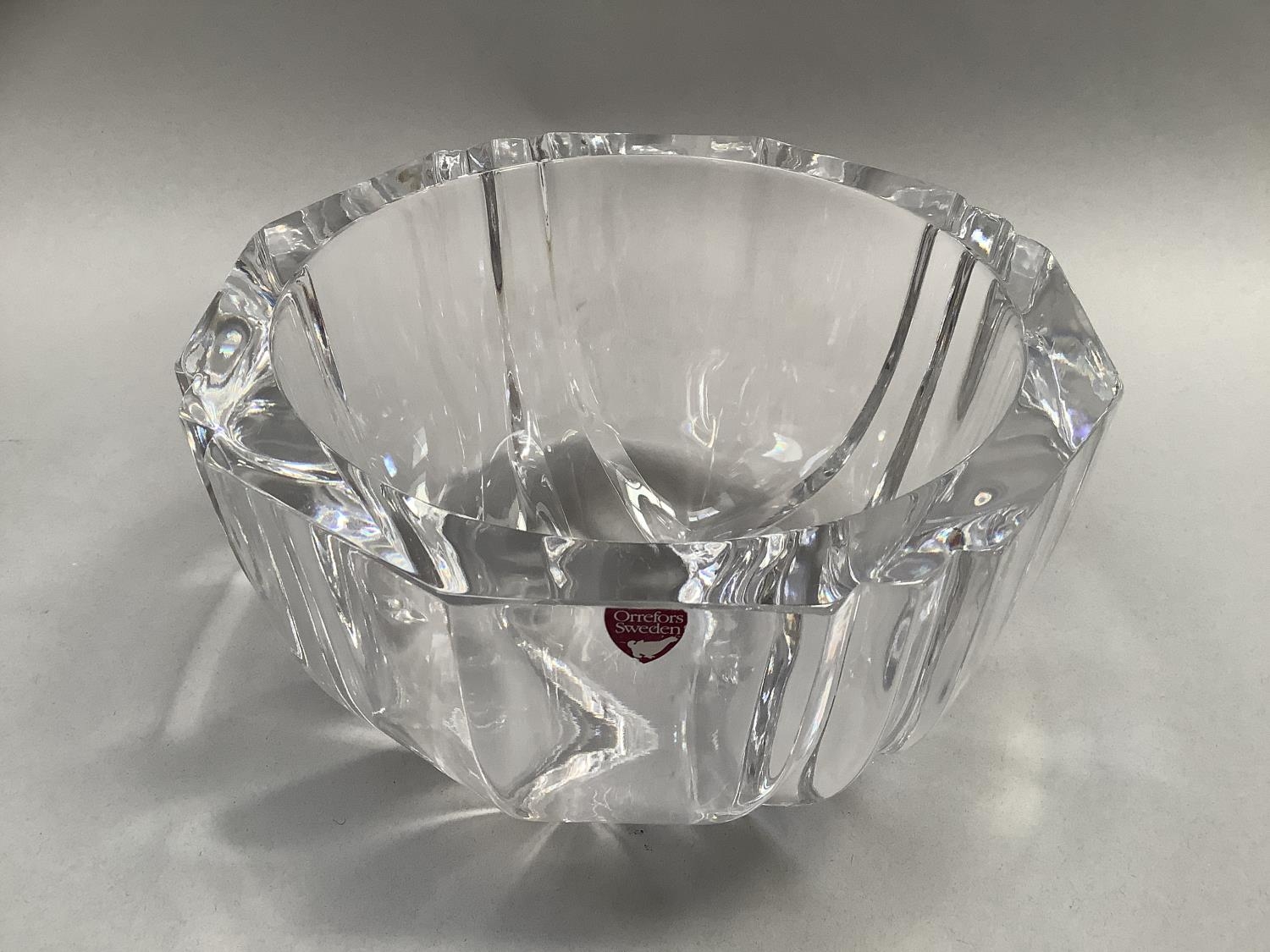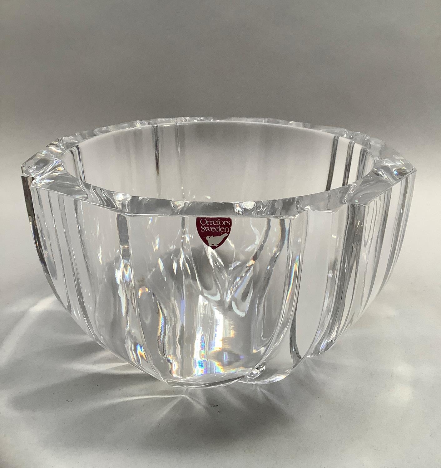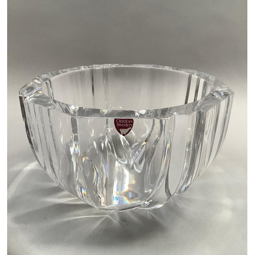 An Orrefors glass bowl, circular, of panelled form, signed to underside Orrefors 1534-131, original label, 18.5cm diameter x 11cm high