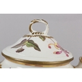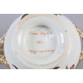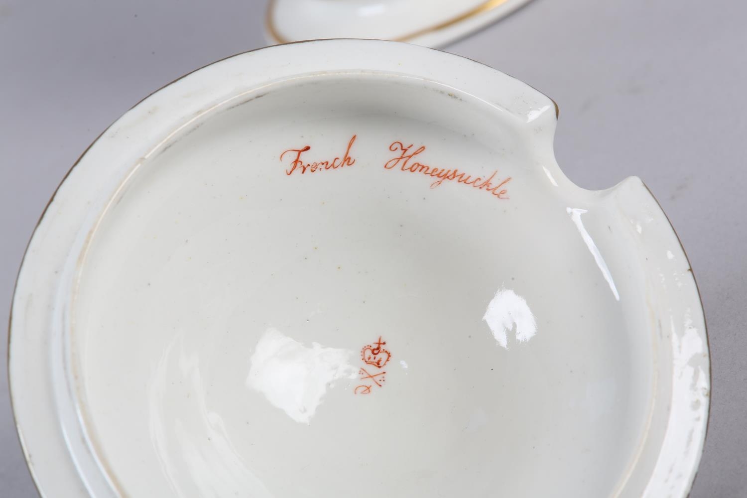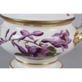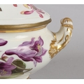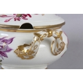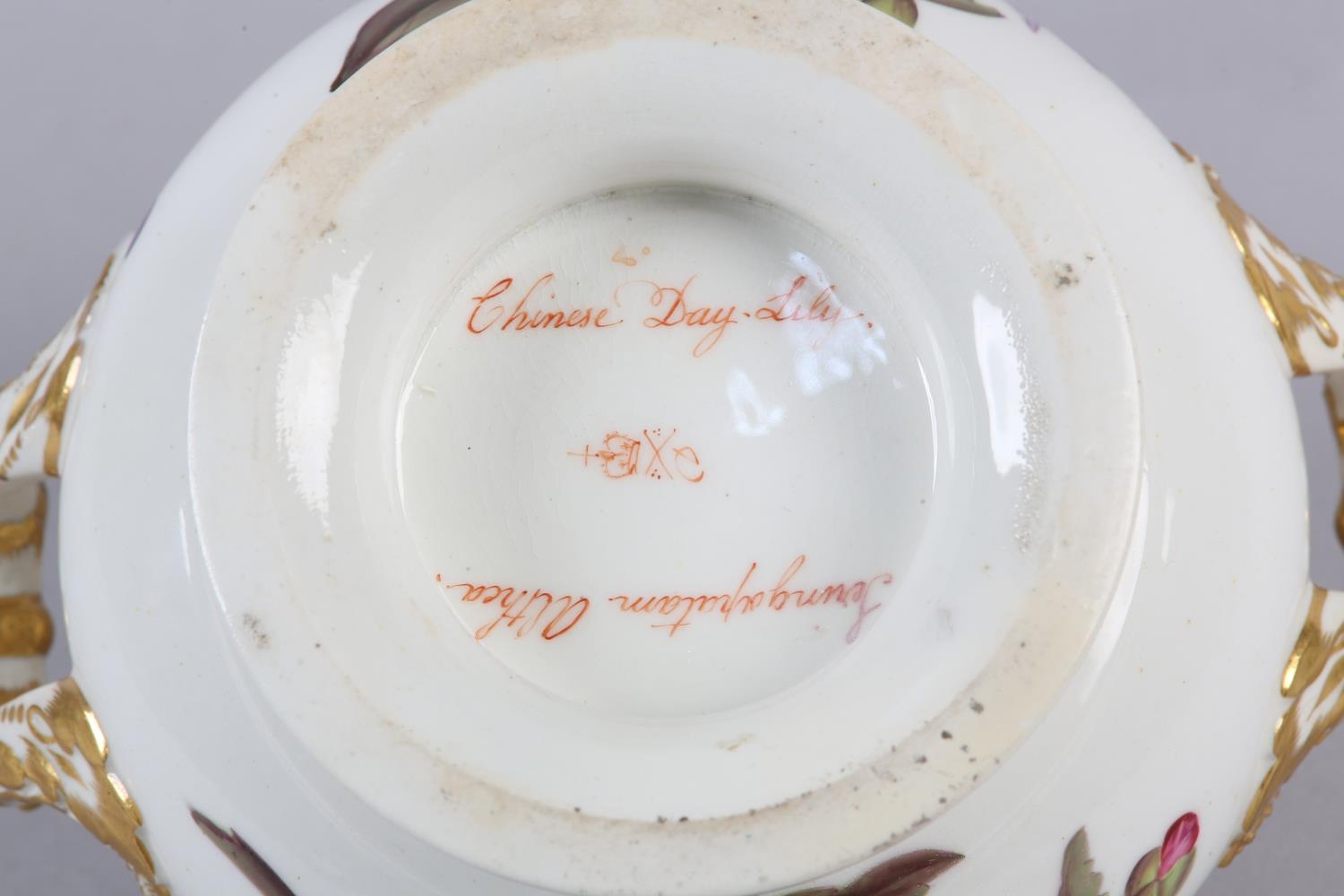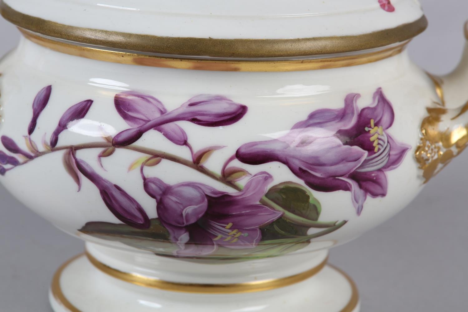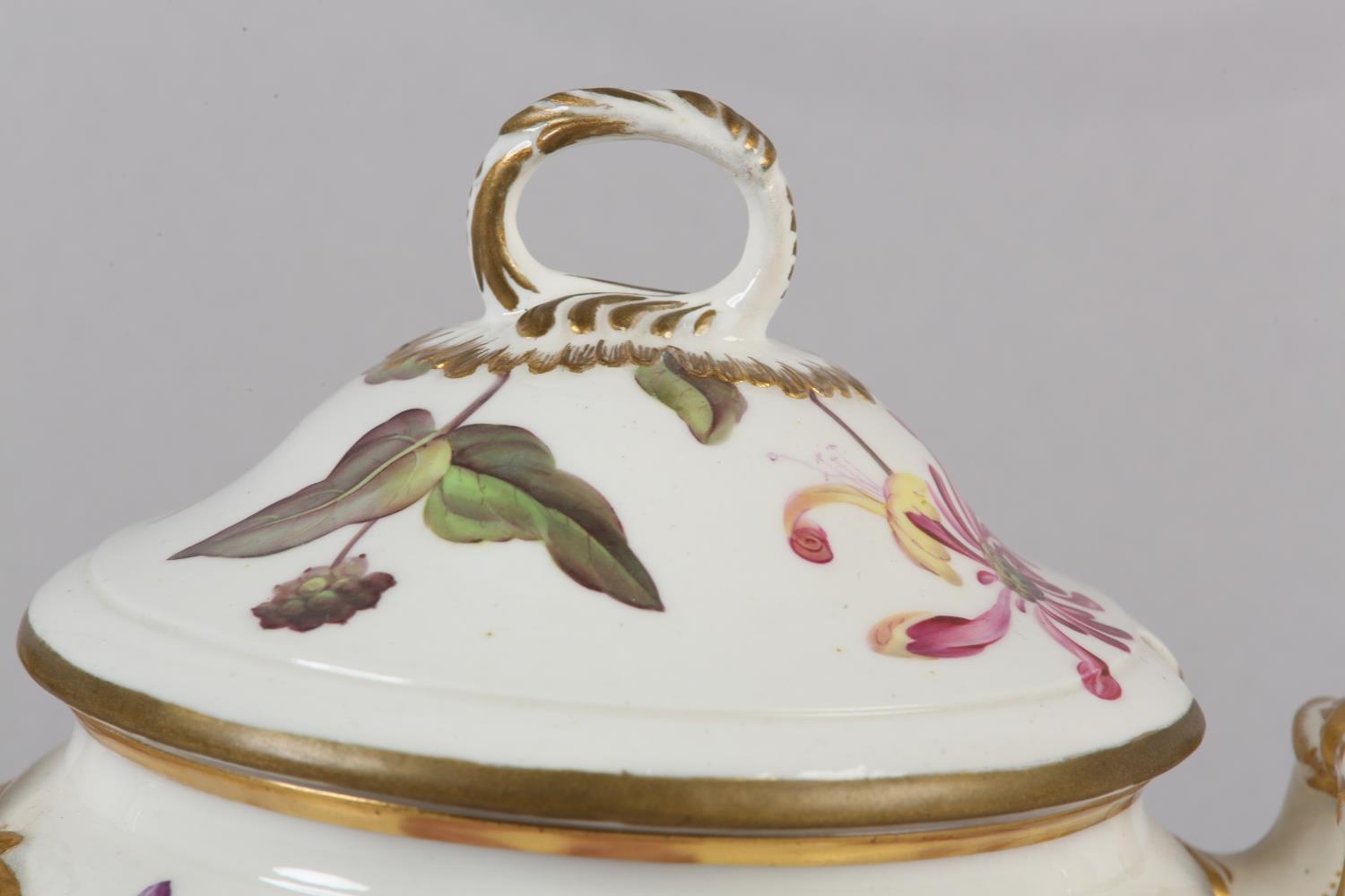 A DERBY PORCELAIN BOTANICAL SAUCE TUREEN AND COVER, c.1815, painted by William Pegg with French Honeysuckle, the bowl with Seringapatam Althea and Chinese Day Lily, titles and mark in red, 18cm wide over handles x 16cm high (rim and handle restored)