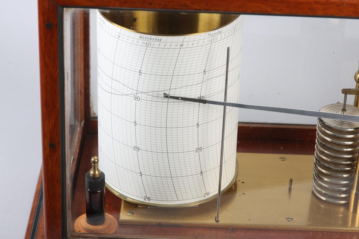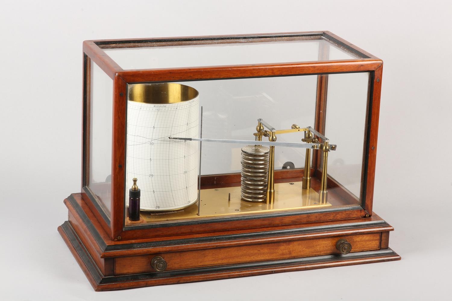 A LARGE BAROGRAPH BY BAILEY OF BIRMINGHAM, in mahogany and ebonised glazed case with drawer to base, 49cm wide x 26cm deep x 32cm high