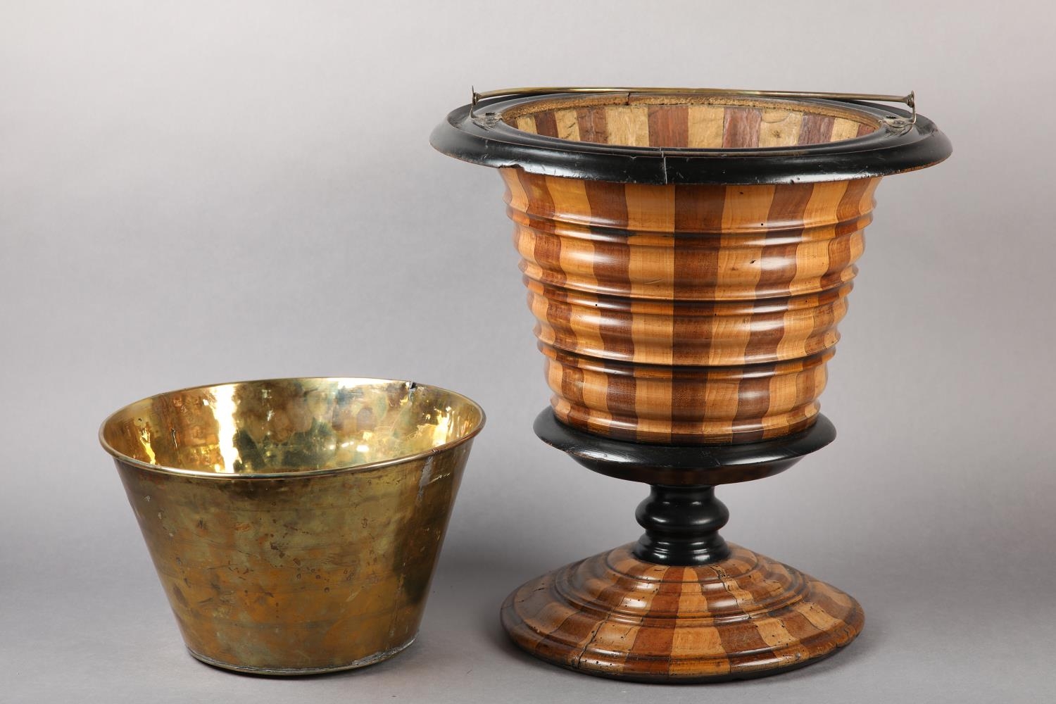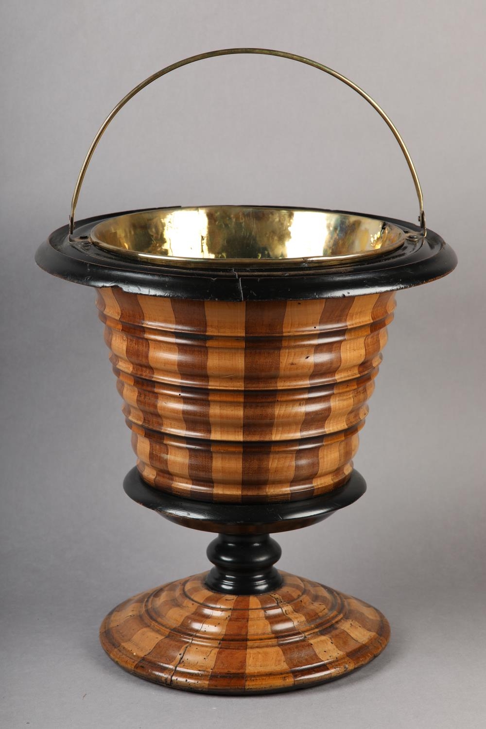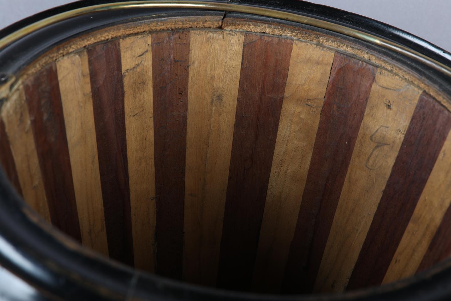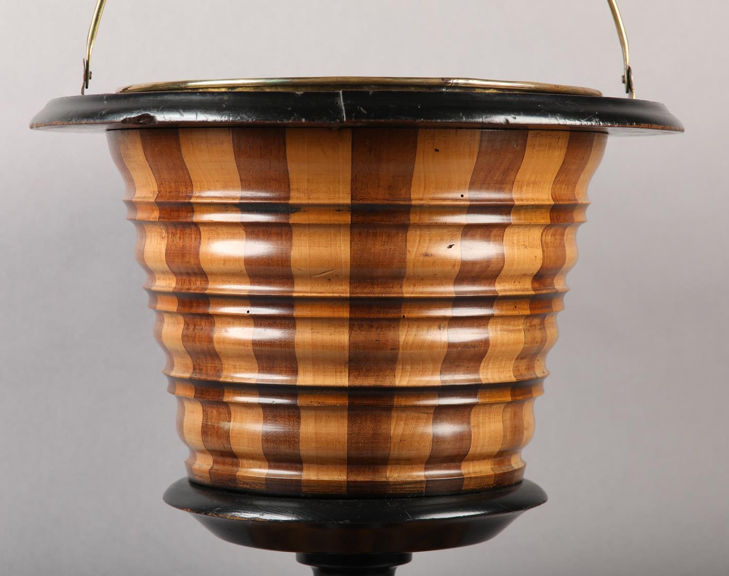 AN EARLY 19TH CENTURY DUTCH 'TEESTOFF', of alternating fruit wood staves with ebony rim and pedestal, brass liner with hoop handle, 38cm diameter x 38cm high. Teestoff is a tea stove bucket for hot coals.