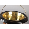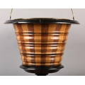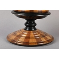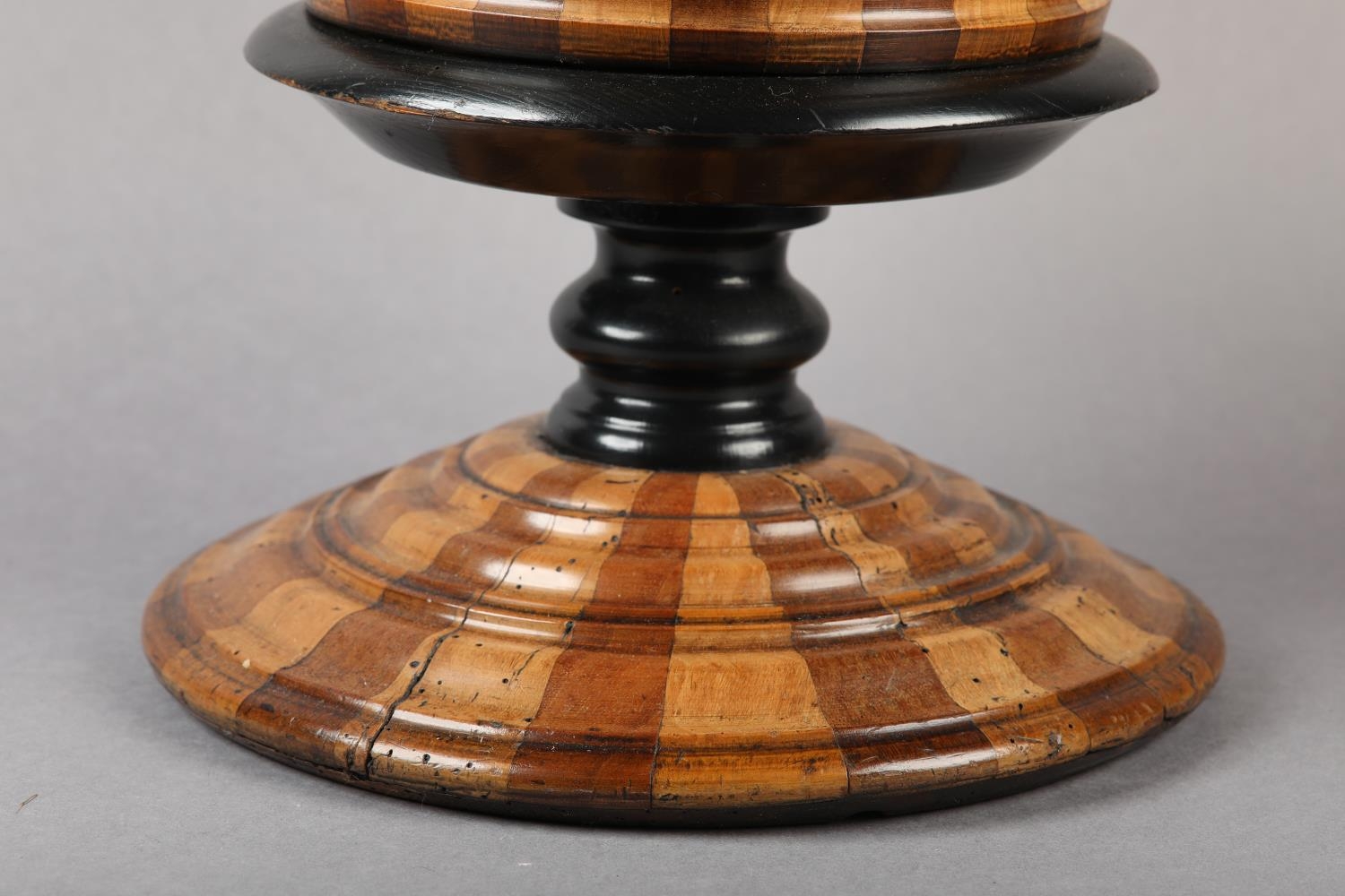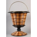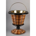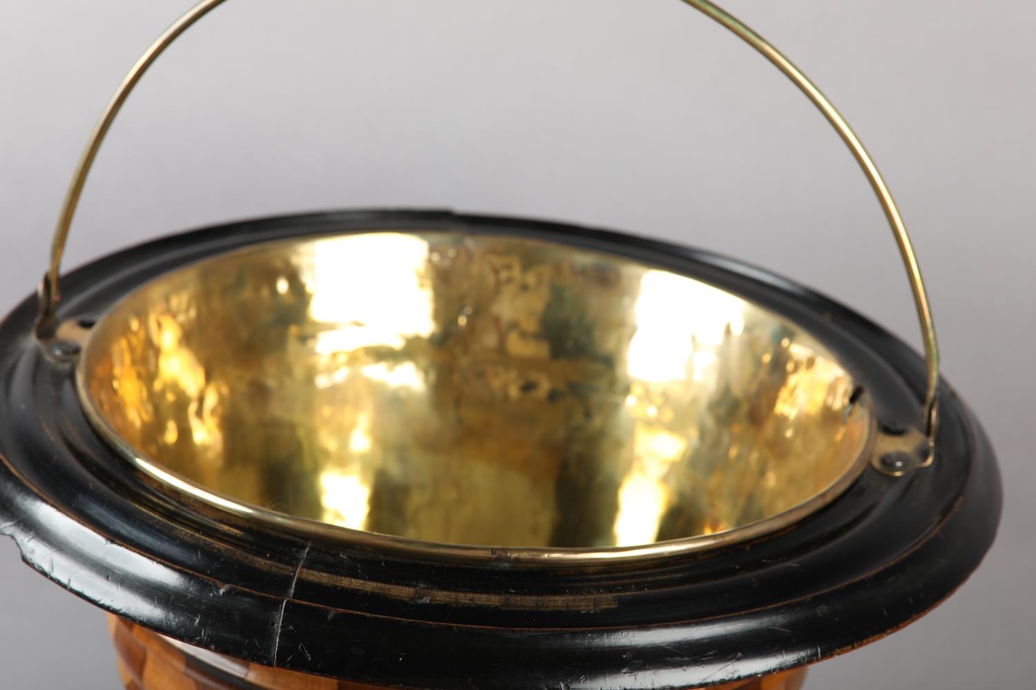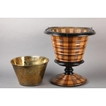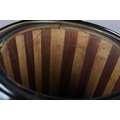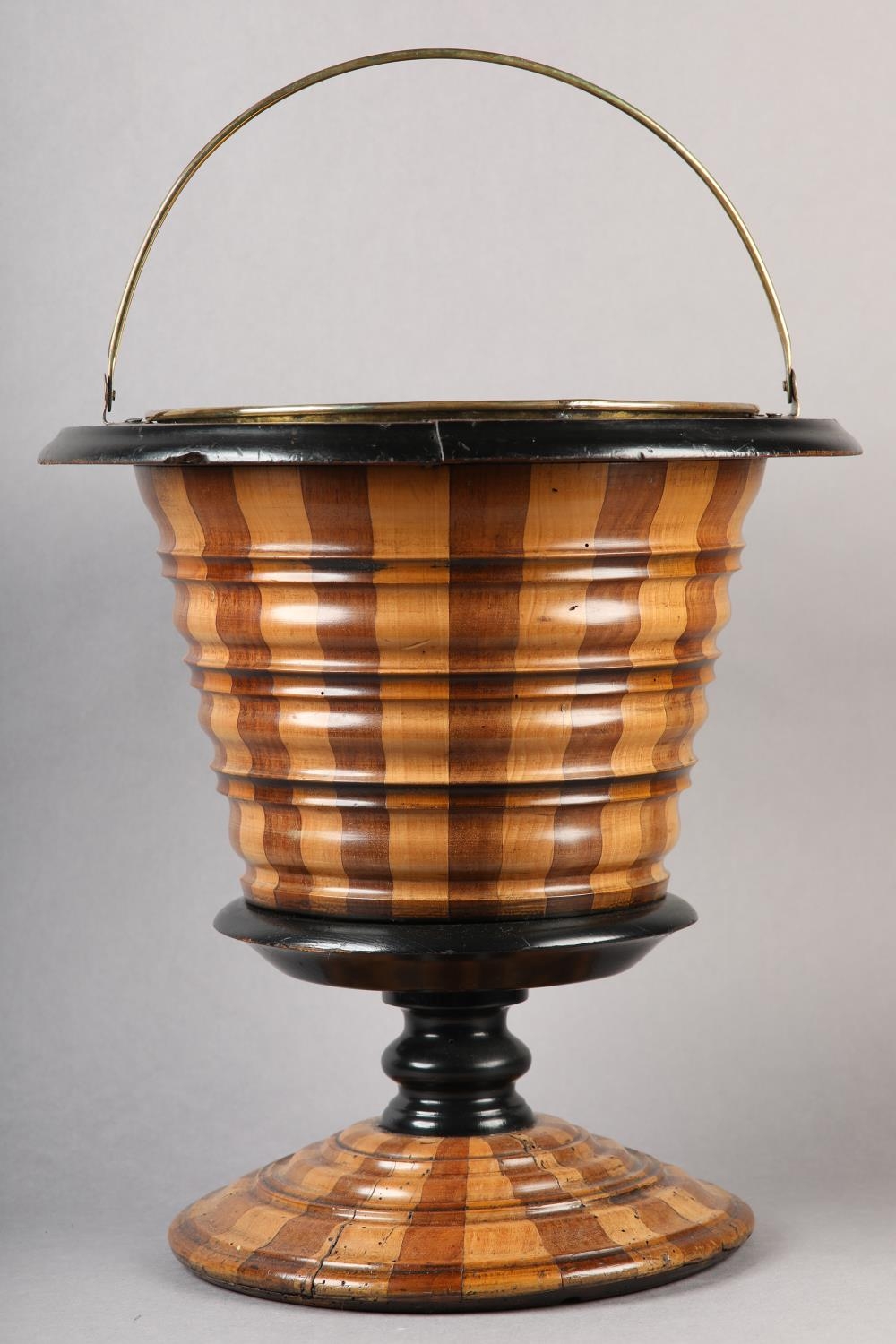 AN EARLY 19TH CENTURY DUTCH 'TEESTOFF', of alternating fruit wood staves with ebony rim and pedestal, brass liner with hoop handle, 38cm diameter x 38cm high. Teestoff is a tea stove bucket for hot coals.