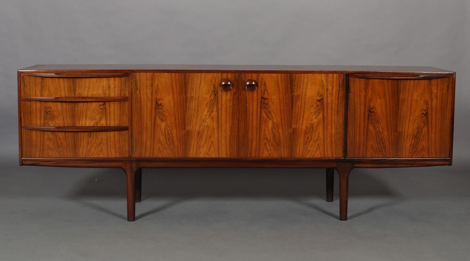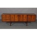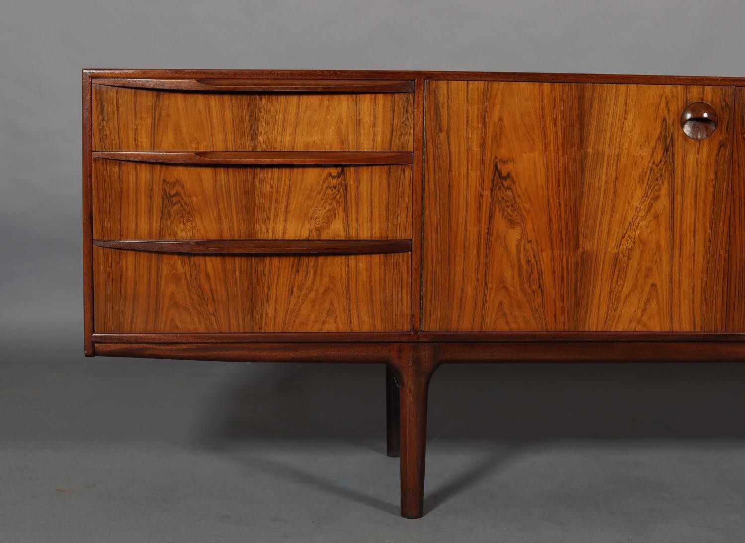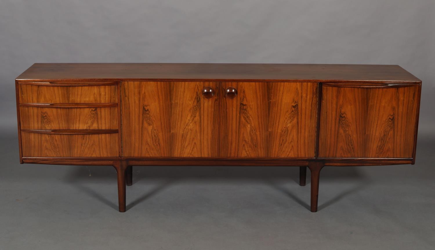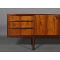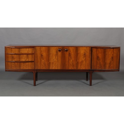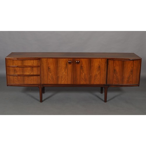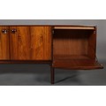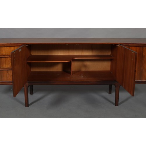 Maclntosh of Kirkcaldy, c1969, An Australian walnut sideboard, two door cupboard, three drawers, a pull out slide and drop front, on tapered legs, 214cm wide x 46cm deep x 75cm high