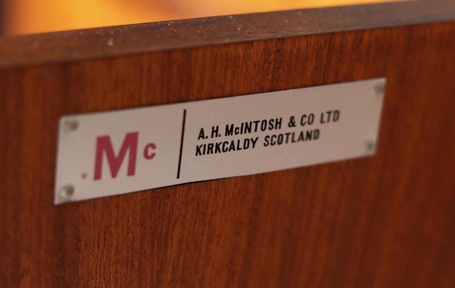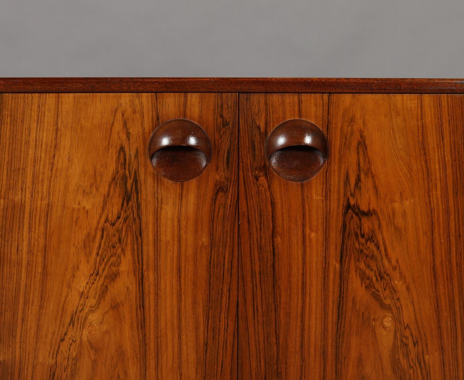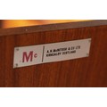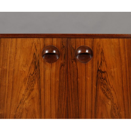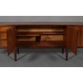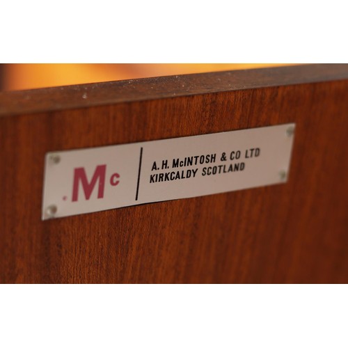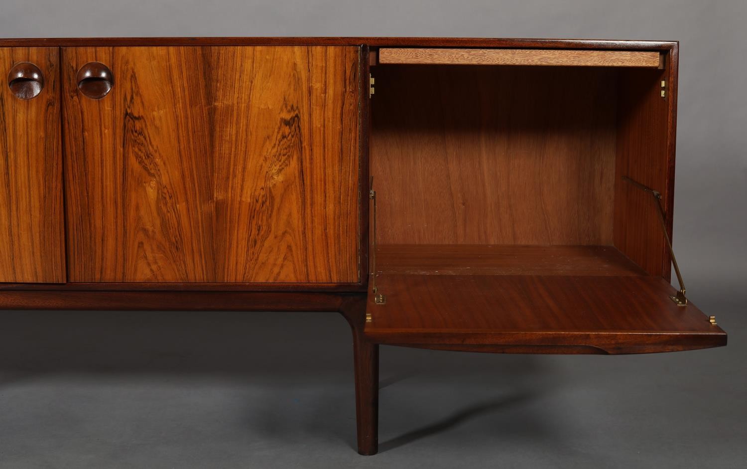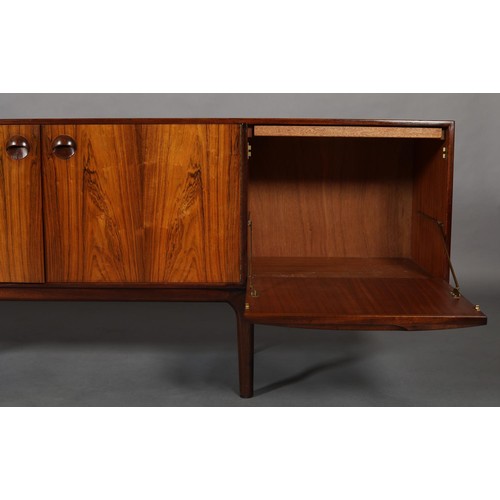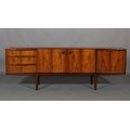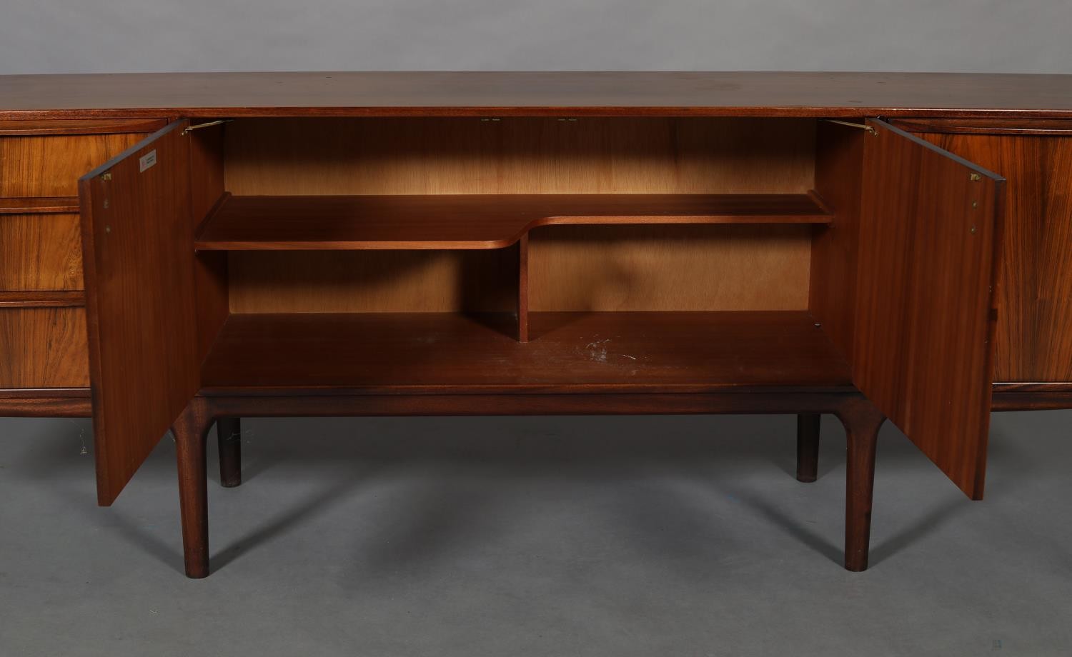 Maclntosh of Kirkcaldy, c1969, An Australian walnut sideboard, two door cupboard, three drawers, a pull out slide and drop front, on tapered legs, 214cm wide x 46cm deep x 75cm high