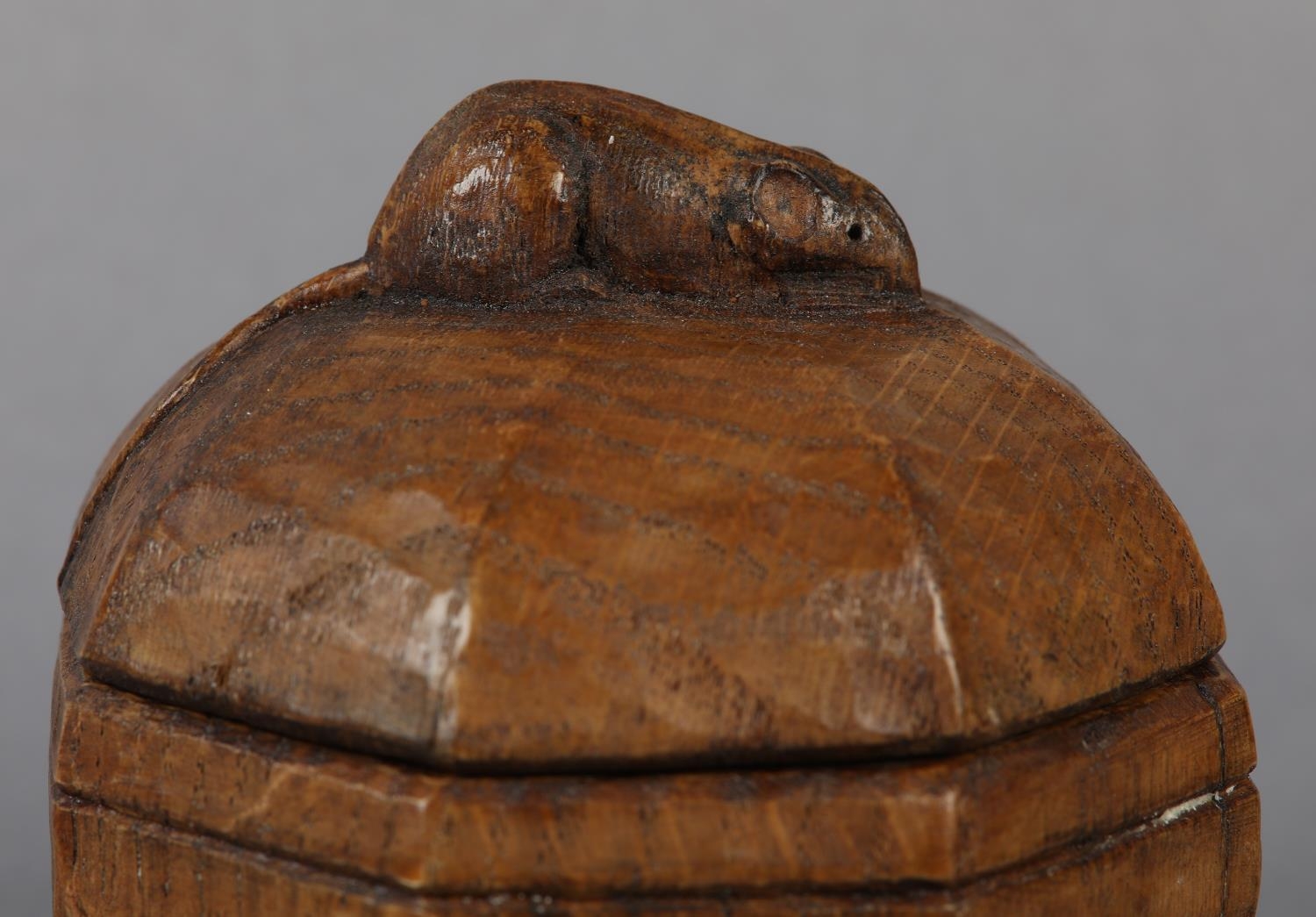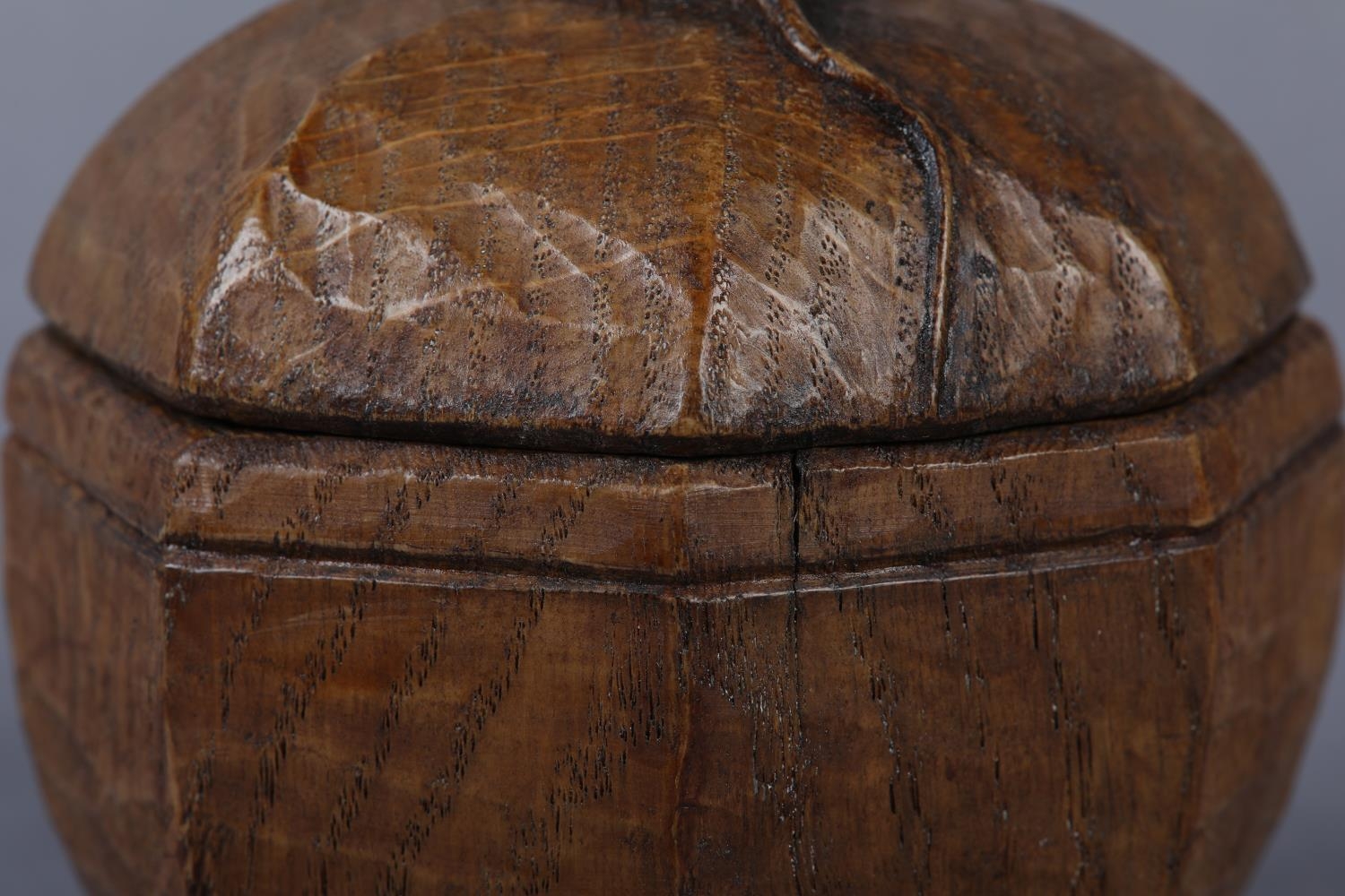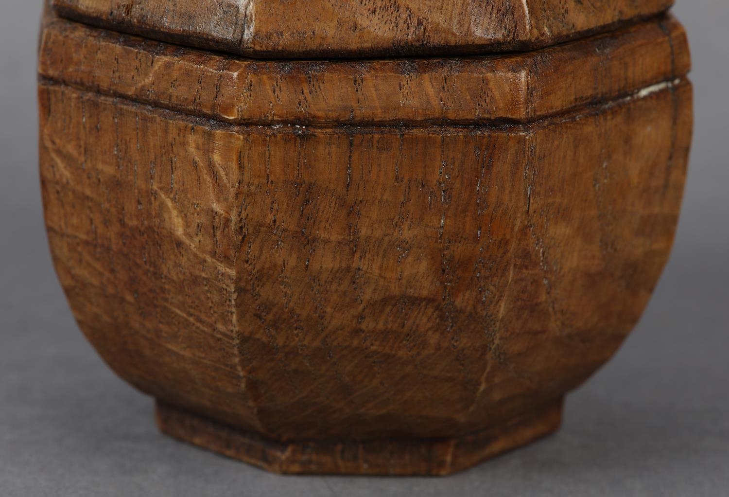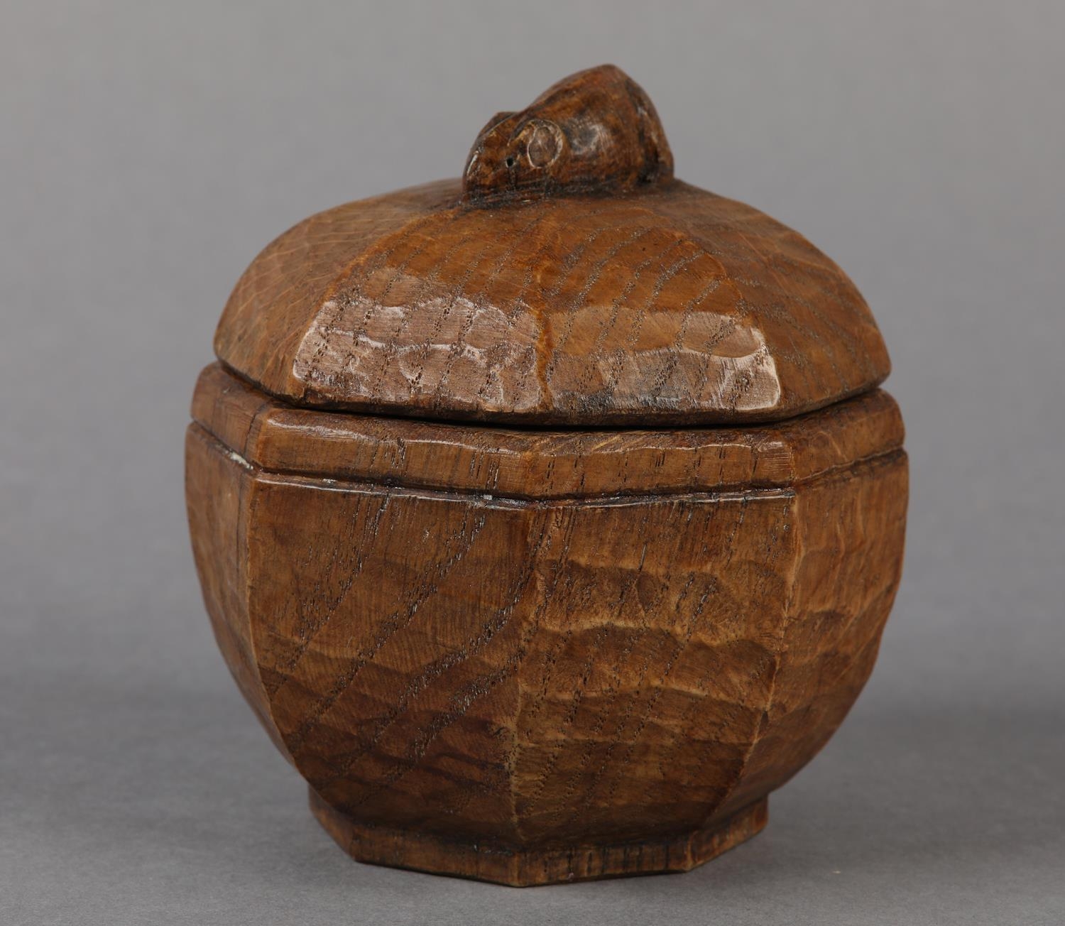 THOMPSON OF KILBURN 'MOUSEMAN' box and cover in English oak, the octagonal form with mouse finial carved in high relief, 9.5cm diameter x 12cm high