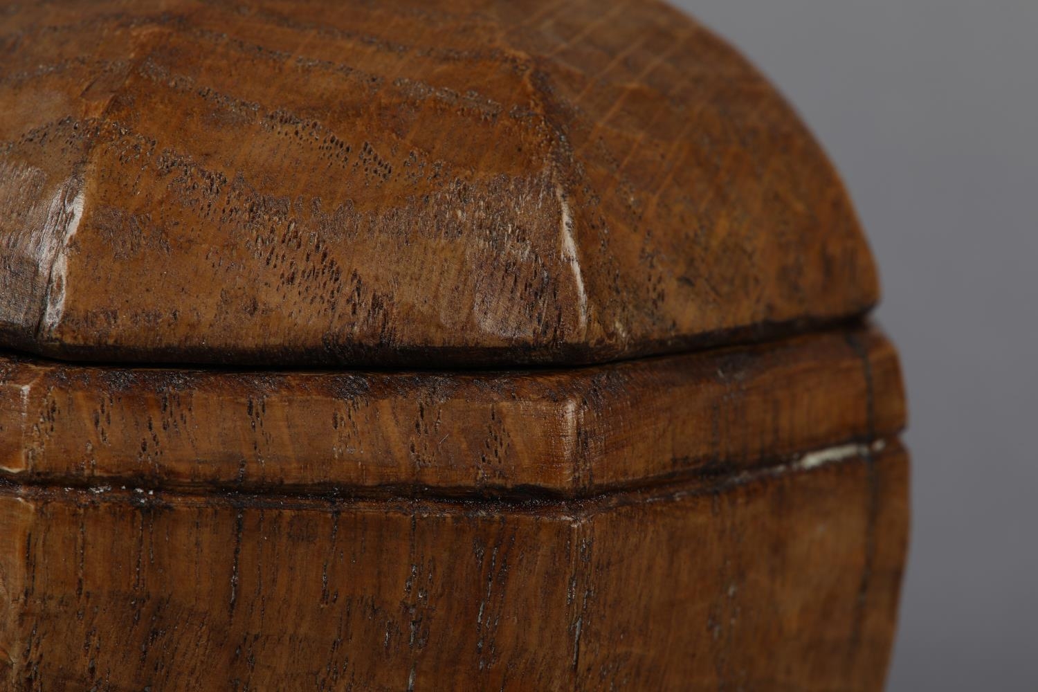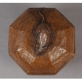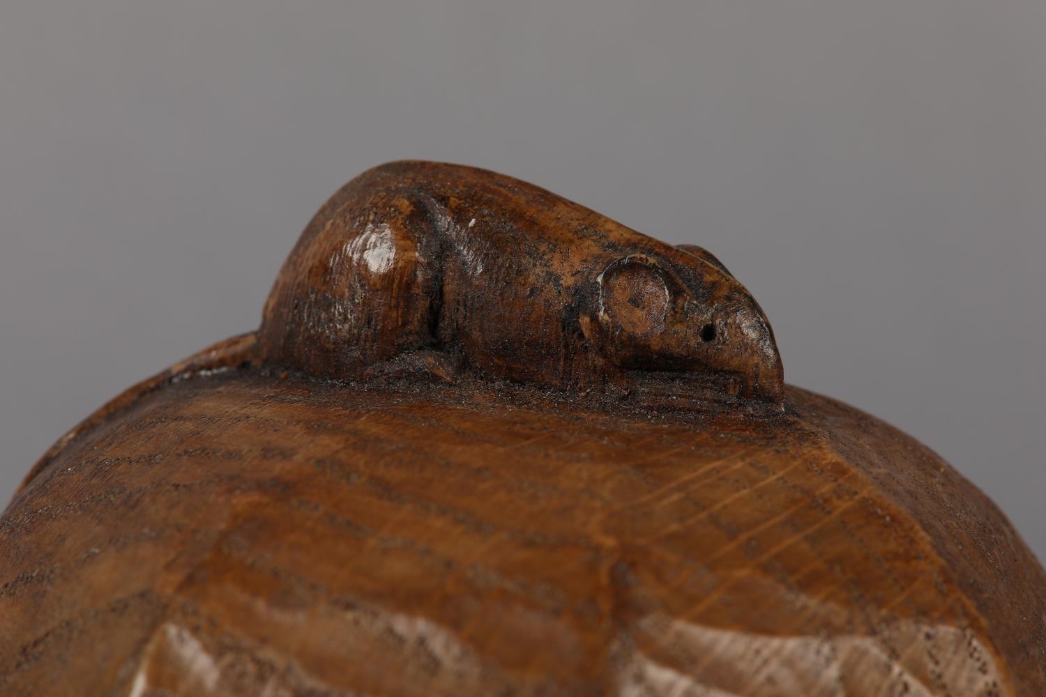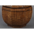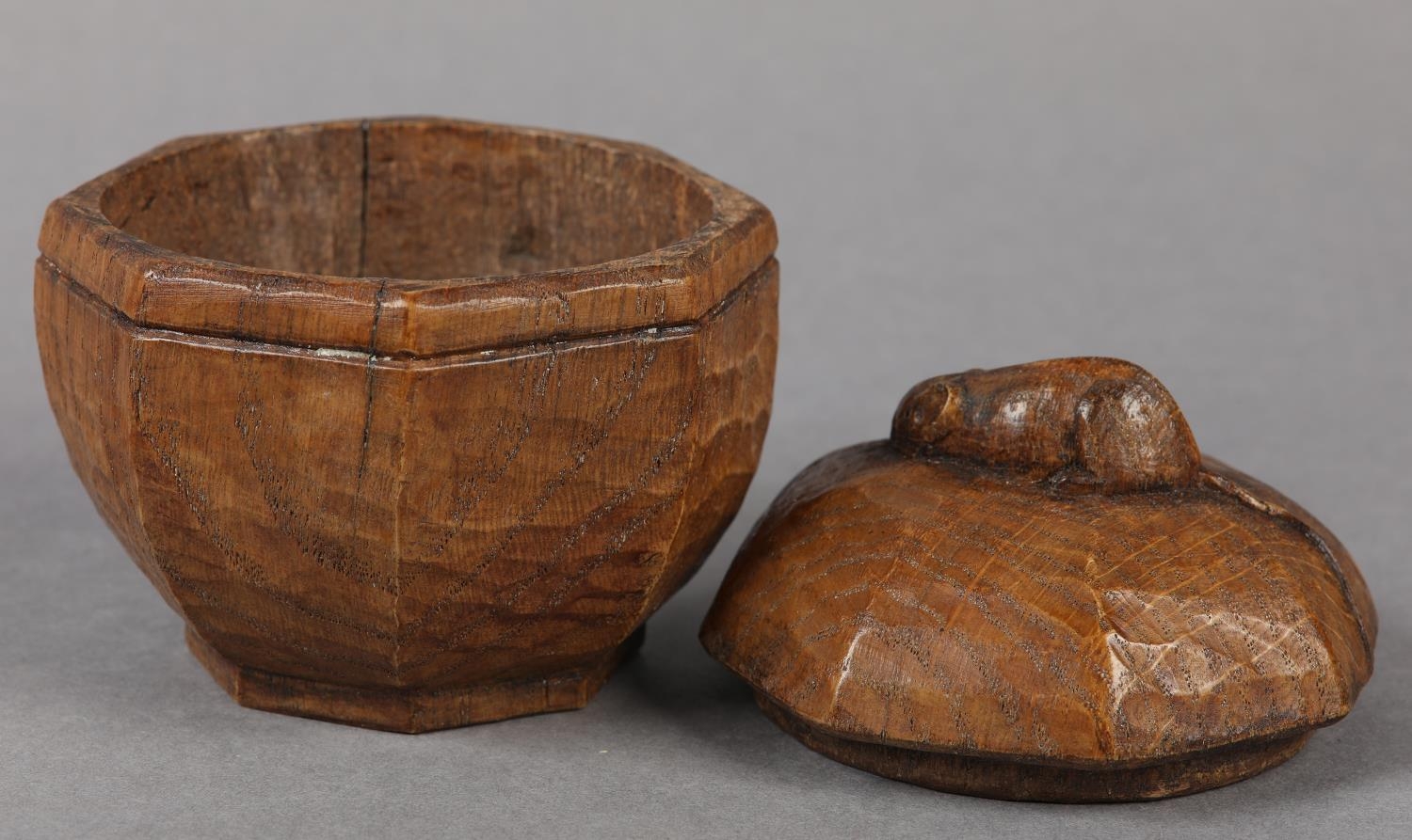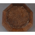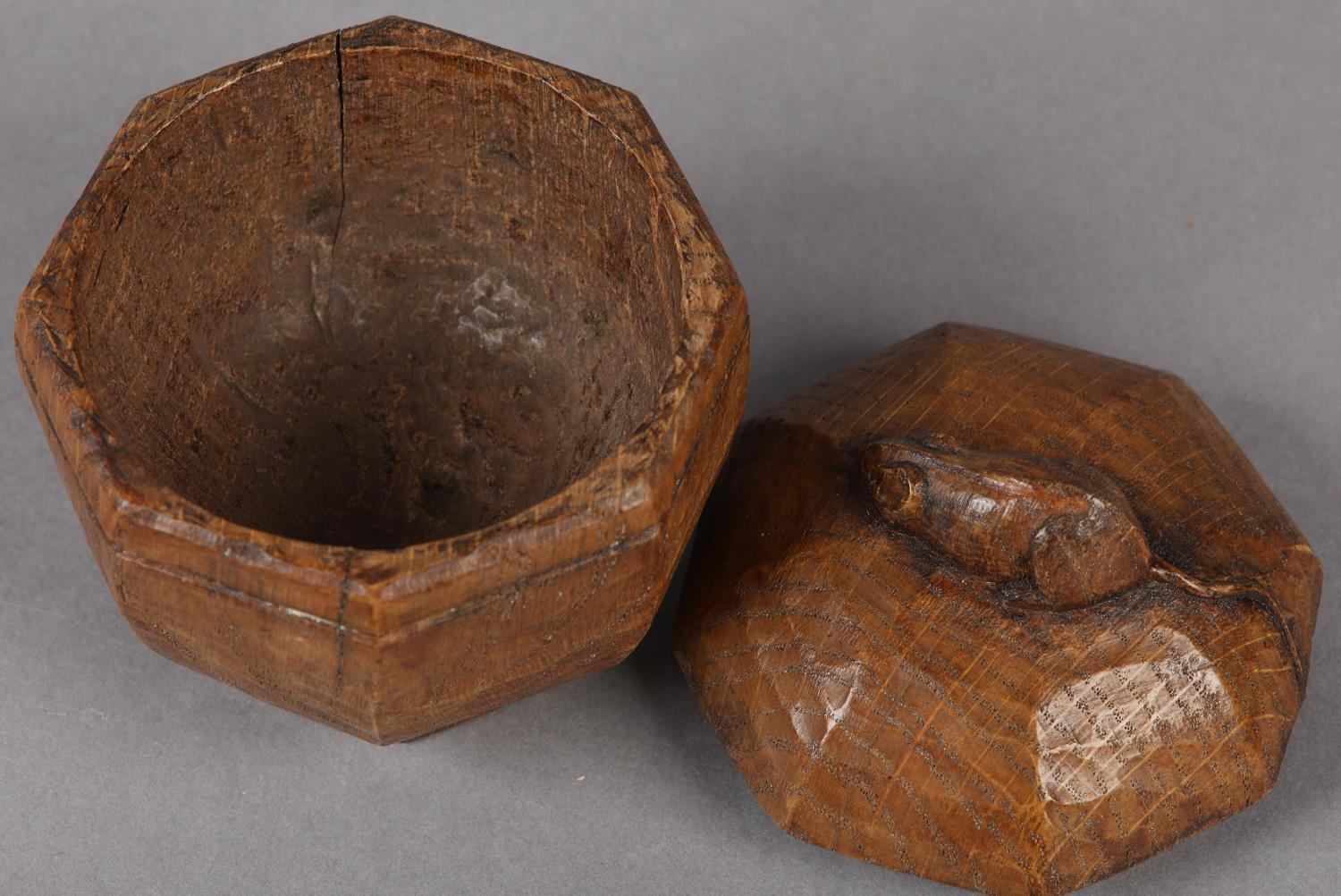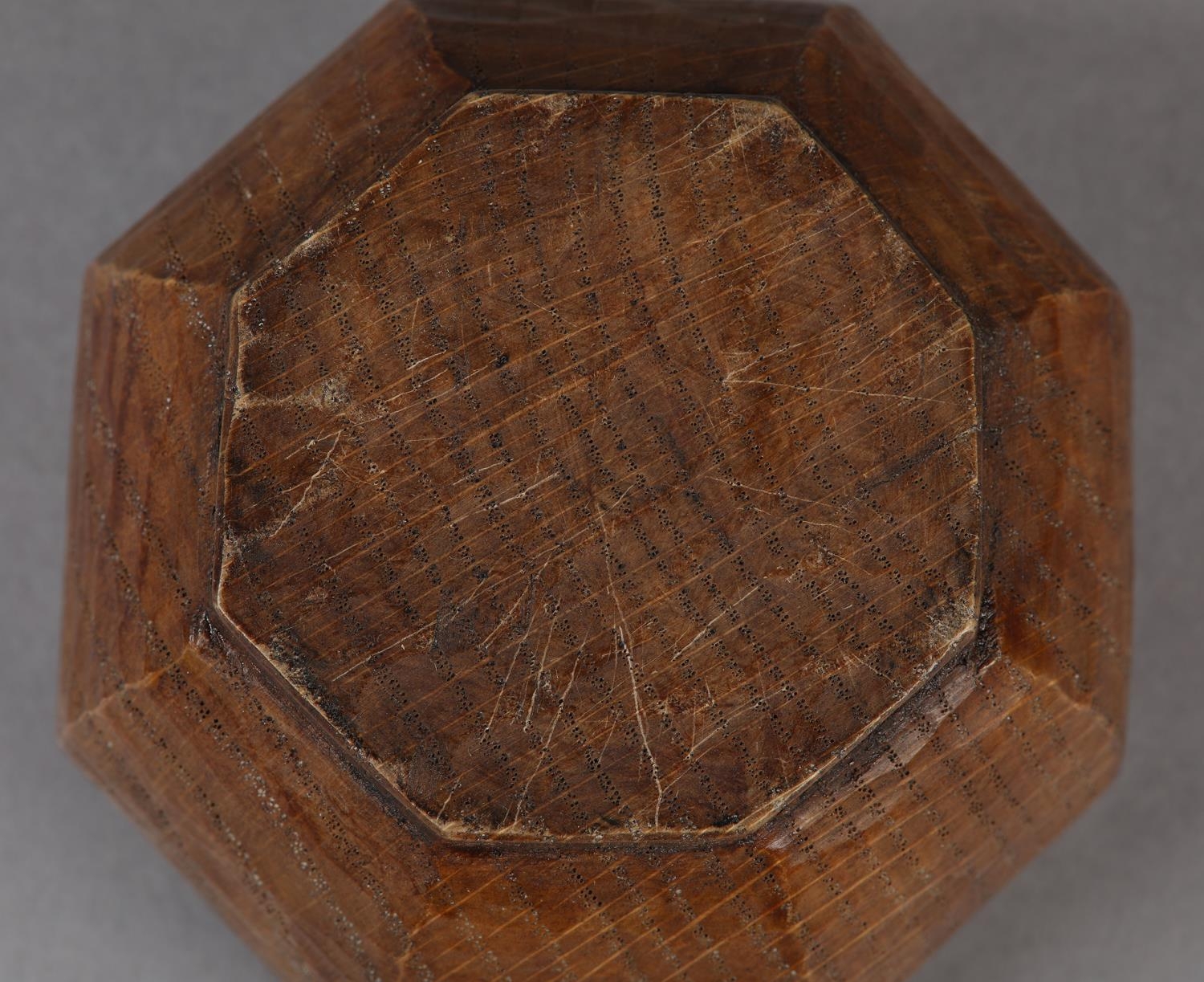 THOMPSON OF KILBURN 'MOUSEMAN' box and cover in English oak, the octagonal form with mouse finial carved in high relief, 9.5cm diameter x 12cm high