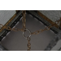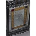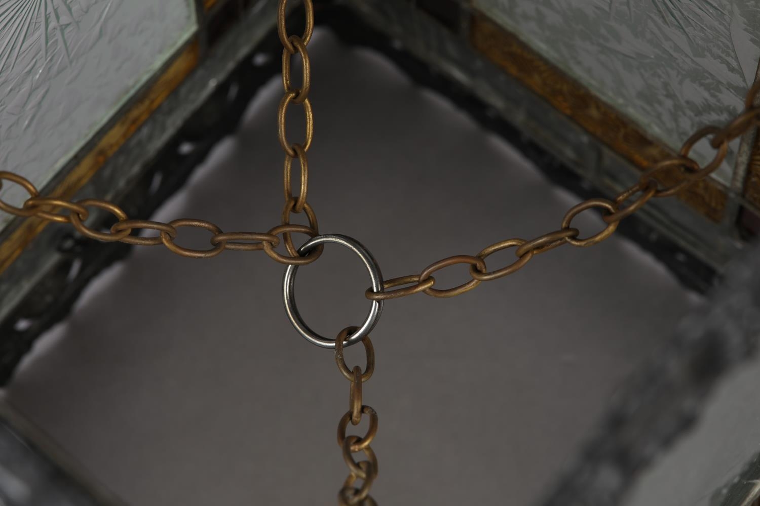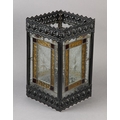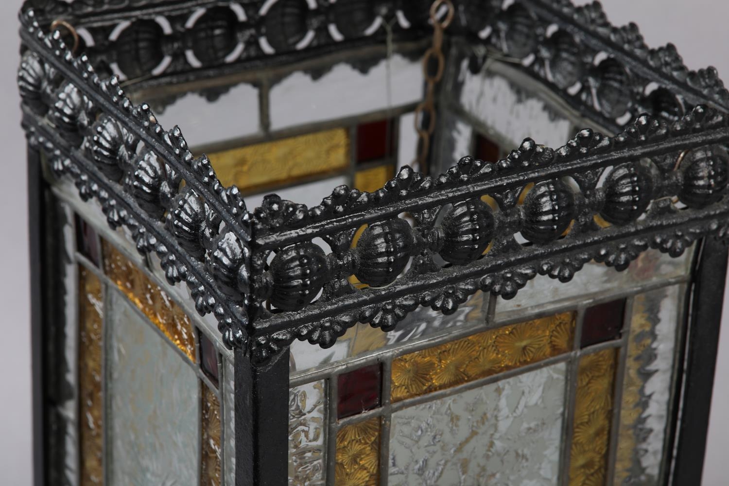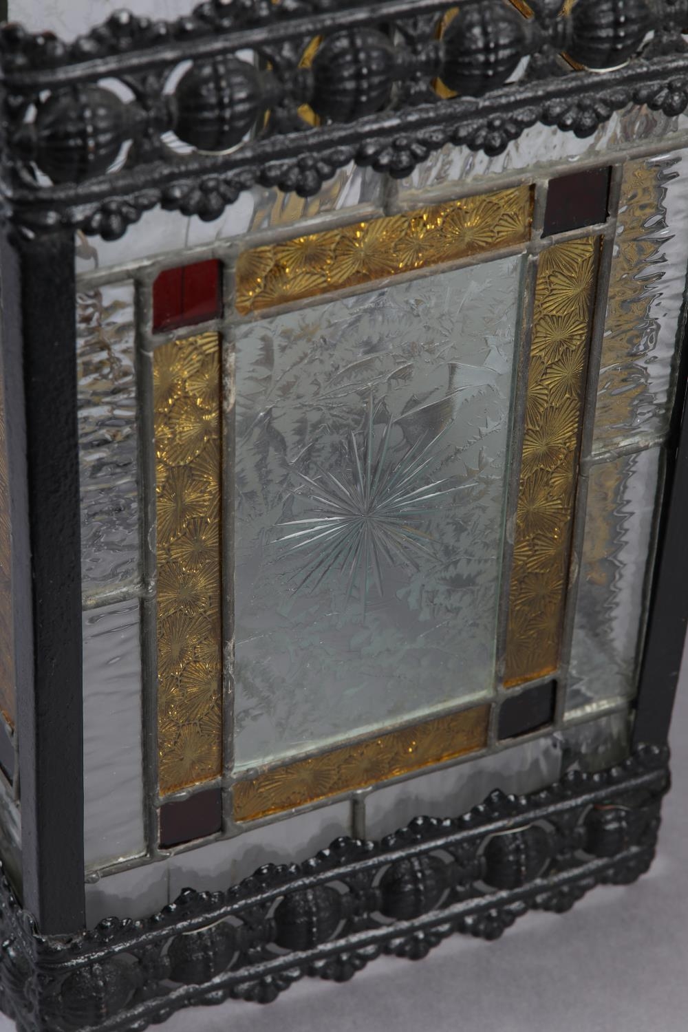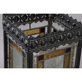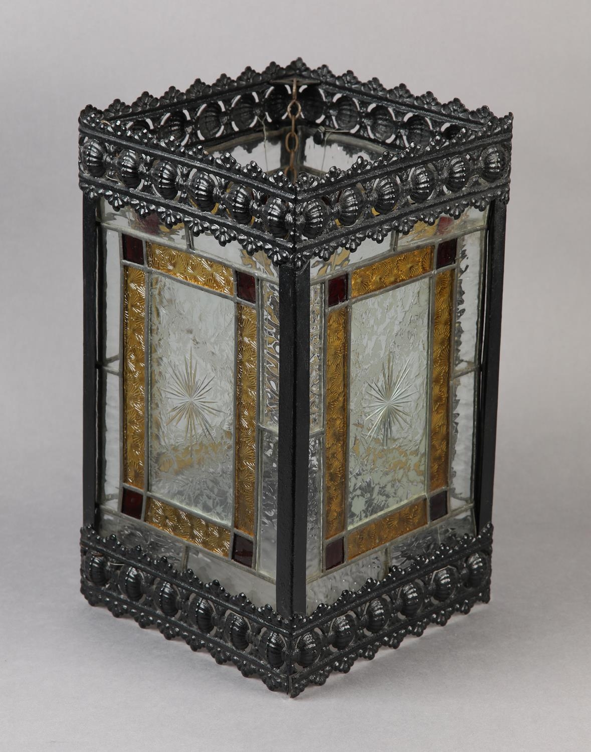 A VICTORIAN BLACK JAPANNED LANTERN, the pressed metal frame with clear and coloured glass panels, of square outline, 21cm square x 35.5cm high