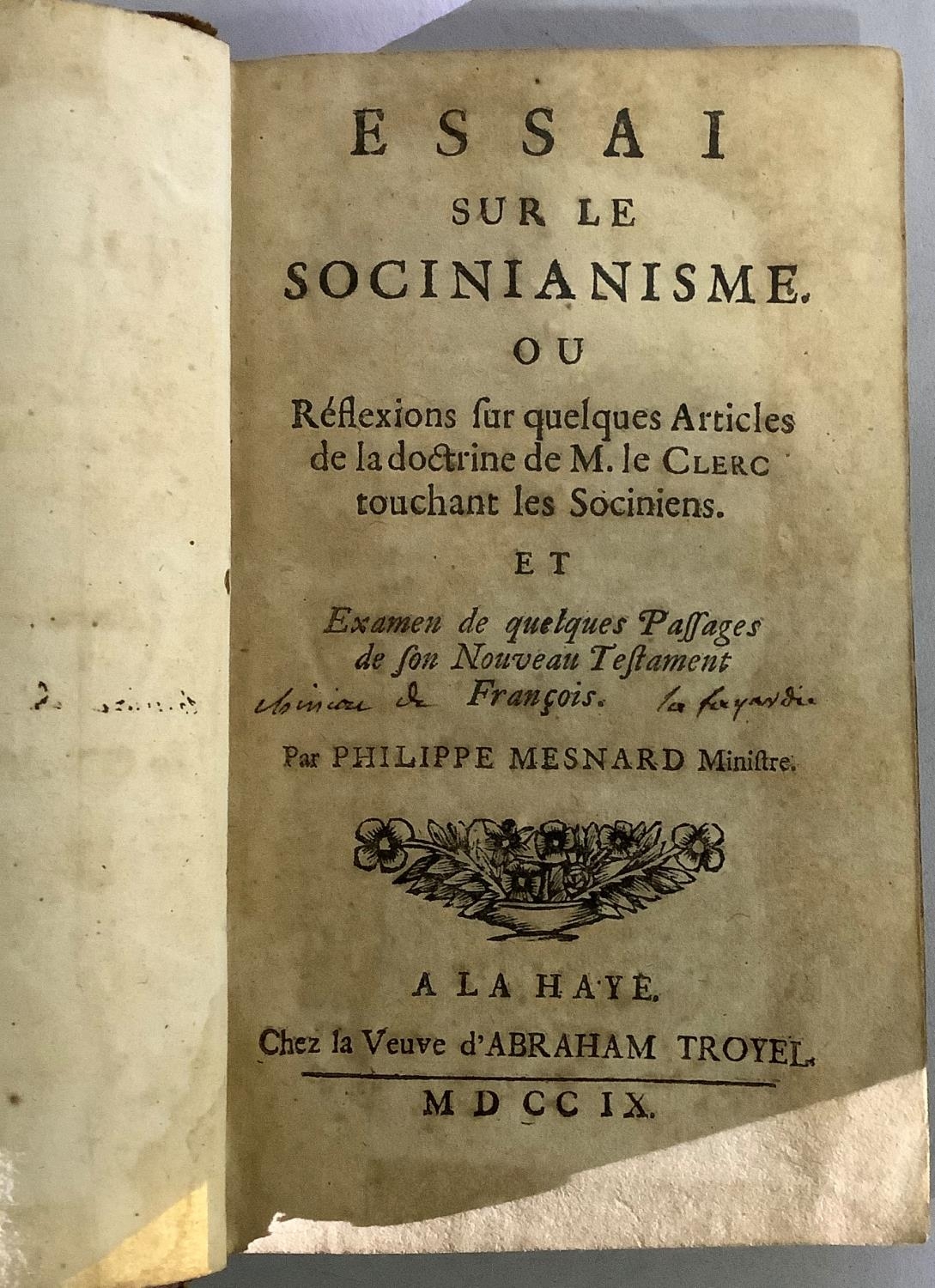 MESNARD, PHILIPPE - Essai sur le Socinianisme, pub. La Veuve d'Abraham Troyel, 1709, engraved to title page, indistinct inscription to title page in ink 'la fayardie?', full calf, red title and gilt tooling to spine