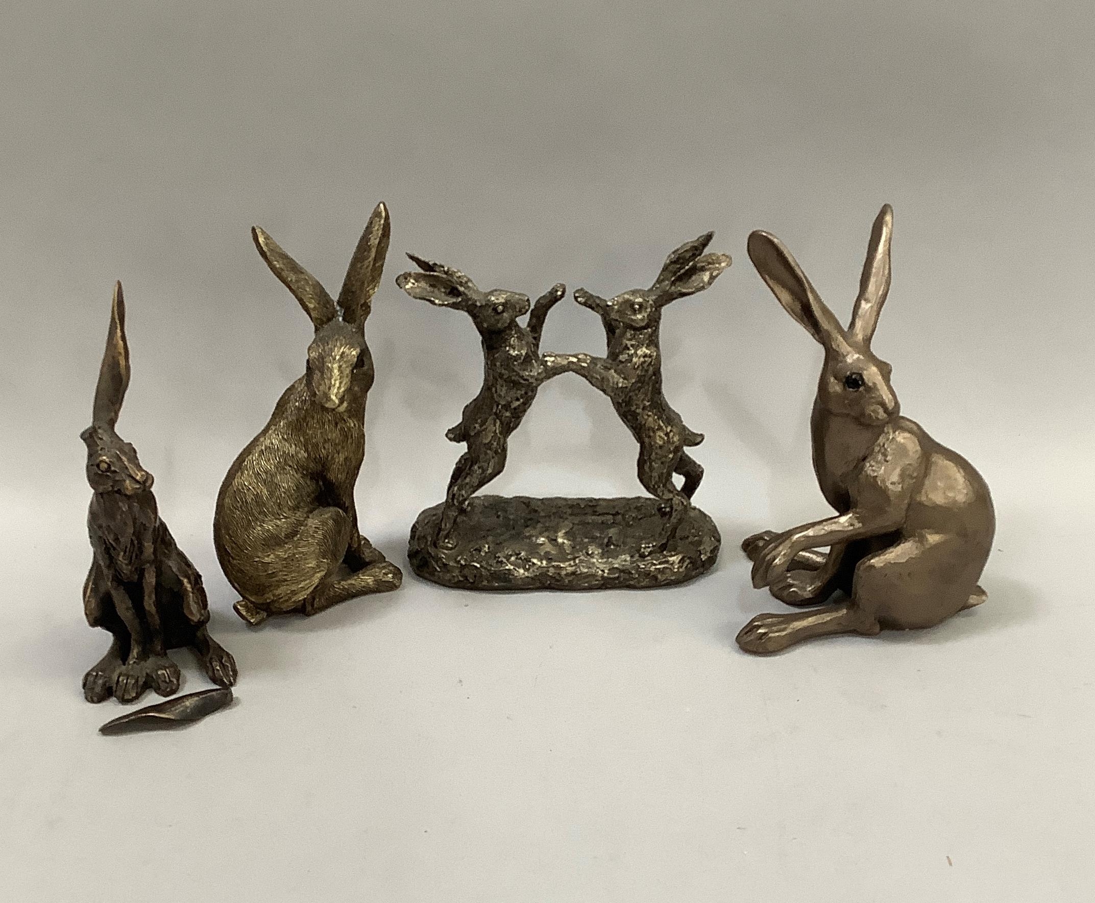 A model of two hares fighting and three other models of hares, two with restoration or damage
