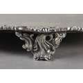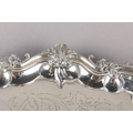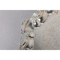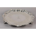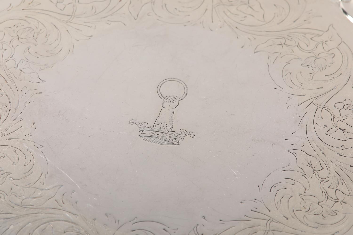 A VICTORIAN SILVER TRAY, London 1846 for William Ker Reid, circular with scalloped rim foliate engraved, with an upright forearm over coronet crest to the centre, on three pierced scroll feet, approximate diameter 39cm, approximate weight 47.8oz