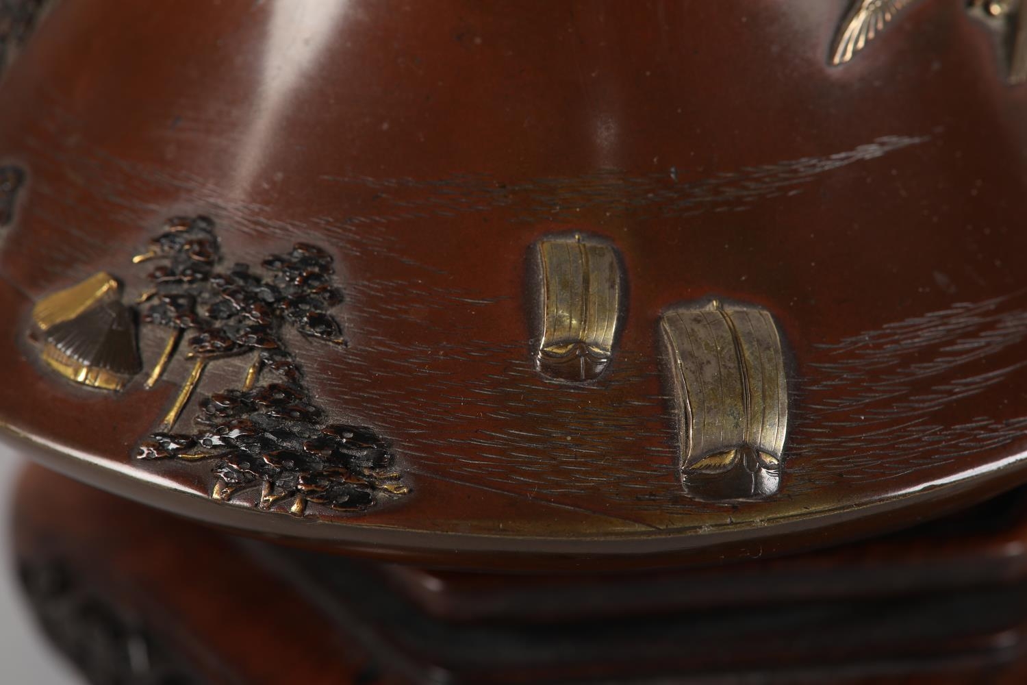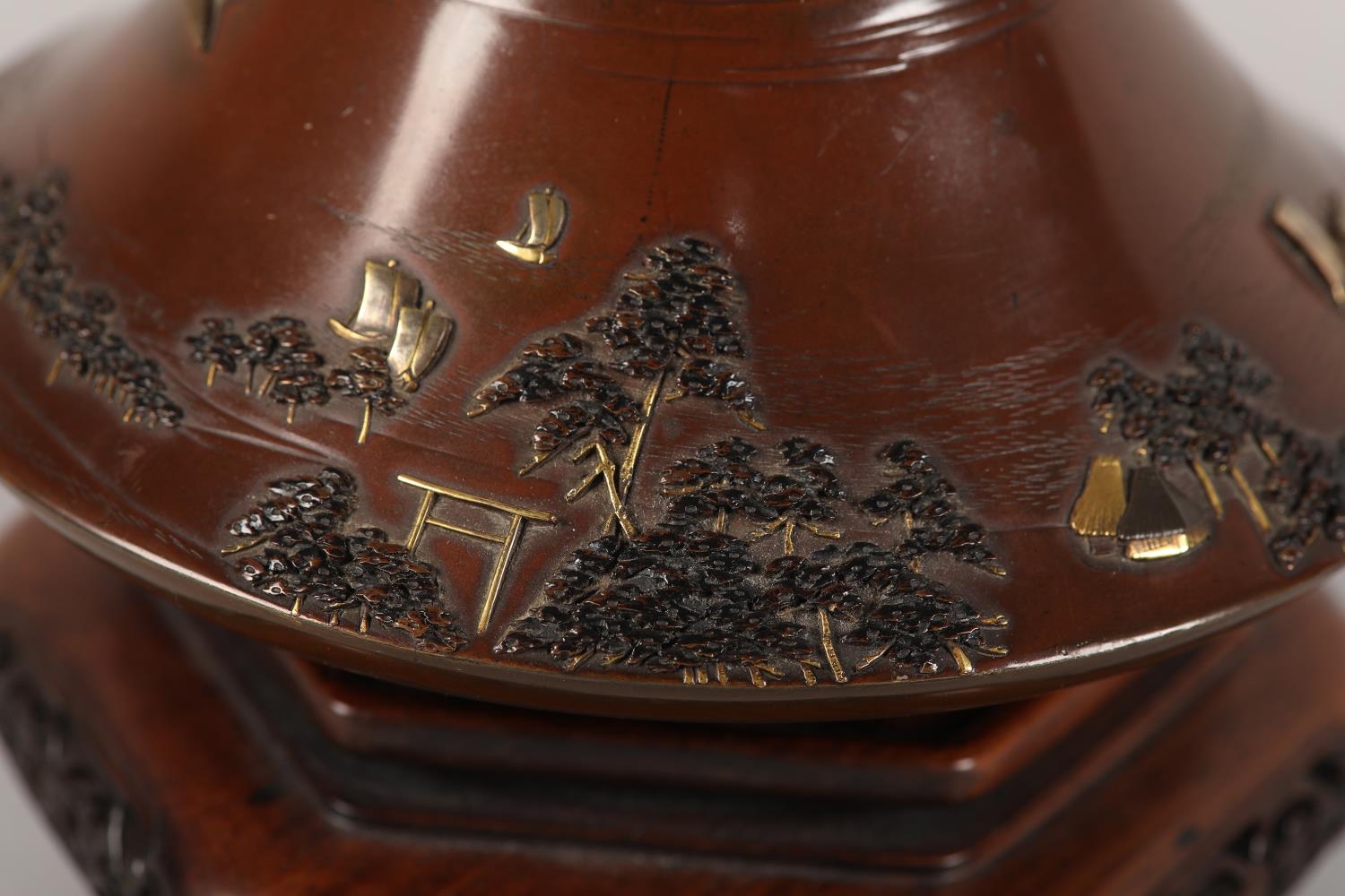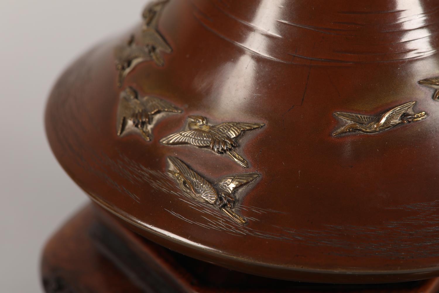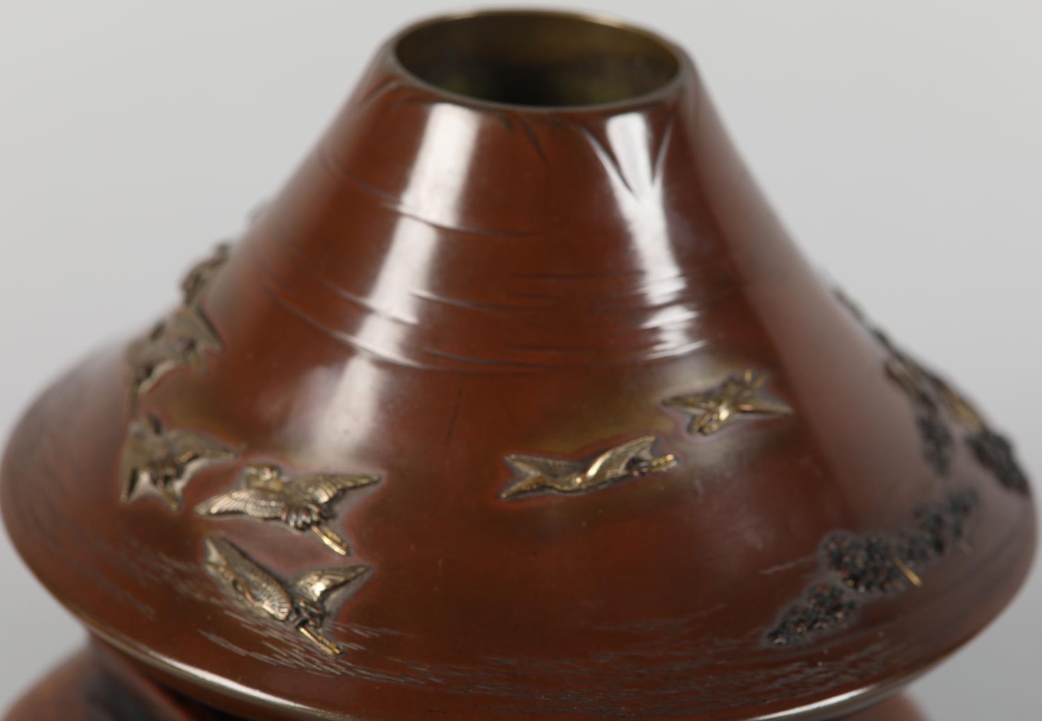MIYABE ATSUYOSHI OF KYOTO (Act 1850-1900) MEIJI PERIOD, A Japanese inlaid bronze vase of conical form resting on three small feet, cast, chased and inlaid with herons in flight over pine trees and fishing boats, signed to the base Dai Nihon Kyoto (no) Ju Ikkado Miyabe Atsuyoshi with Kao, 10cm high x 16cm diameter, with hard wood stand. Miyabe Atsuyoshi was a master bronze smith who lived in Kyoto, he exhibited at home and abroad at the turn of the century including the World's Fair at St Louis in 1904.