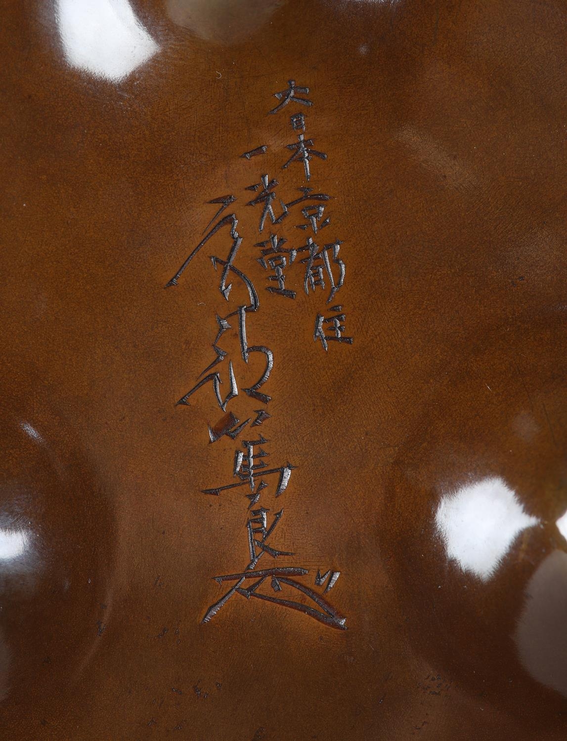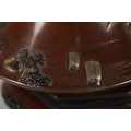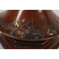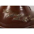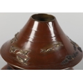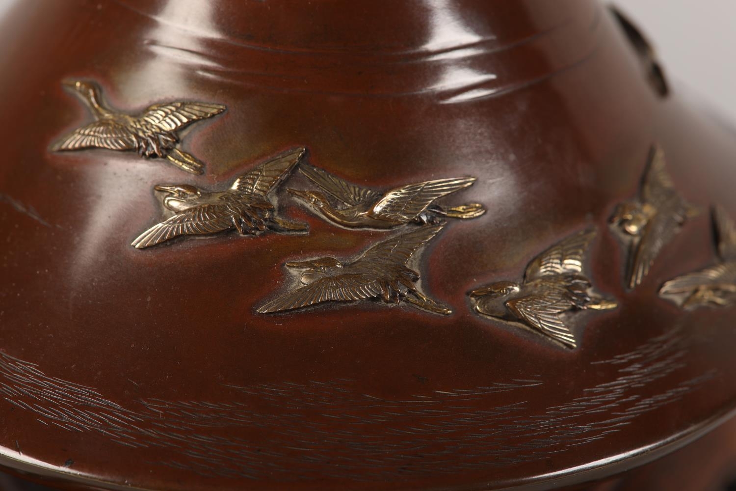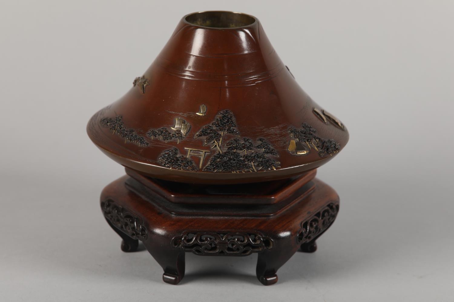 MIYABE ATSUYOSHI OF KYOTO (Act 1850-1900) MEIJI PERIOD, A Japanese inlaid bronze vase of conical form resting on three small feet, cast, chased and inlaid with herons in flight over pine trees and fishing boats, signed to the base Dai Nihon Kyoto (no) Ju Ikkado Miyabe Atsuyoshi with Kao, 10cm high x 16cm diameter, with hard wood stand. Miyabe Atsuyoshi was a master bronze smith who lived in Kyoto, he exhibited at home and abroad at the turn of the century including the World's Fair at St Louis in 1904.