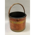 A copper and brass bound coal bucket with swing handle with metal liner, 32cm diameter over handles and 26cm high