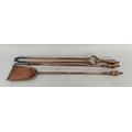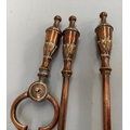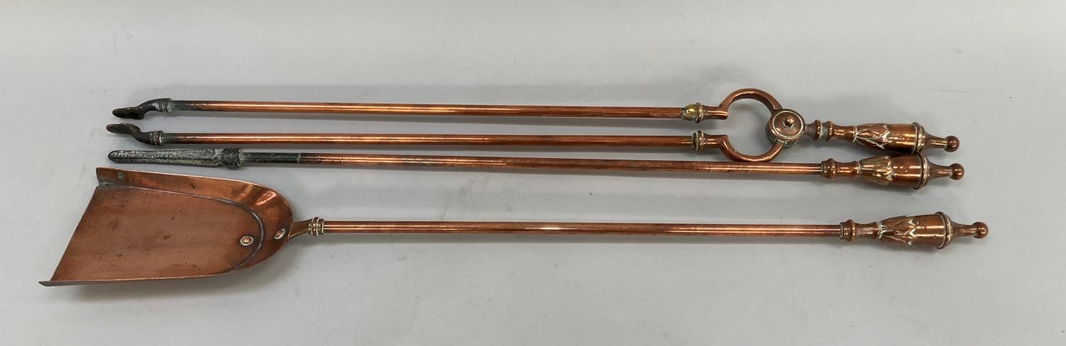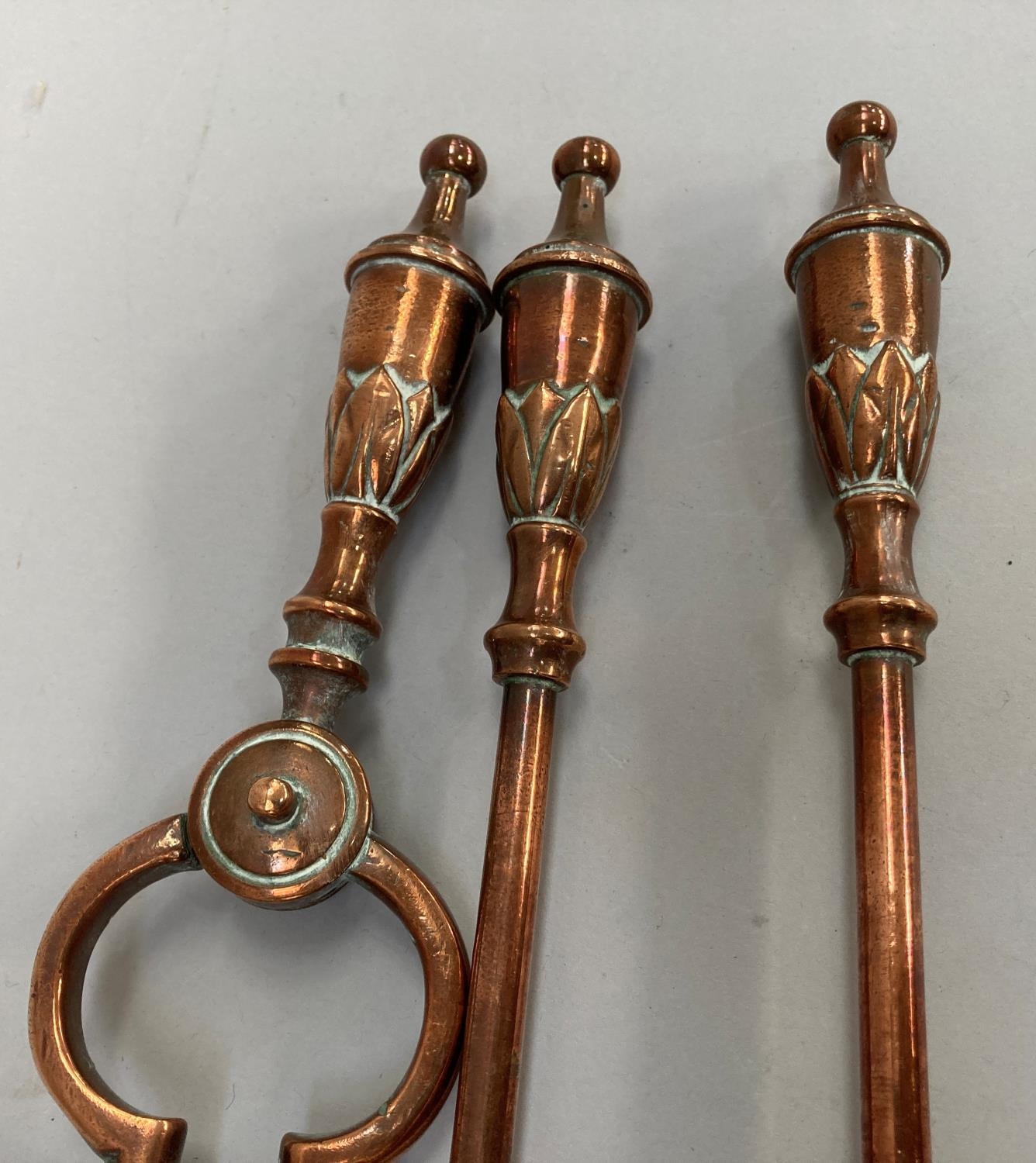 A set of three Victorian copper fire irons with leaf capped urn shaped handles, comprising shovel, 73cm, poker and pair of tongs