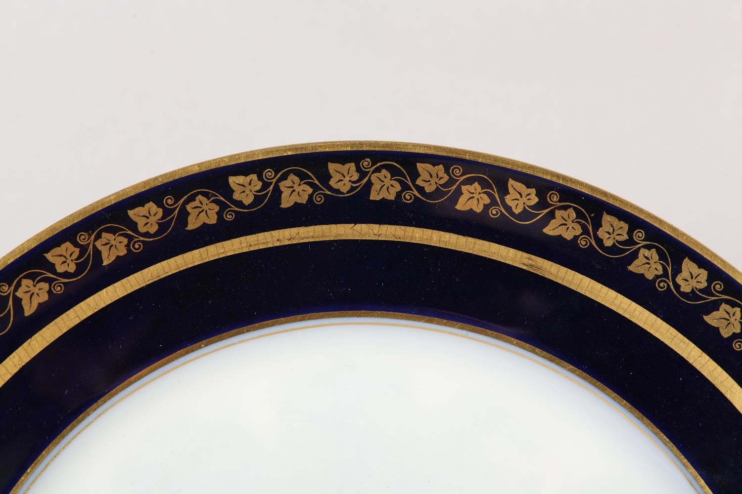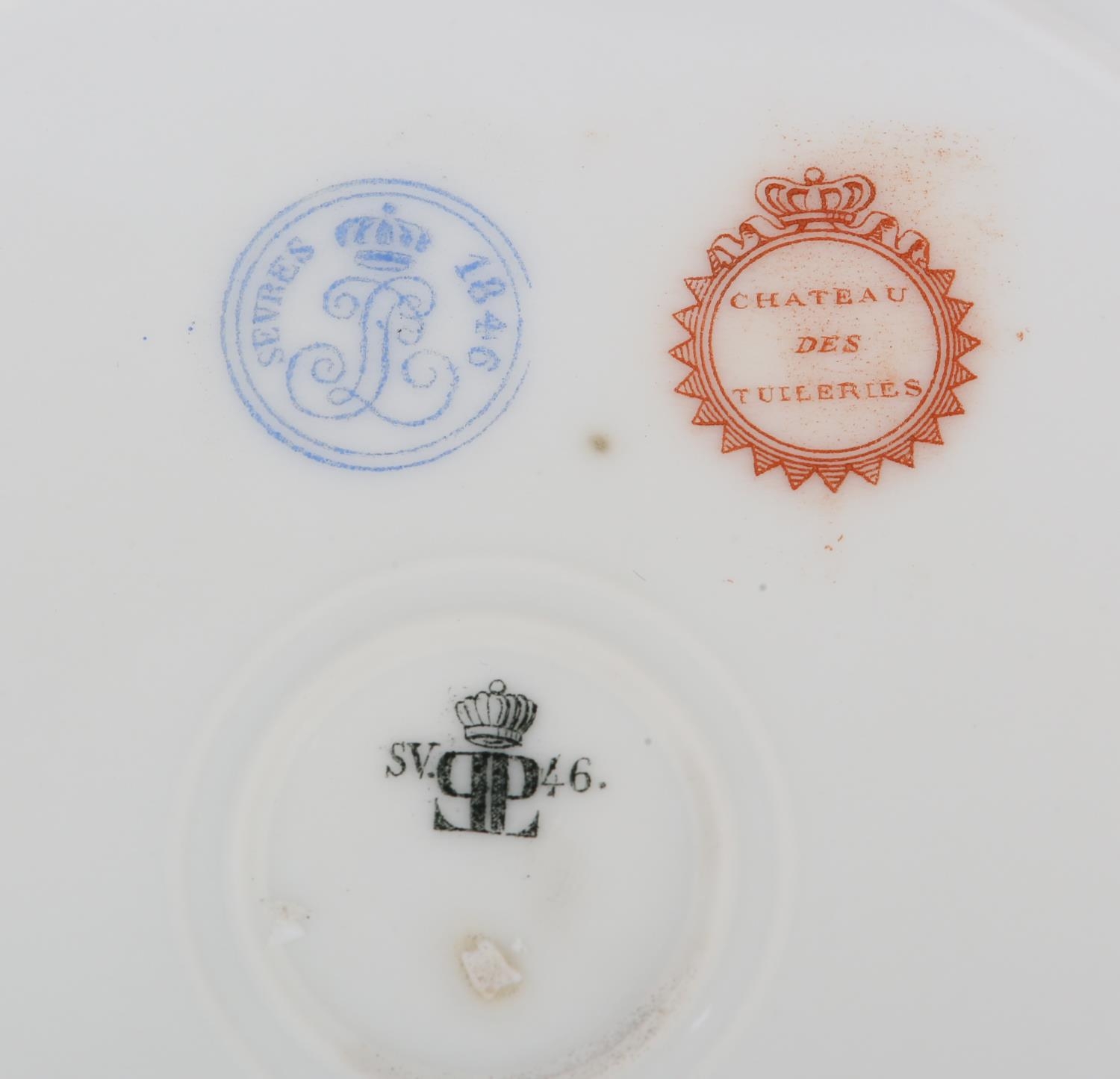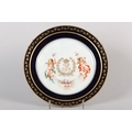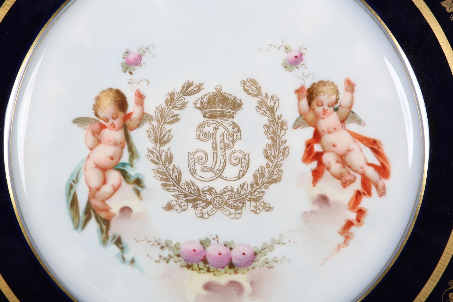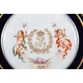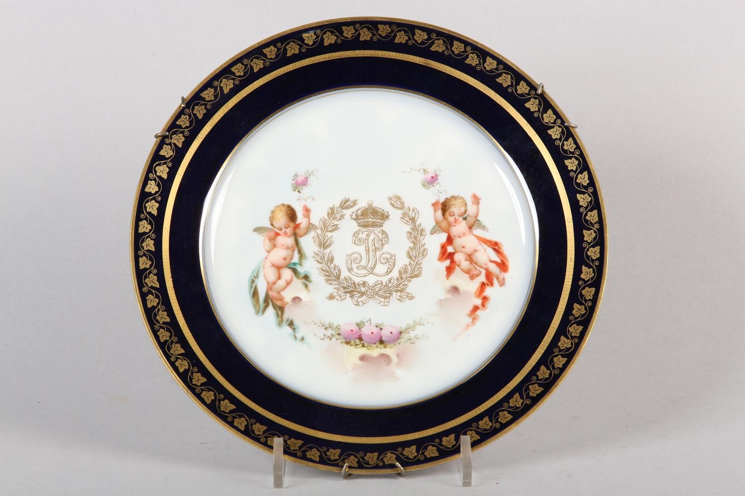 A 19TH CENTURY SEVRES CHATEAU DES TUILERIES LOUIS-PHILLIPE PLATE, circular, painted to the centre with crowned monogram flanked by putti to either side, gros bleu and gilt border, printed marks to underside, 24.5cm diameter