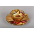 A ROYAL WORCESTER CHINA FRUIT PAINTED CABINET CUP AND SAUCER, signed R Rushton to the cup and J Flaxman to the saucer, each painted with a bond of apples, pears and blackberries above a pink ground and within gilt and white beaded borders, 9.75cm diameter for saucer, puce printed mark and date cypher for 1921