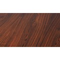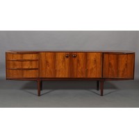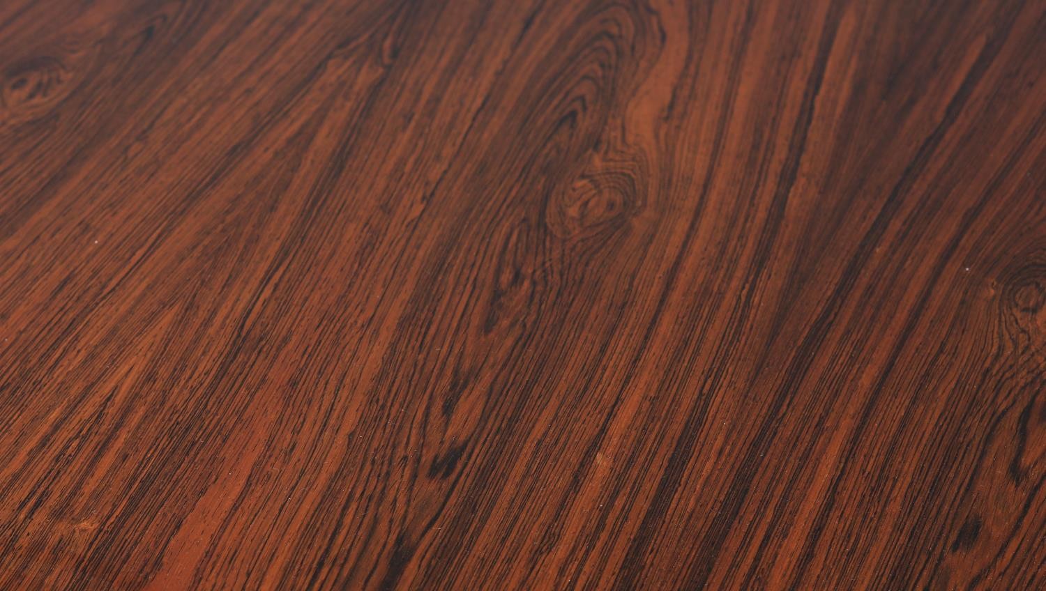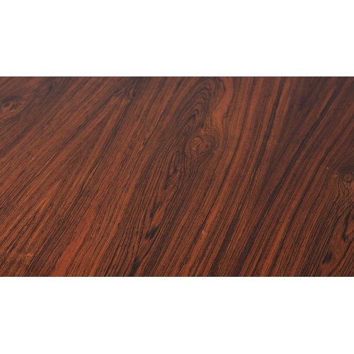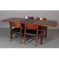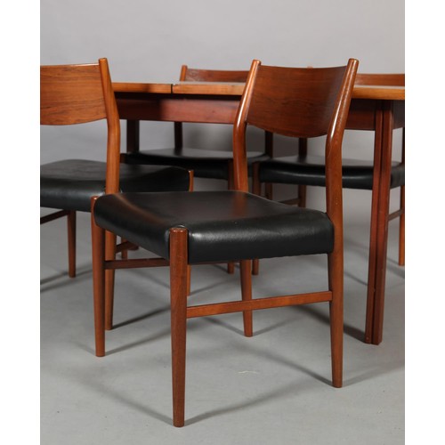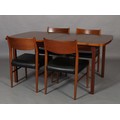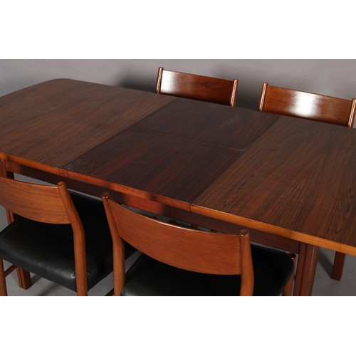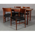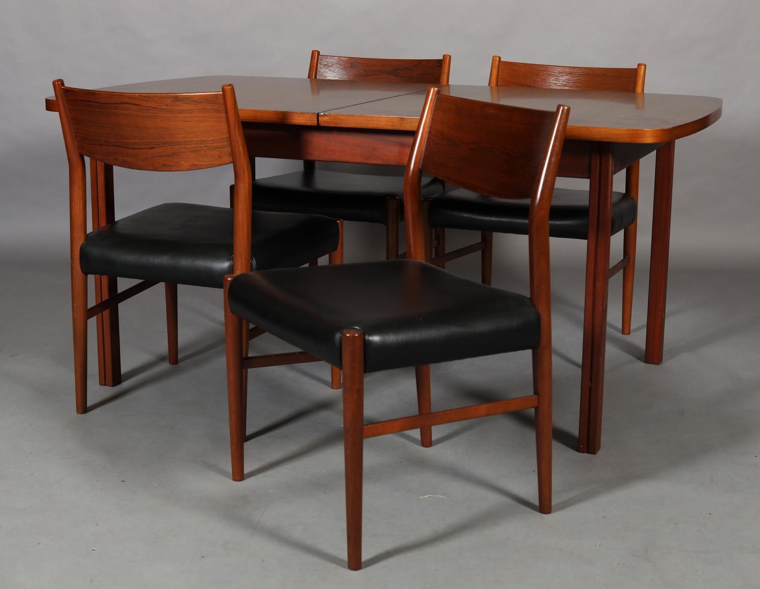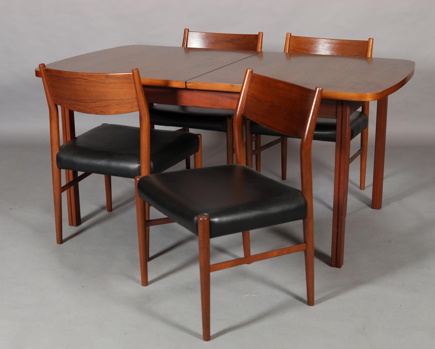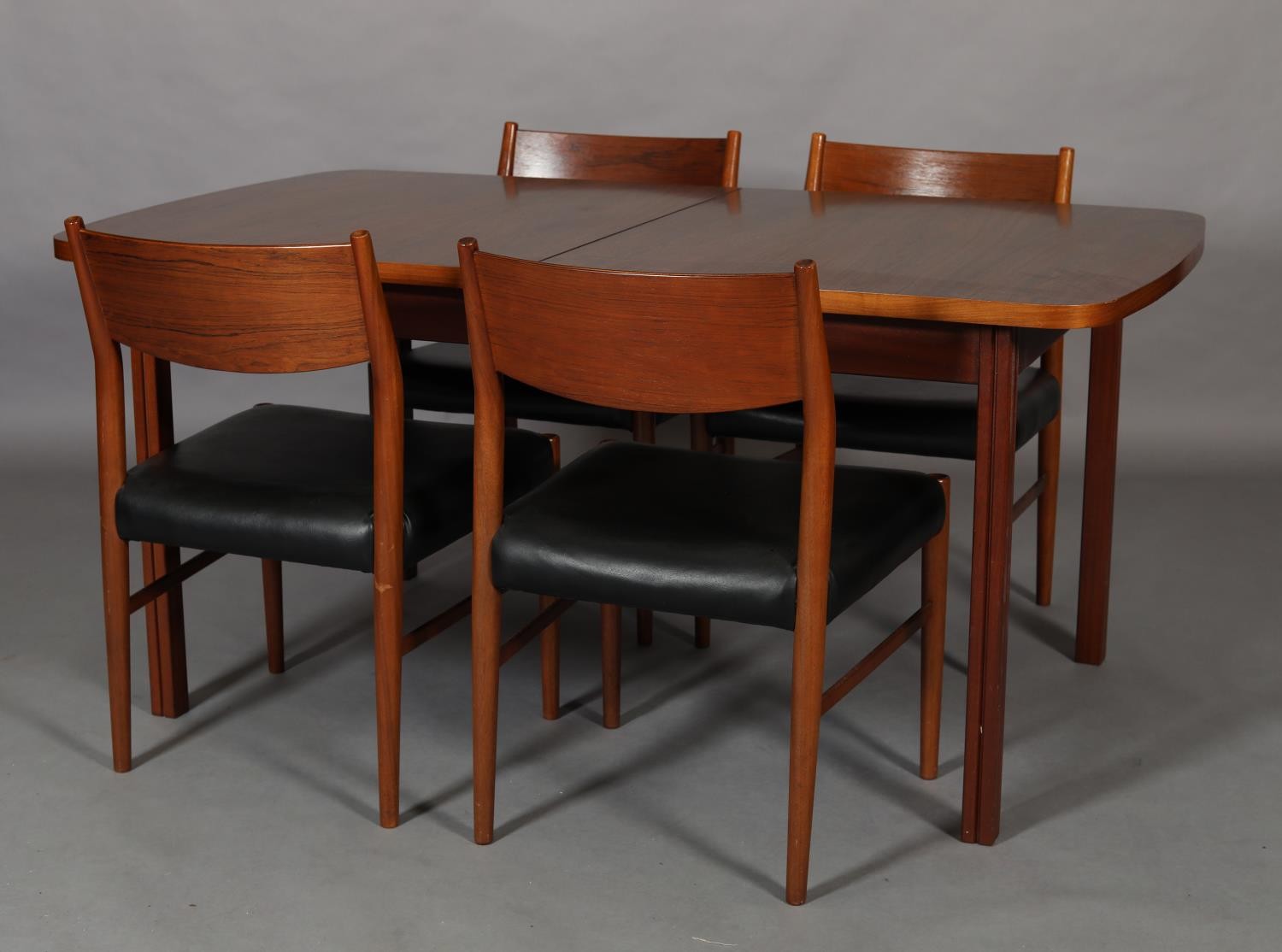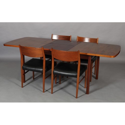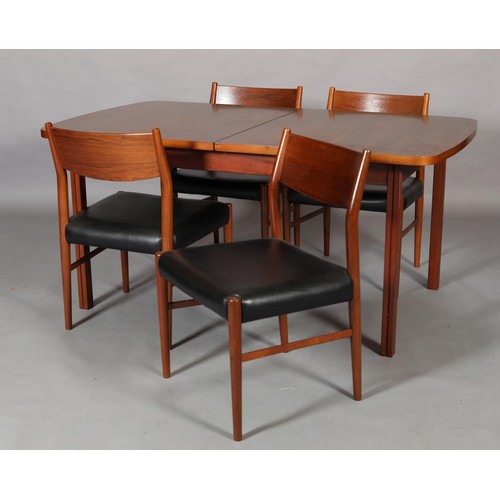 Maclntosh of Kirkcaldy, c1969, An Australian walnut extending dining table with pop-up leaf, rectangular with rounded corners and set of four single chairs with broad black rail and black leather-effect upholstery, 217cm x 92cm extended, 163cm x 92cm closed