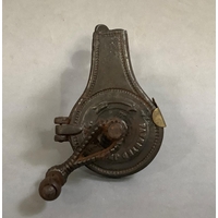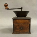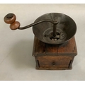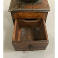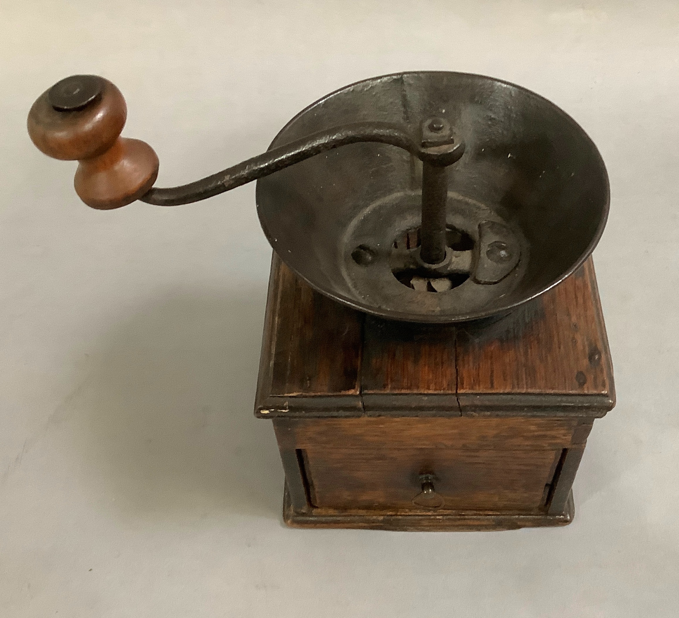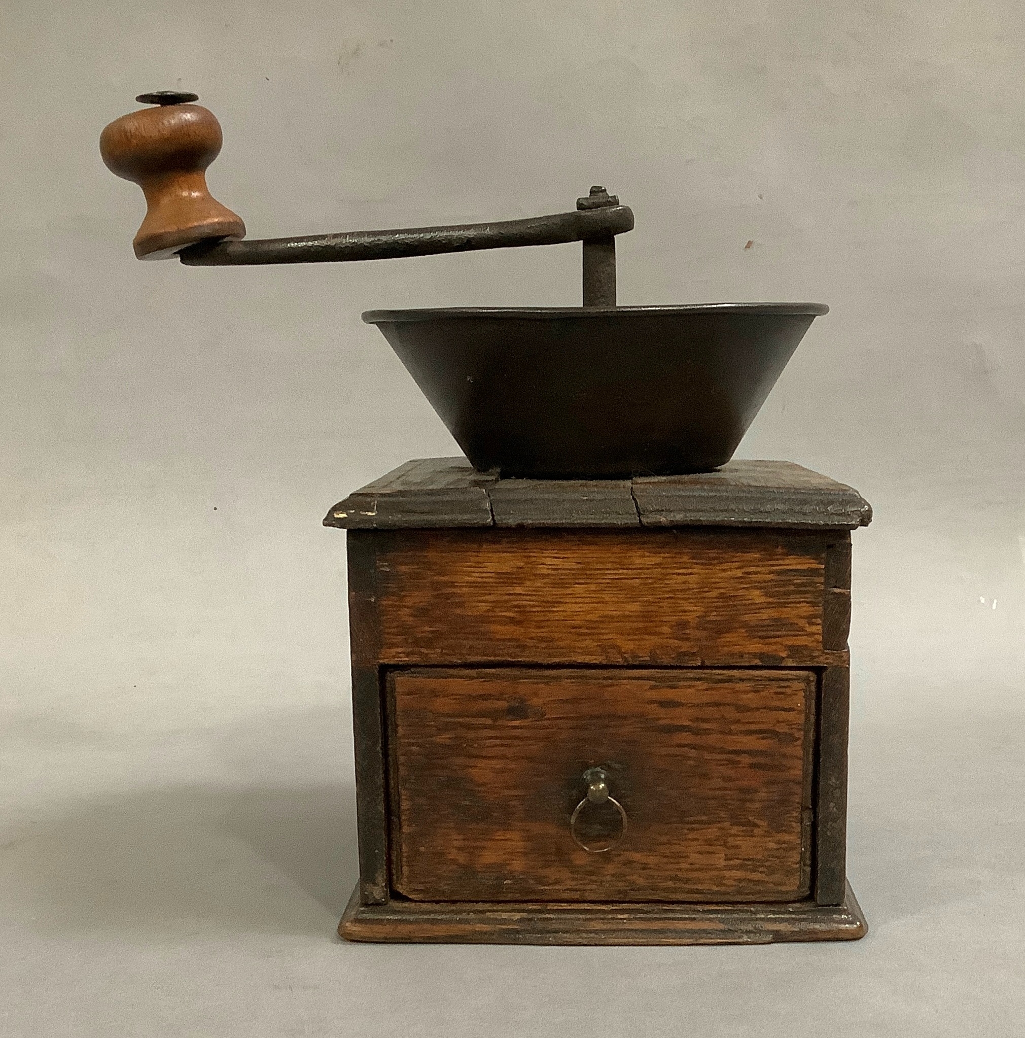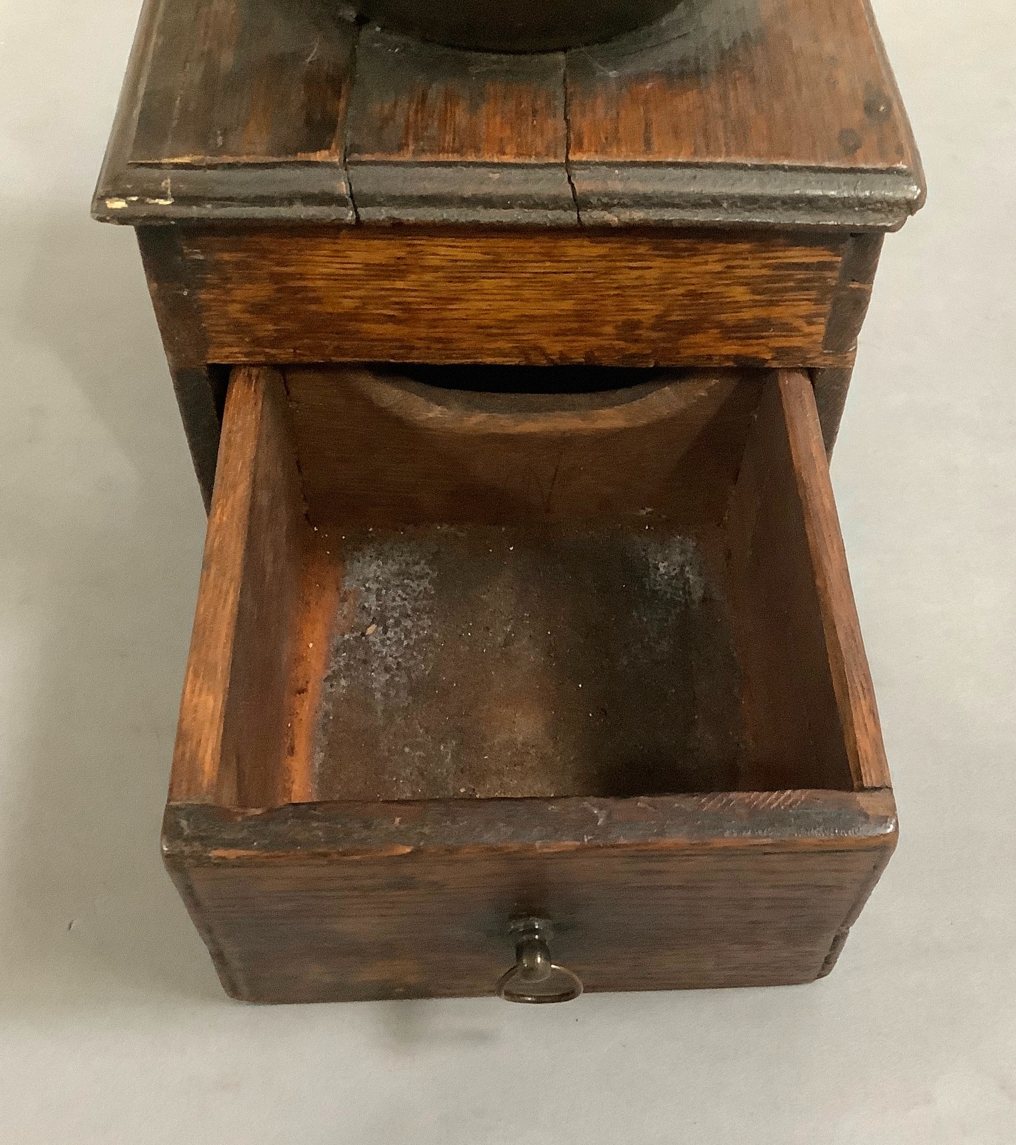 A VICTORIAN AND LATER COFFEE GRINDER having a tin bowl on oak box base with collecting drawer, 22cm to handle