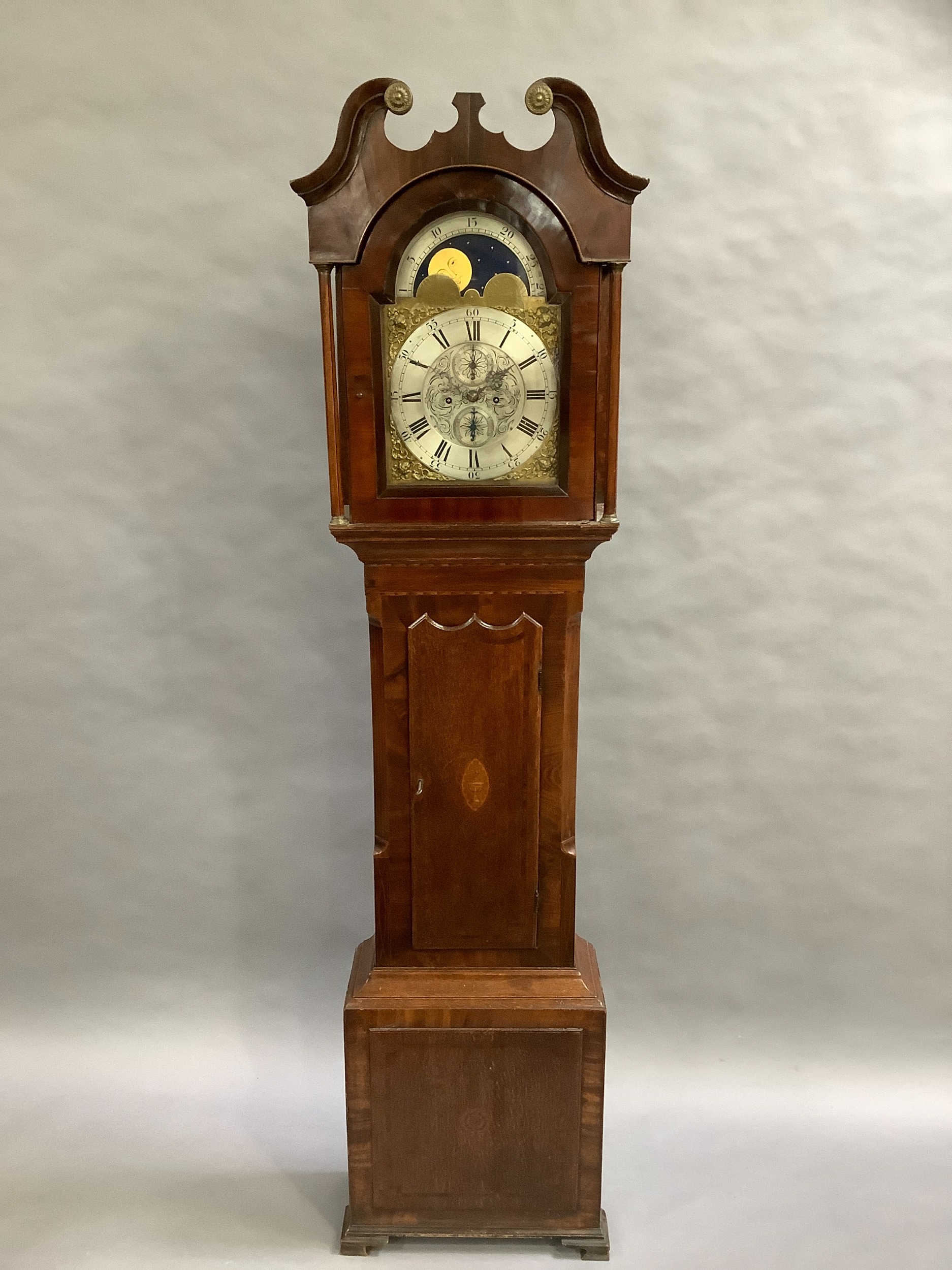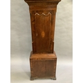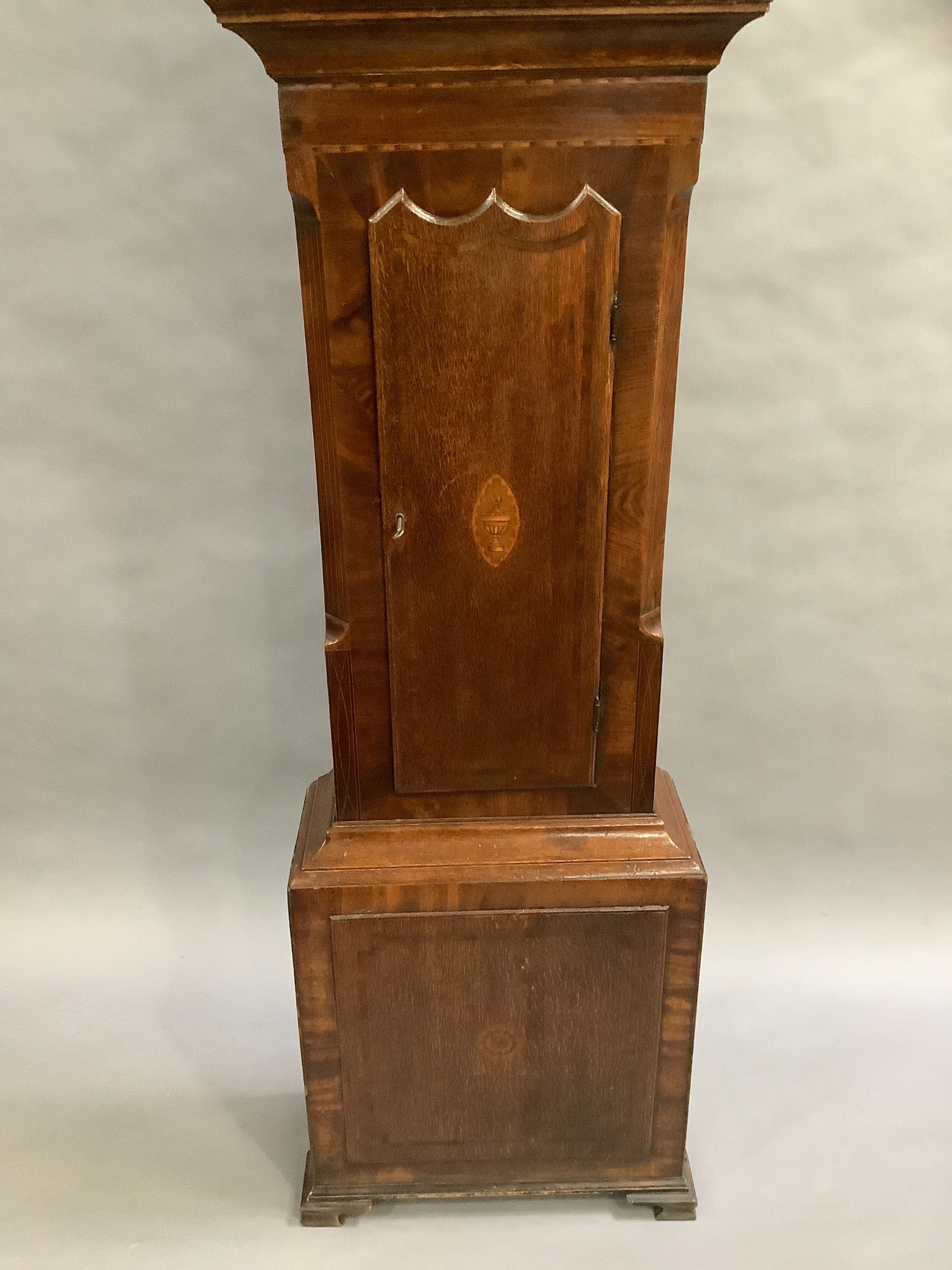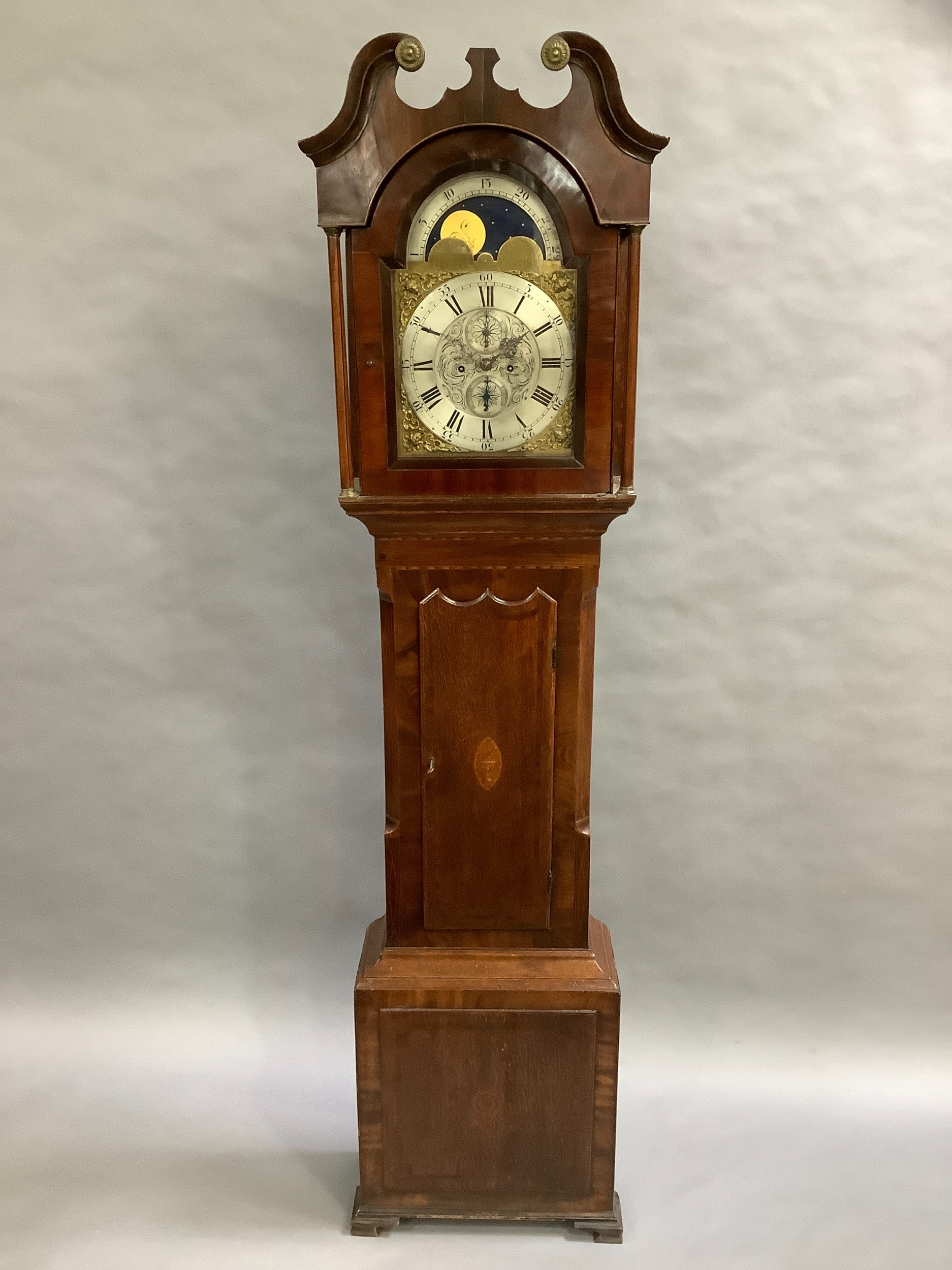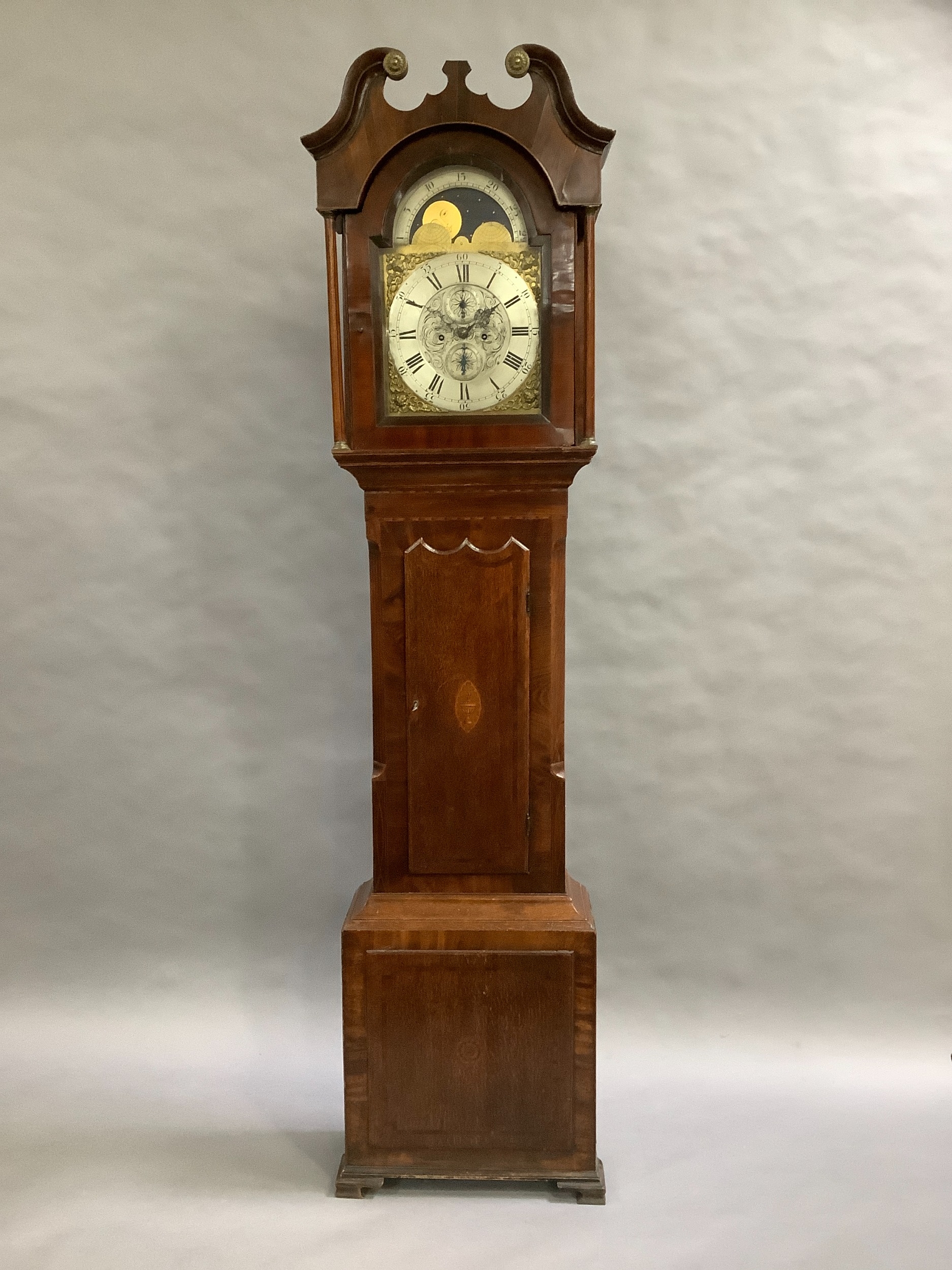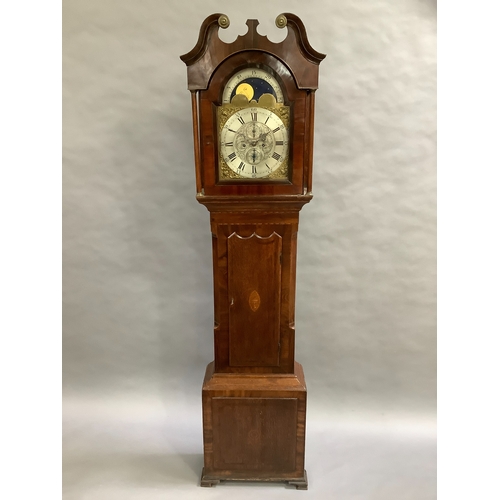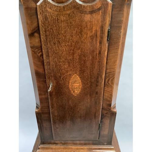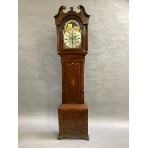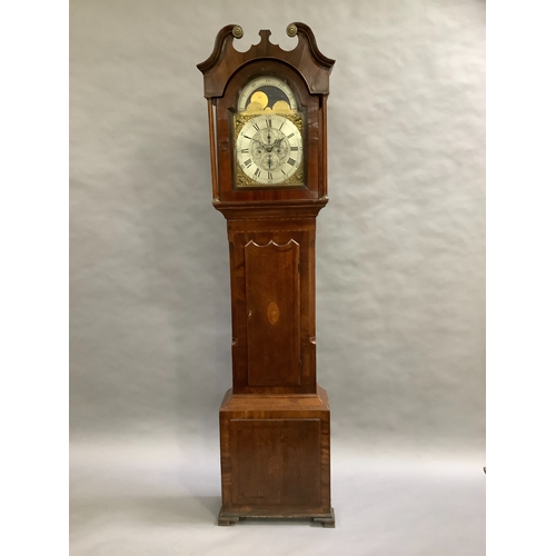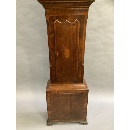 A LATE 18TH CENTURY OAK AND MAHOGANY LONGCASE CLOCK, having an arched dial with painted moon phase, 30cm silvered dial with Roman numerals and Arabic numerals to the chapter ring, two subsidiary dials, engraved foliate scrolls to the centre, gilt metal face mask spandrels, the eight day movement striking a gong, the hood having a broken arch pediment above rounded pilasters, the door inlaid with satinwood urn and oval paterae, flanked by chamfered angles, inlaid boxwood and ebony stringing, the lower panel with circular paterae, on ogee bracket feet, 230cm high