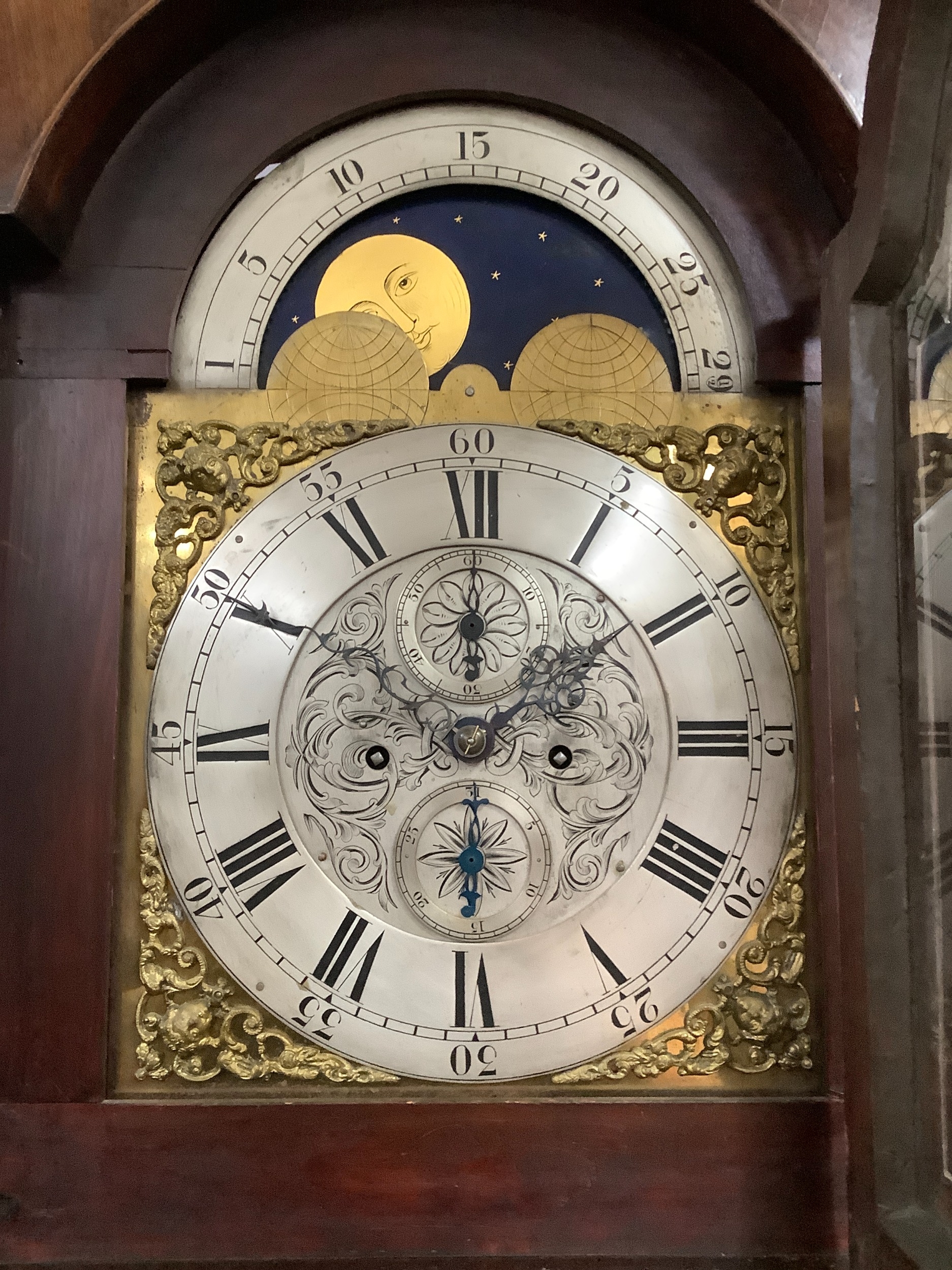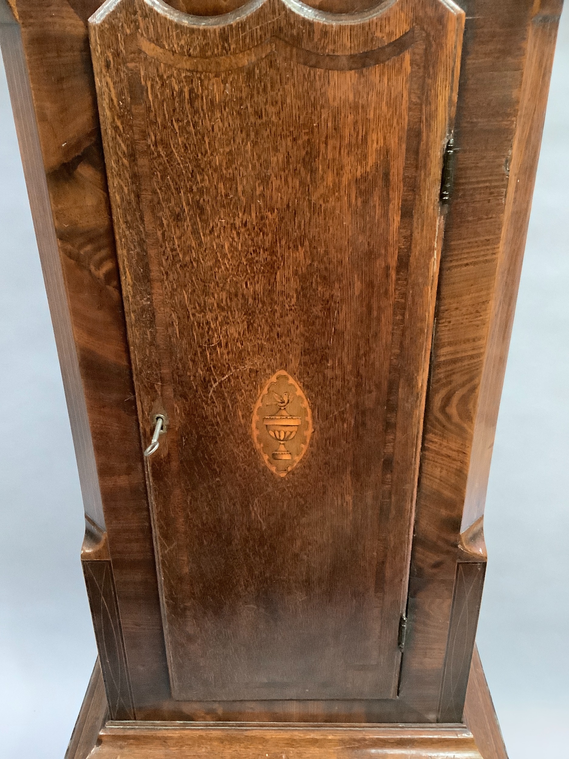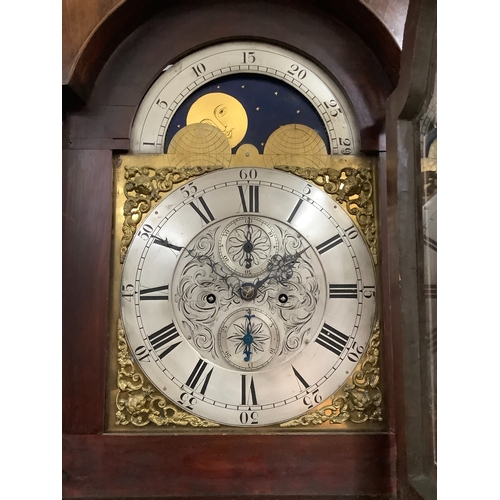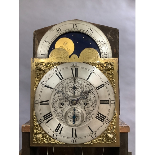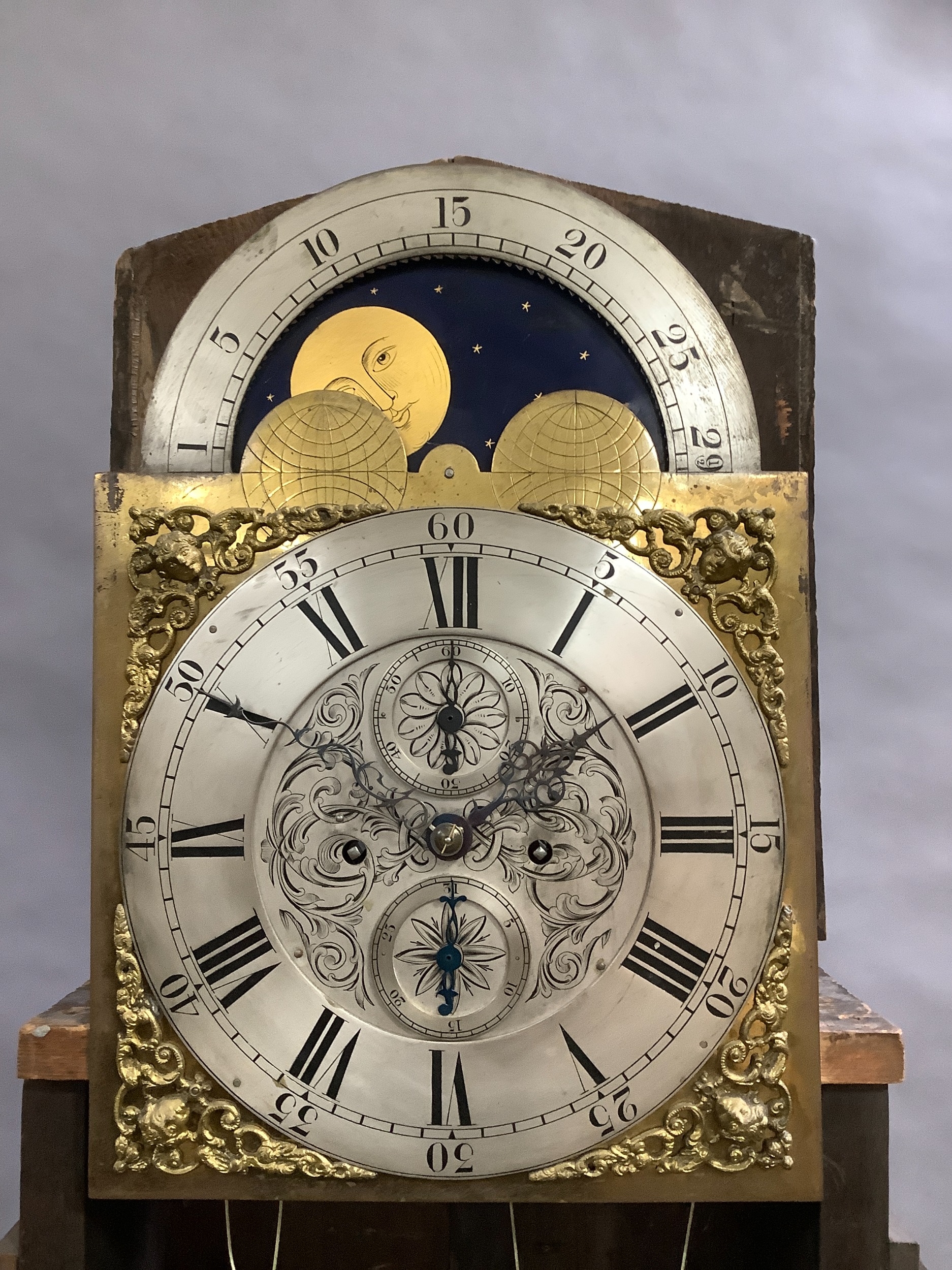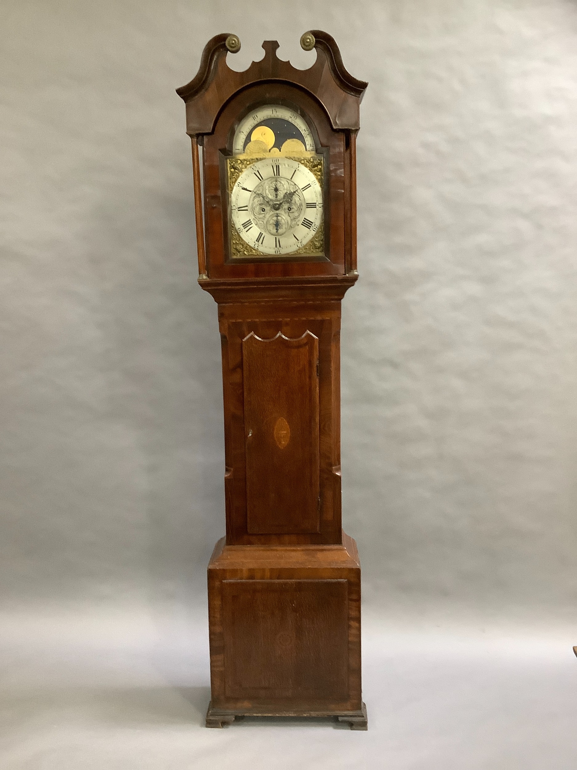 A LATE 18TH CENTURY OAK AND MAHOGANY LONGCASE CLOCK, having an arched dial with painted moon phase, 30cm silvered dial with Roman numerals and Arabic numerals to the chapter ring, two subsidiary dials, engraved foliate scrolls to the centre, gilt metal face mask spandrels, the eight day movement striking a gong, the hood having a broken arch pediment above rounded pilasters, the door inlaid with satinwood urn and oval paterae, flanked by chamfered angles, inlaid boxwood and ebony stringing, the lower panel with circular paterae, on ogee bracket feet, 230cm high
