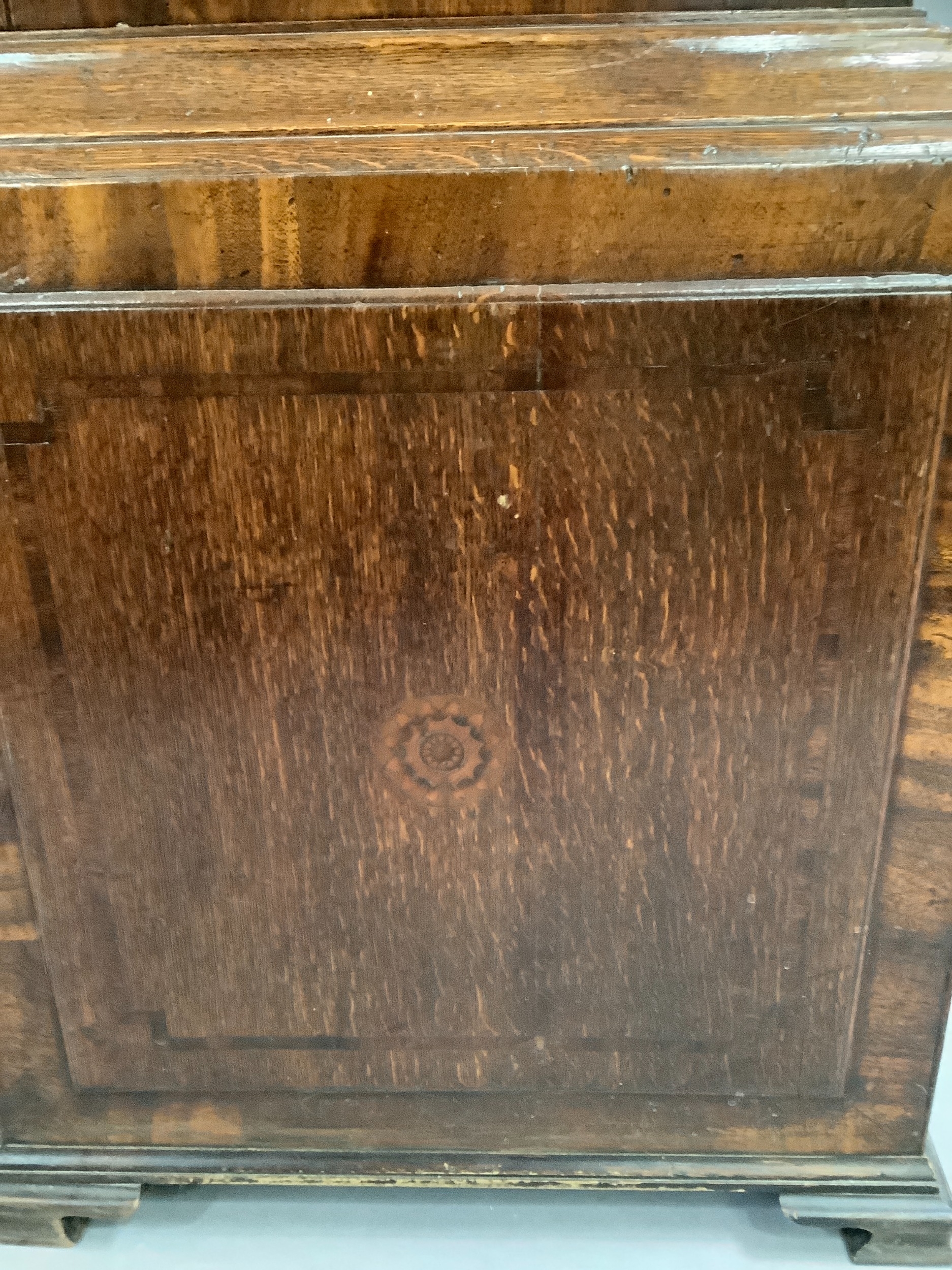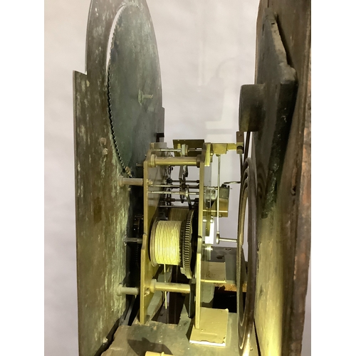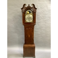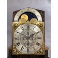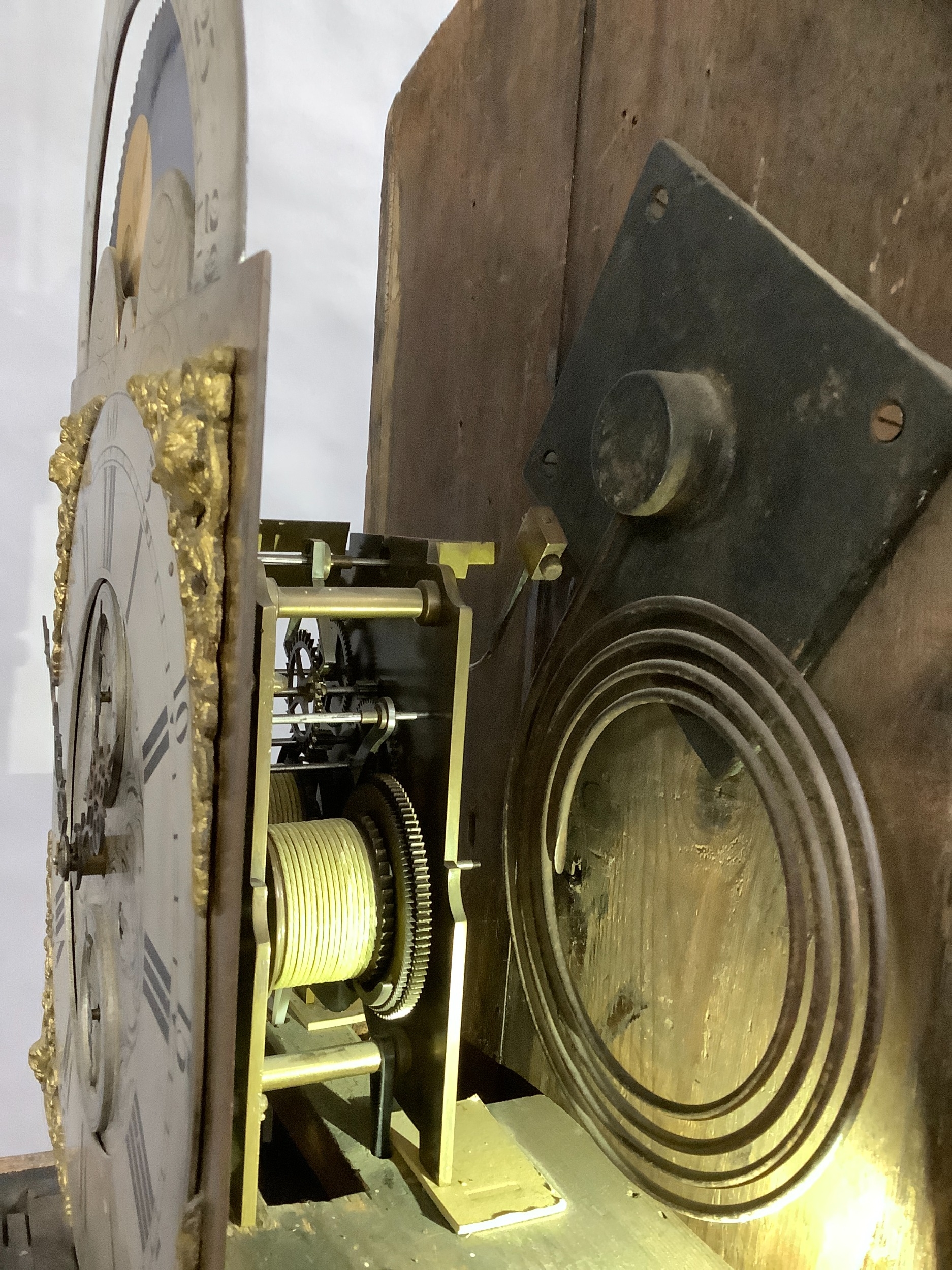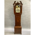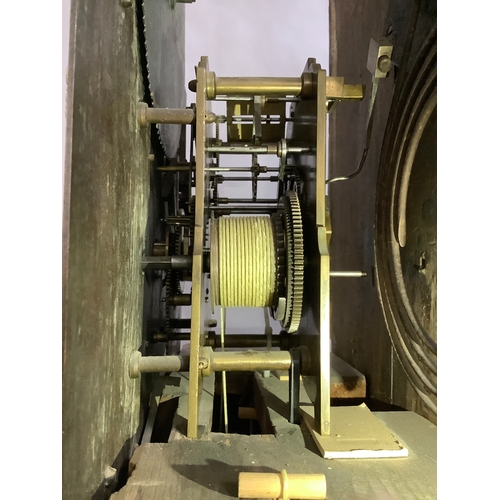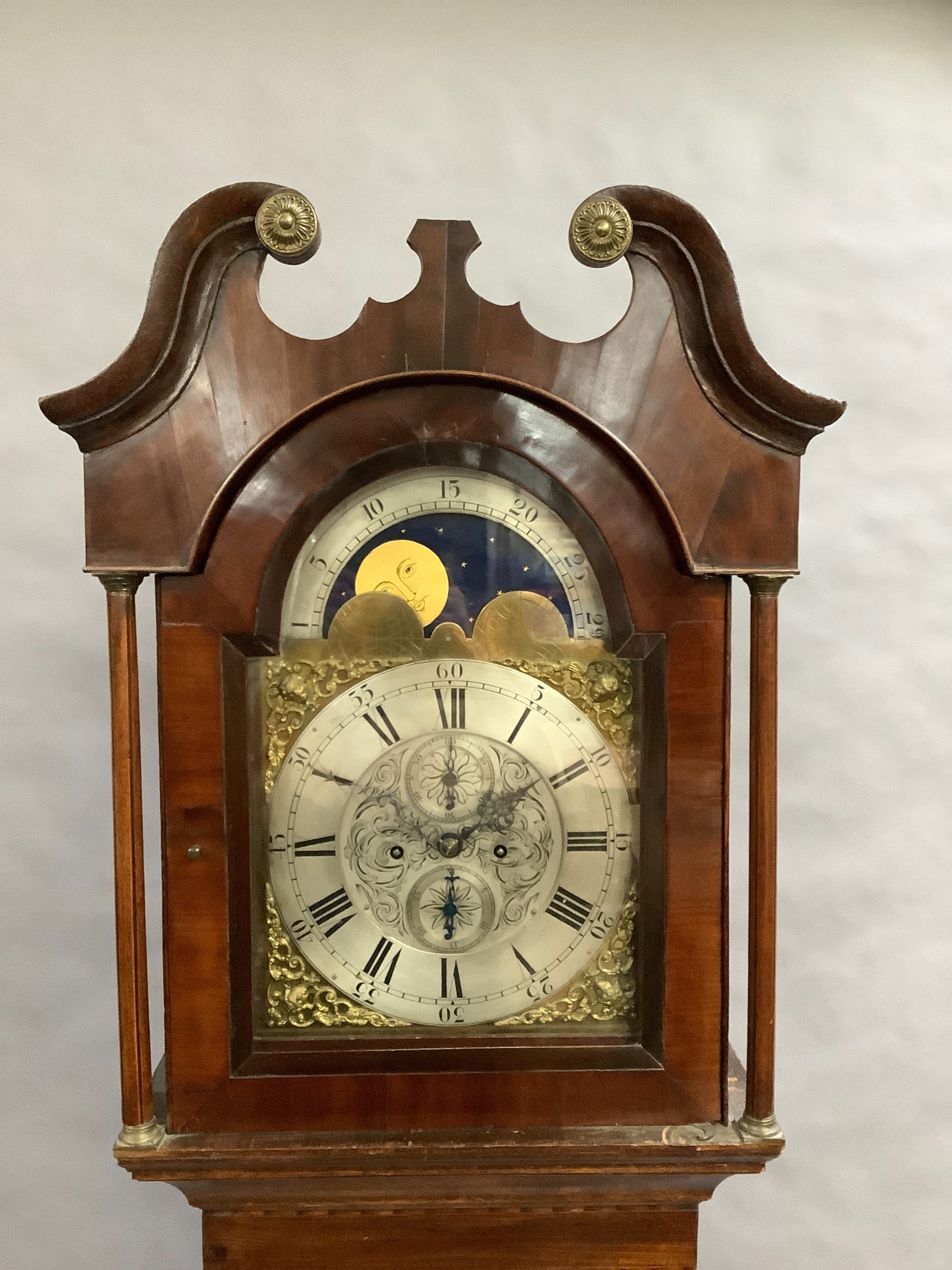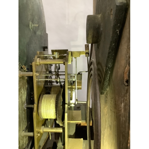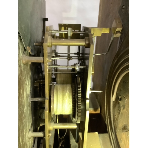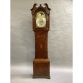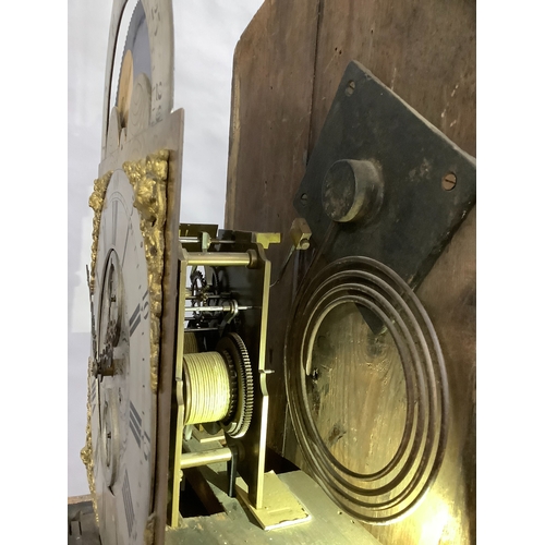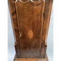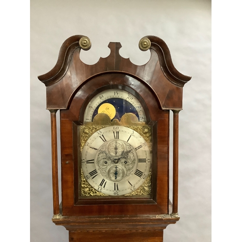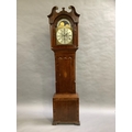 A LATE 18TH CENTURY OAK AND MAHOGANY LONGCASE CLOCK, having an arched dial with painted moon phase, 30cm silvered dial with Roman numerals and Arabic numerals to the chapter ring, two subsidiary dials, engraved foliate scrolls to the centre, gilt metal face mask spandrels, the eight day movement striking a gong, the hood having a broken arch pediment above rounded pilasters, the door inlaid with satinwood urn and oval paterae, flanked by chamfered angles, inlaid boxwood and ebony stringing, the lower panel with circular paterae, on ogee bracket feet, 230cm high