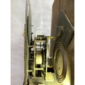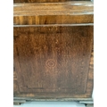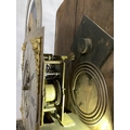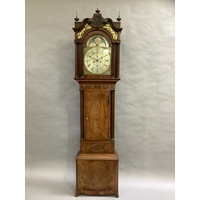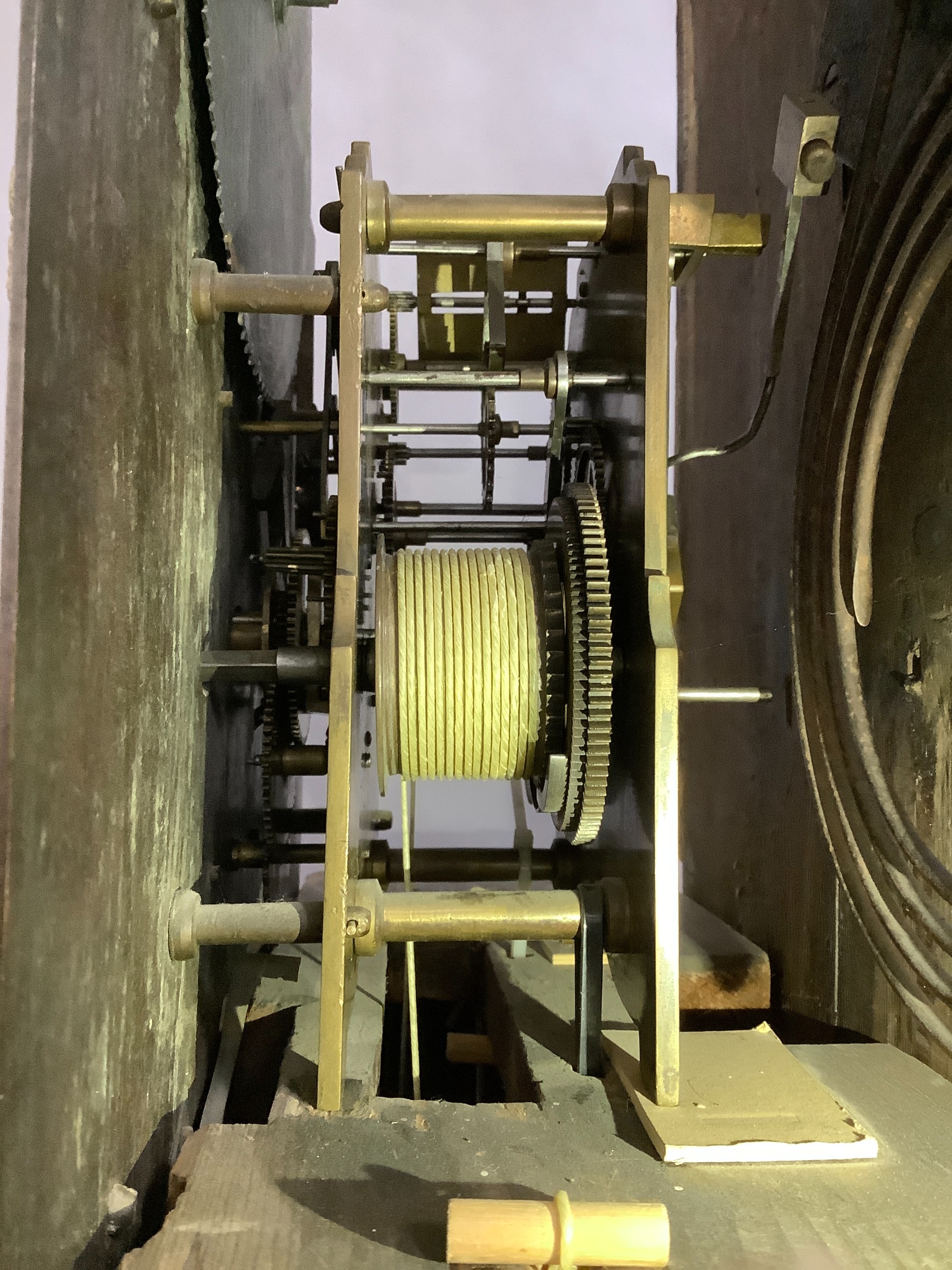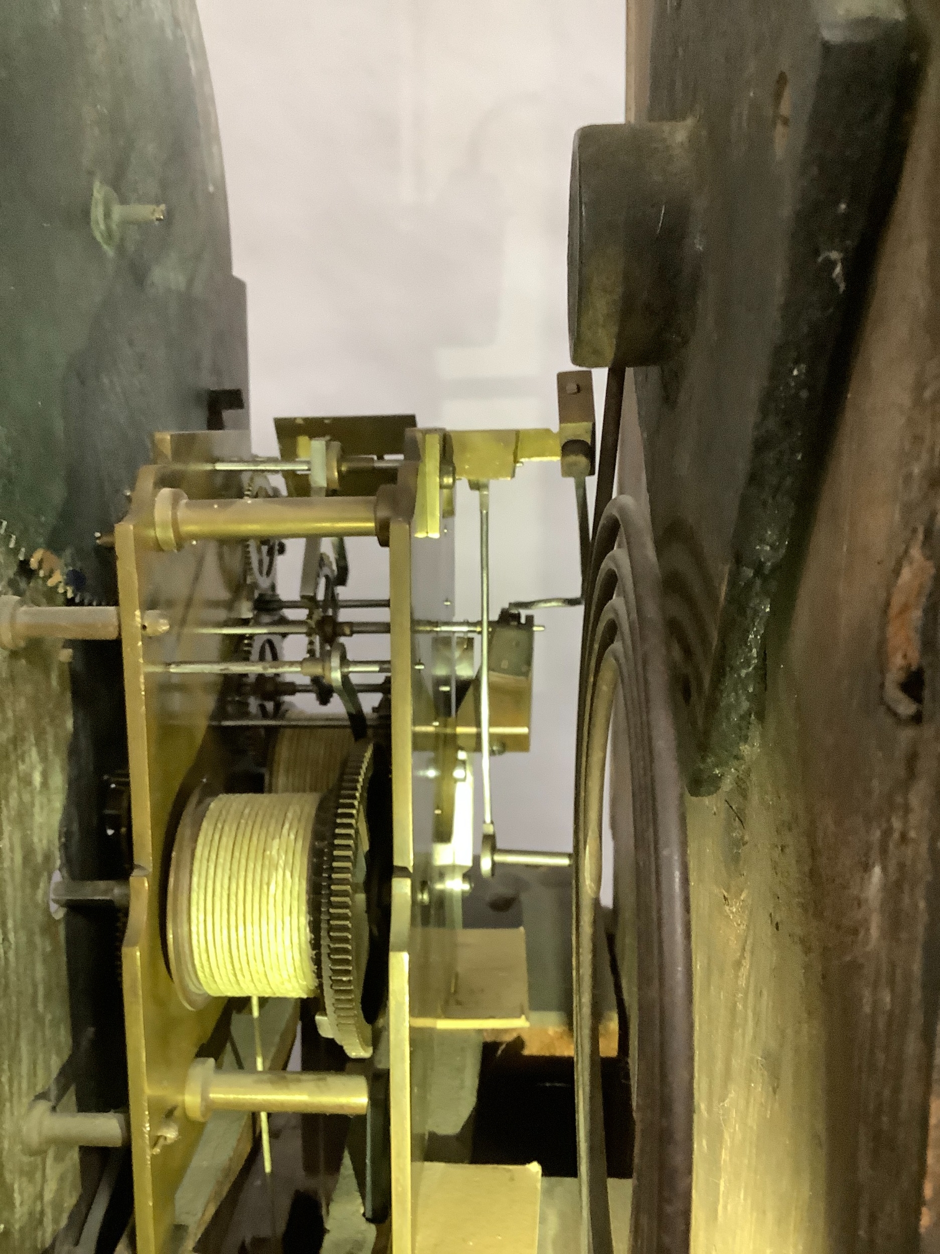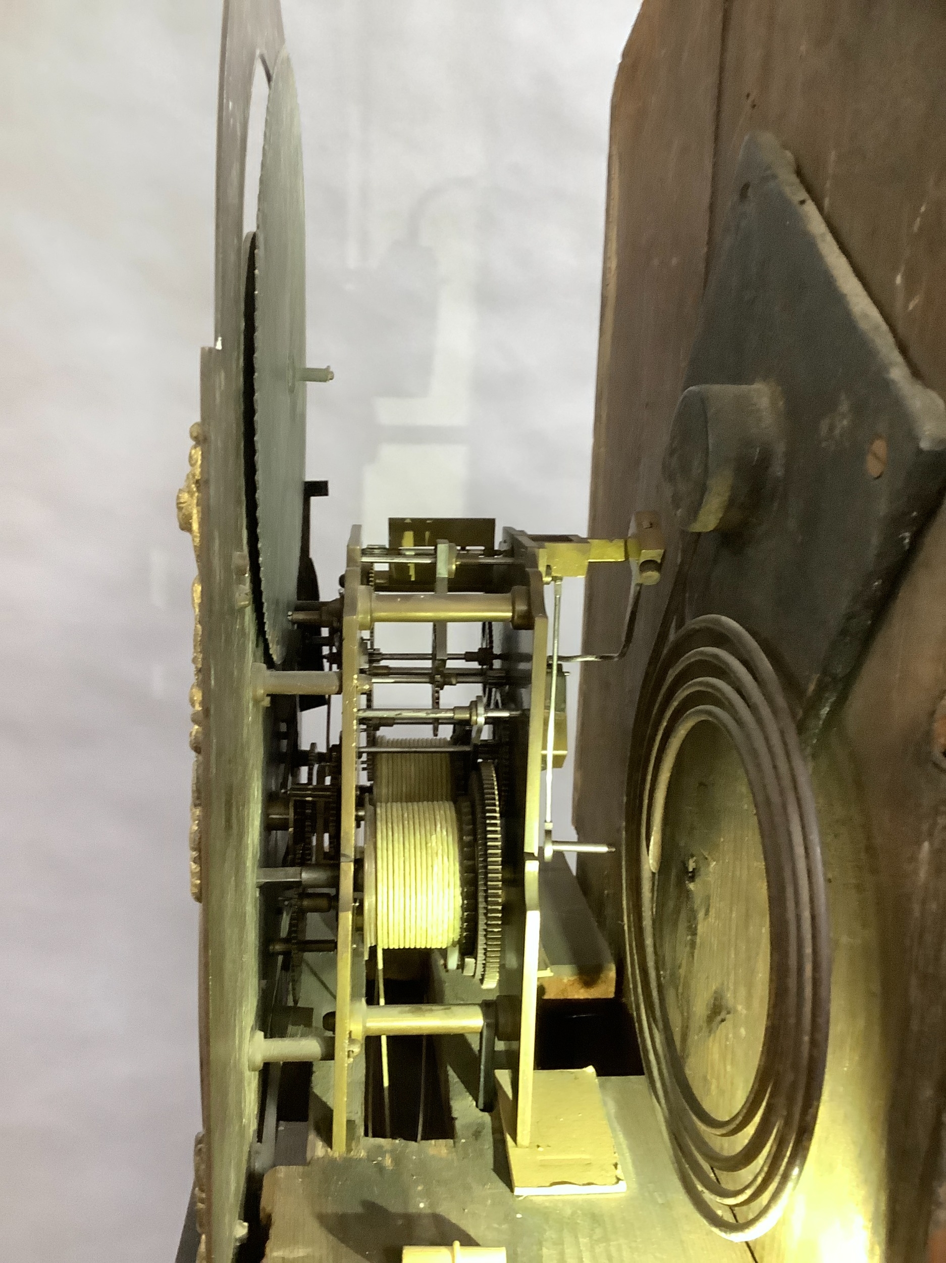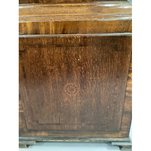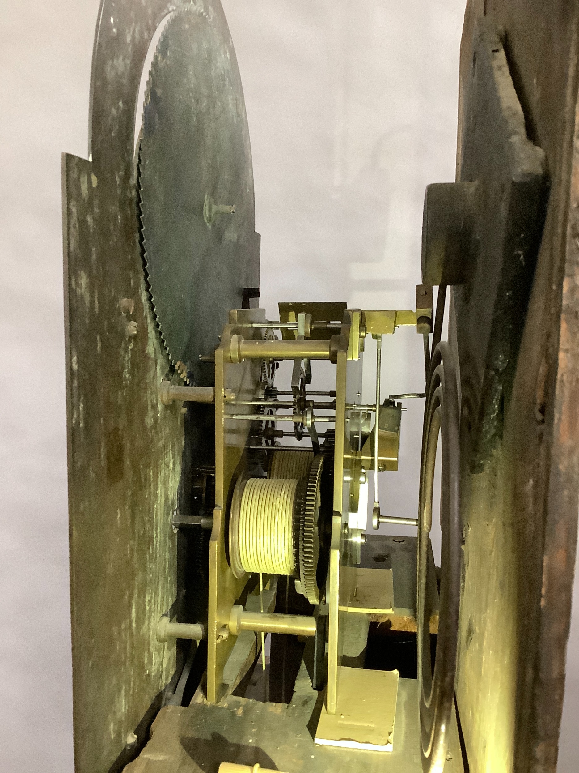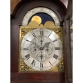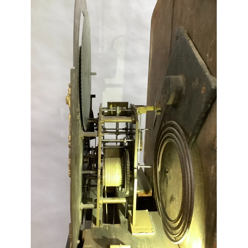 A LATE 18TH CENTURY OAK AND MAHOGANY LONGCASE CLOCK, having an arched dial with painted moon phase, 30cm silvered dial with Roman numerals and Arabic numerals to the chapter ring, two subsidiary dials, engraved foliate scrolls to the centre, gilt metal face mask spandrels, the eight day movement striking a gong, the hood having a broken arch pediment above rounded pilasters, the door inlaid with satinwood urn and oval paterae, flanked by chamfered angles, inlaid boxwood and ebony stringing, the lower panel with circular paterae, on ogee bracket feet, 230cm high