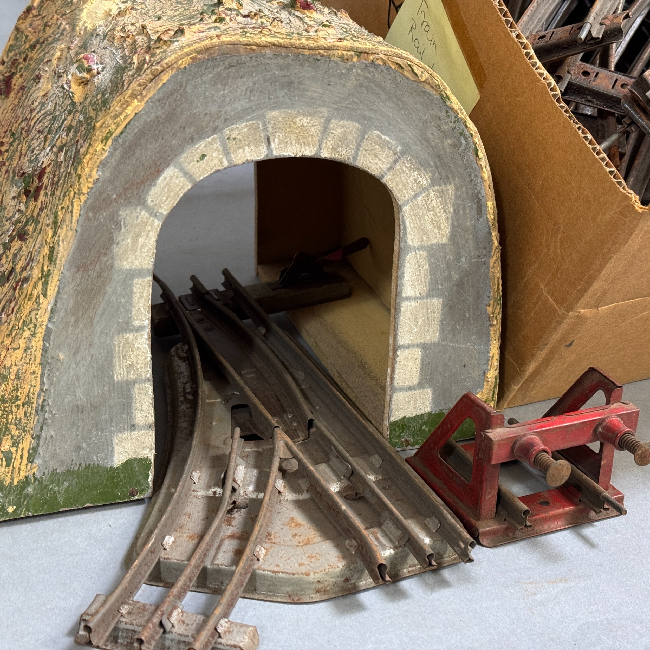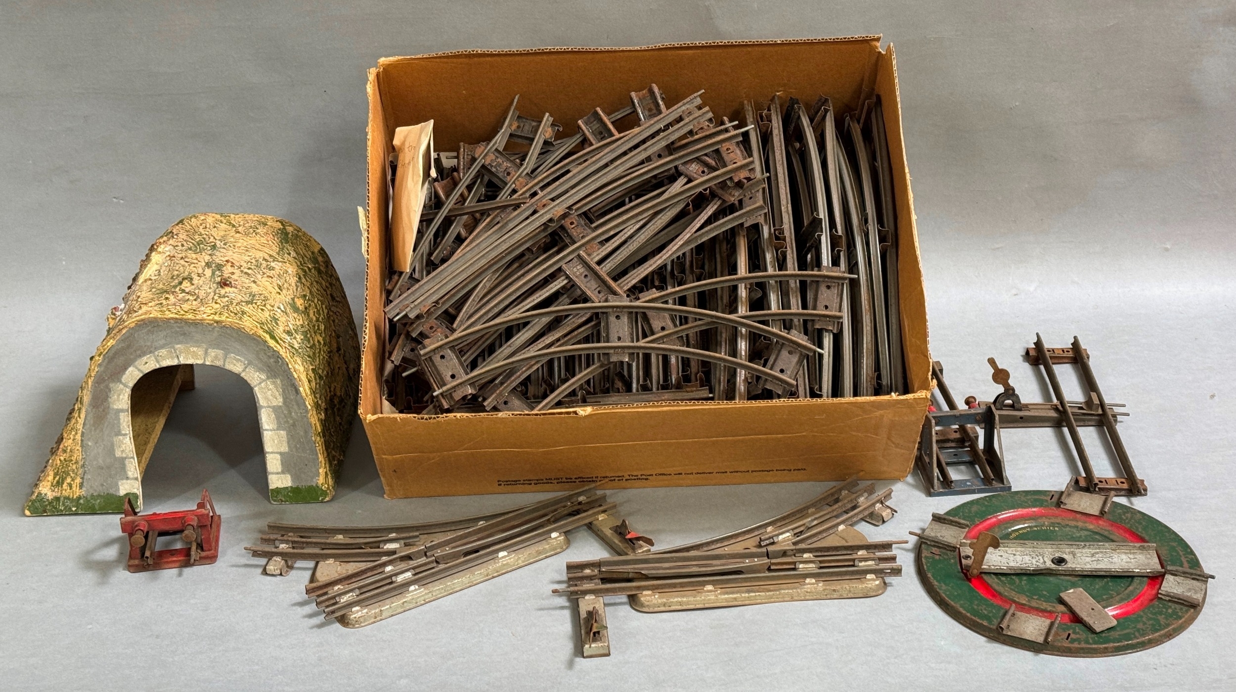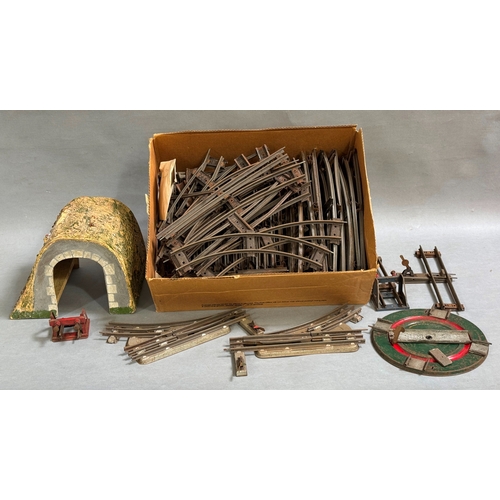 A quantity of Hornby O Gauge track, including curves, straights, points, buffers and a turntable, along with a tunnel.