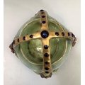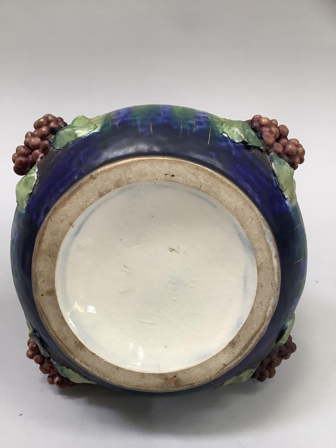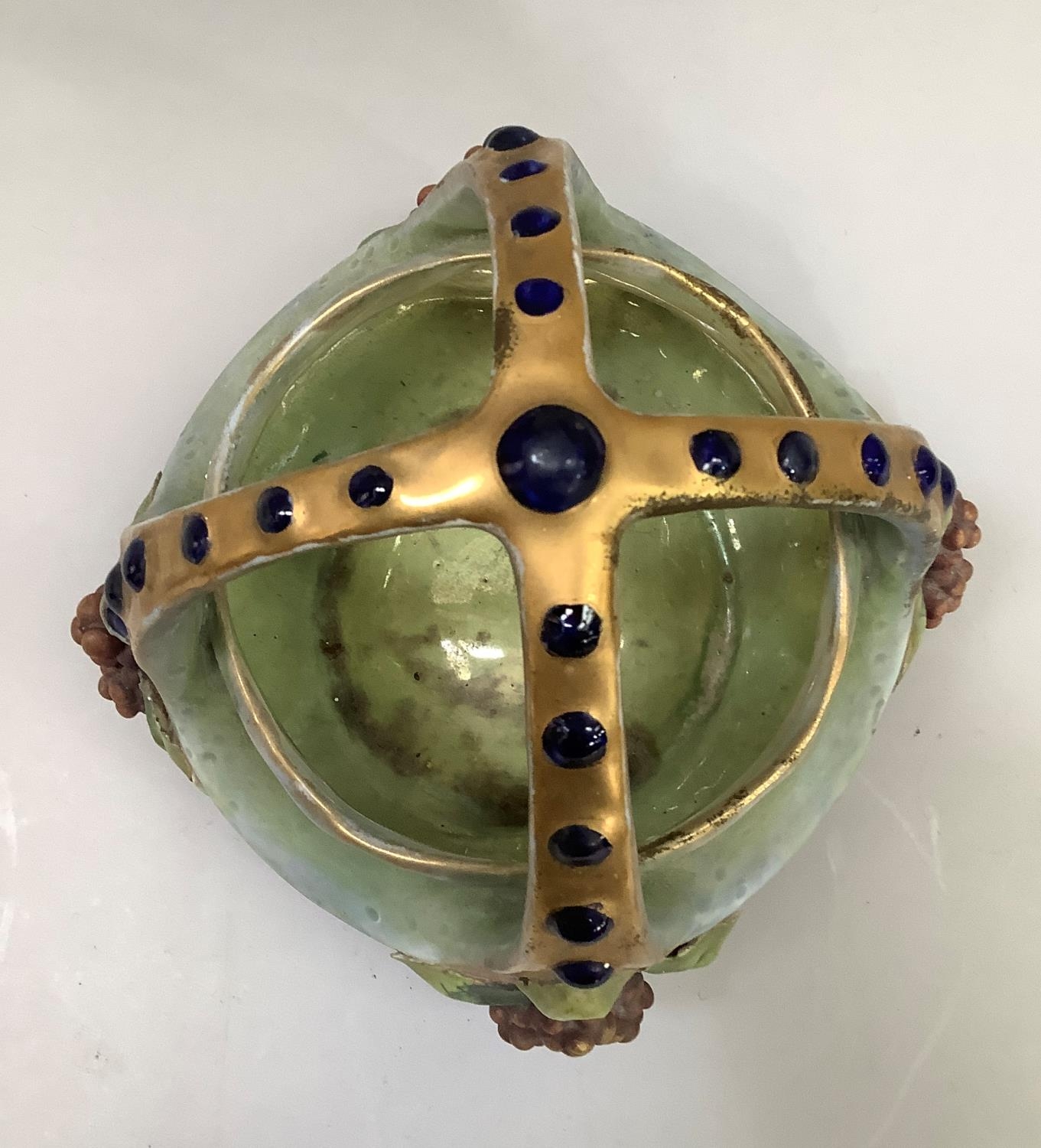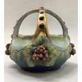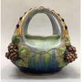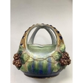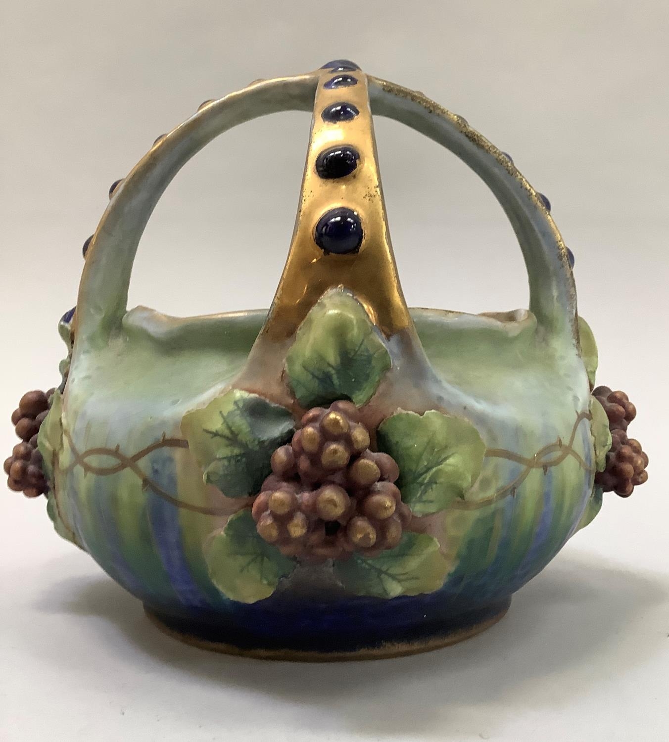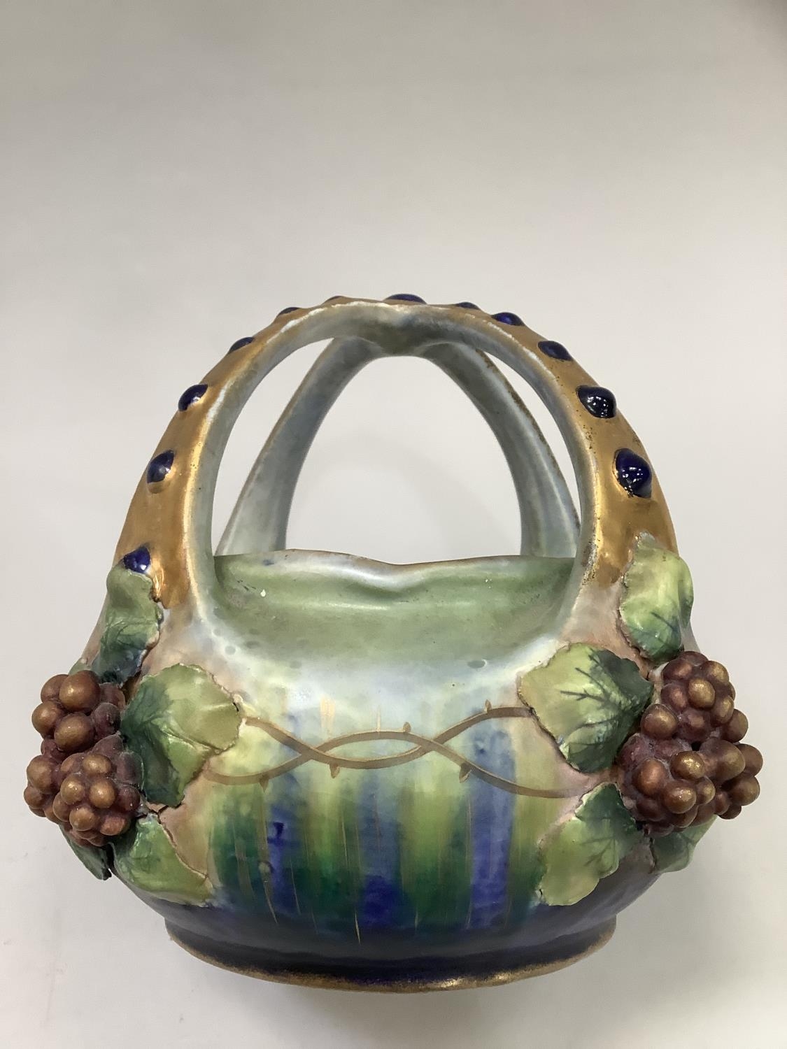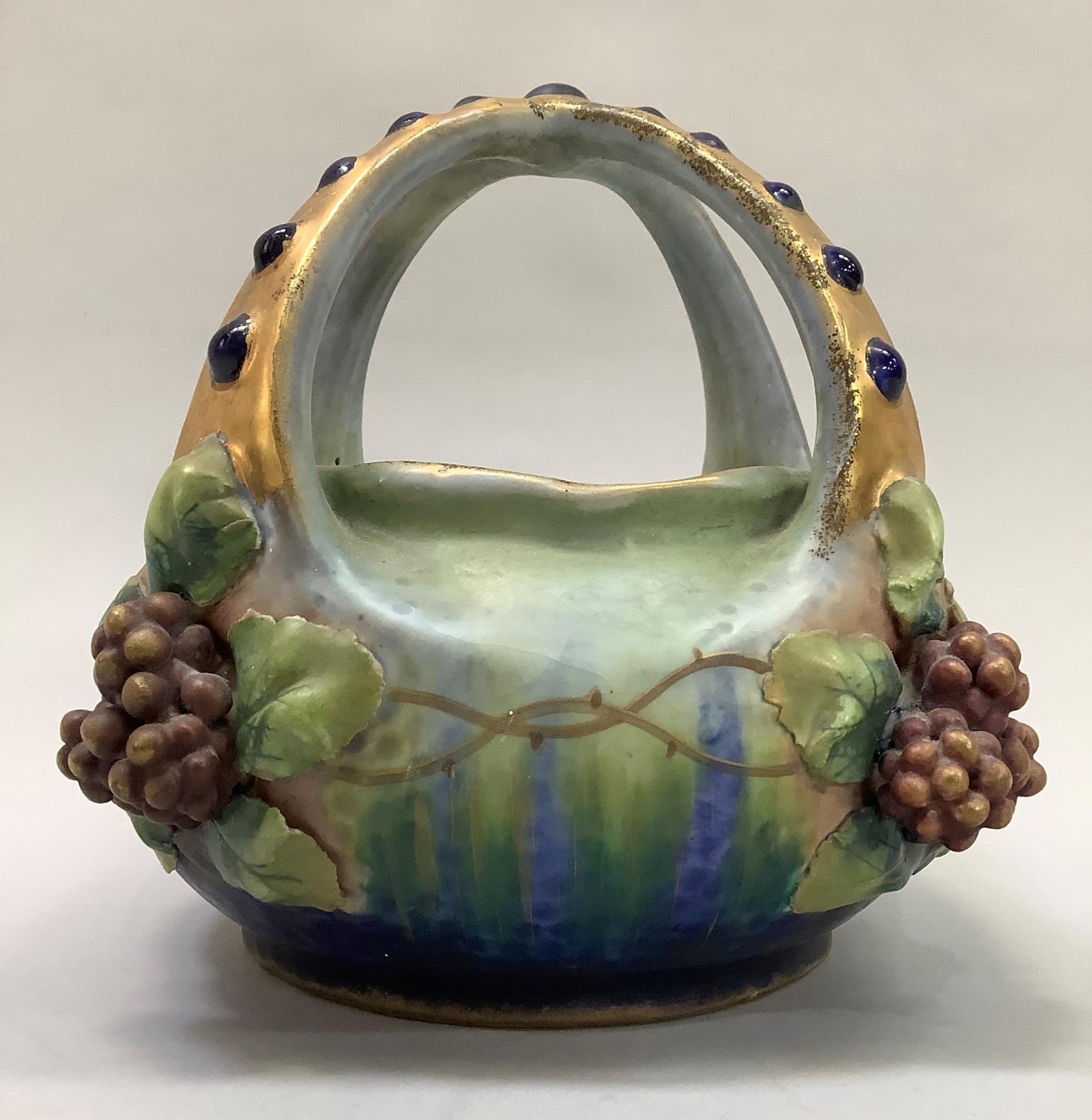 A late 19th/early 20th century amphora basket, the handles formed as a crown gilt with blue glaze duelled bosses, the basket applied with grape vine, impressed mark Amphora Austria and indistinct number, 18.5cm high