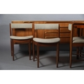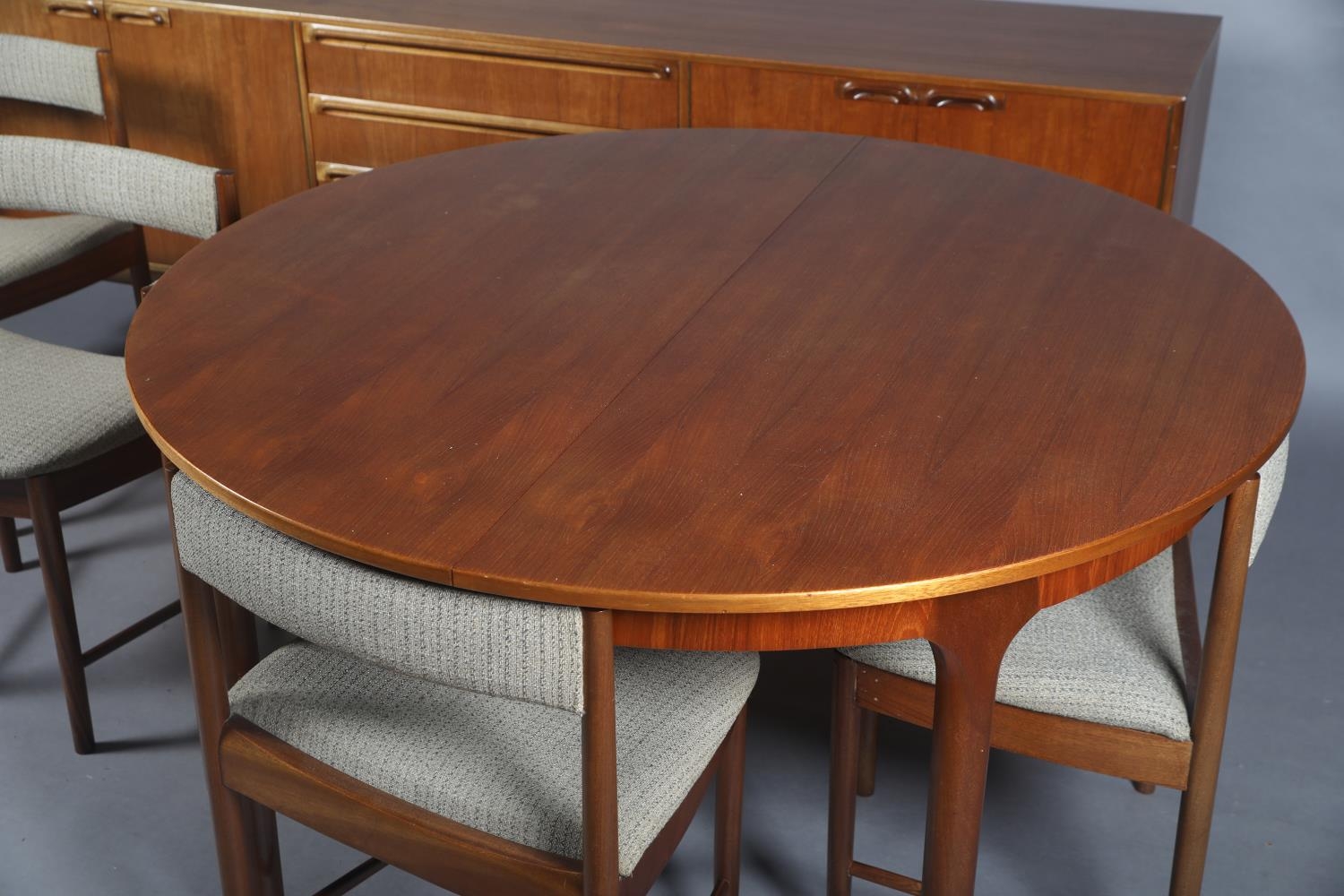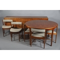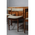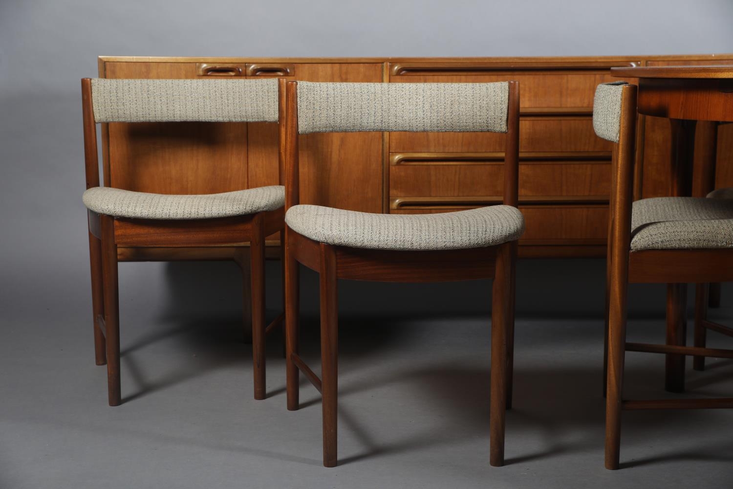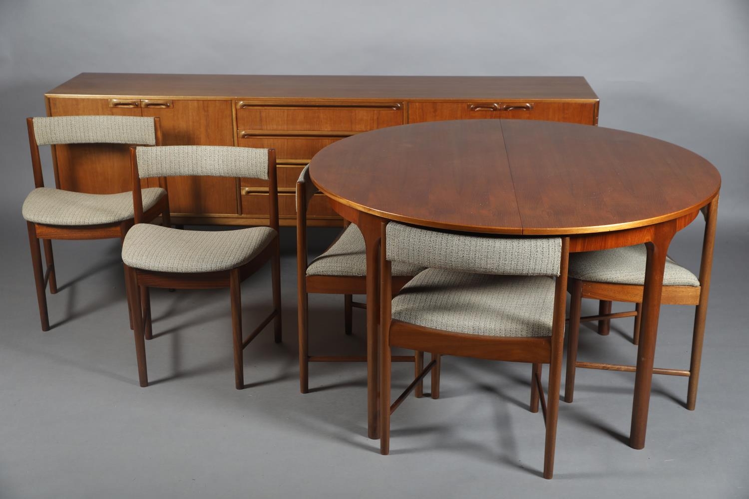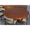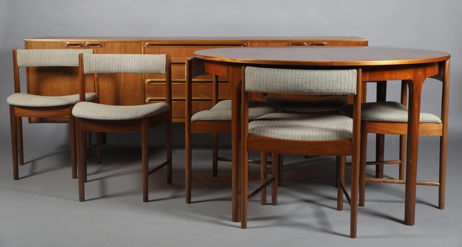 McIntosh of Kirkcaldy, A teak dining suite c1970s, circular extending table with one leaf, 168cm x 122cm, set of six chairs with cloth upholstered seats, sideboard with four drawers to the centre flanked by a two door cupboard to either side, 214cm wide x 46cm deep x 78cm high